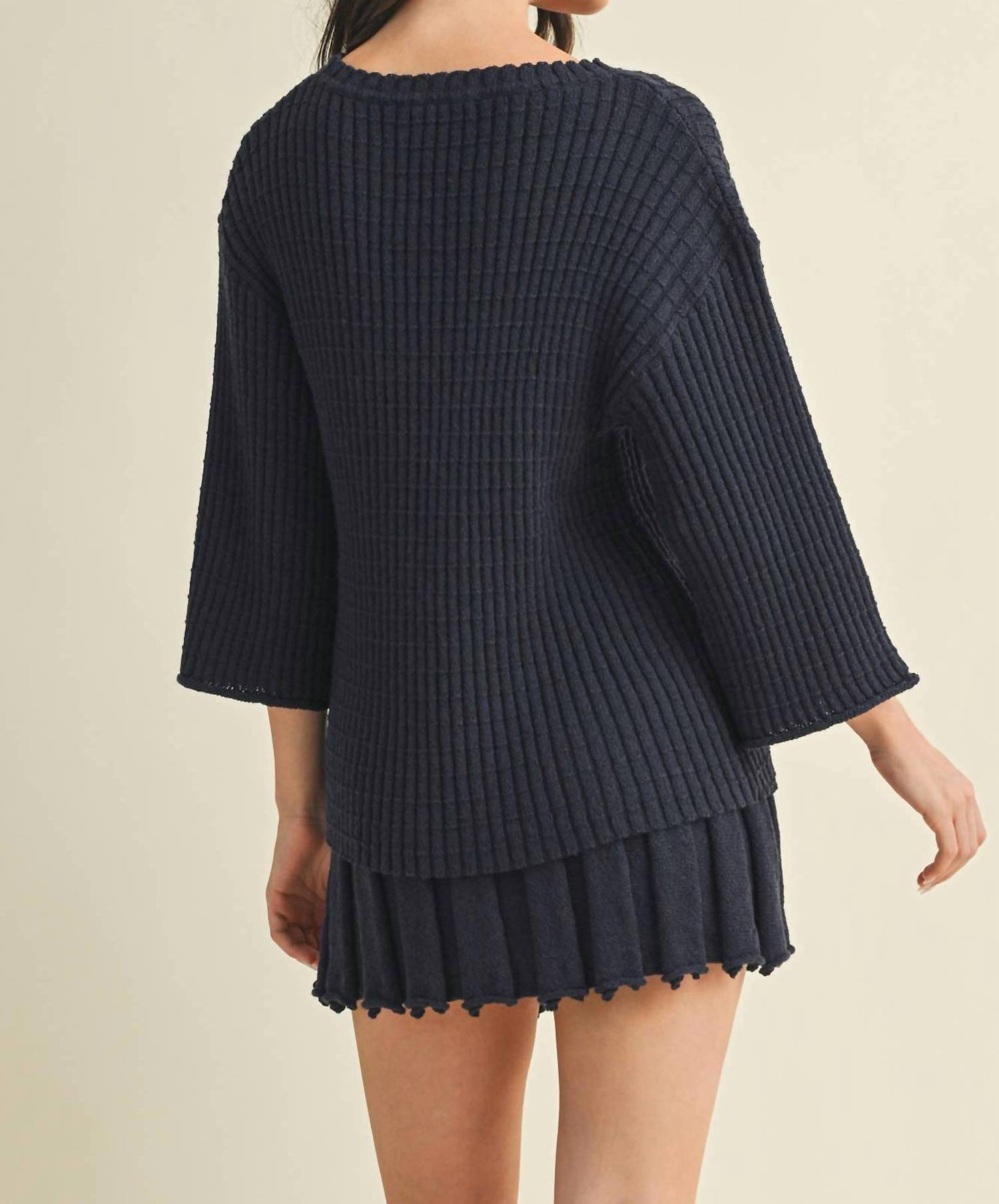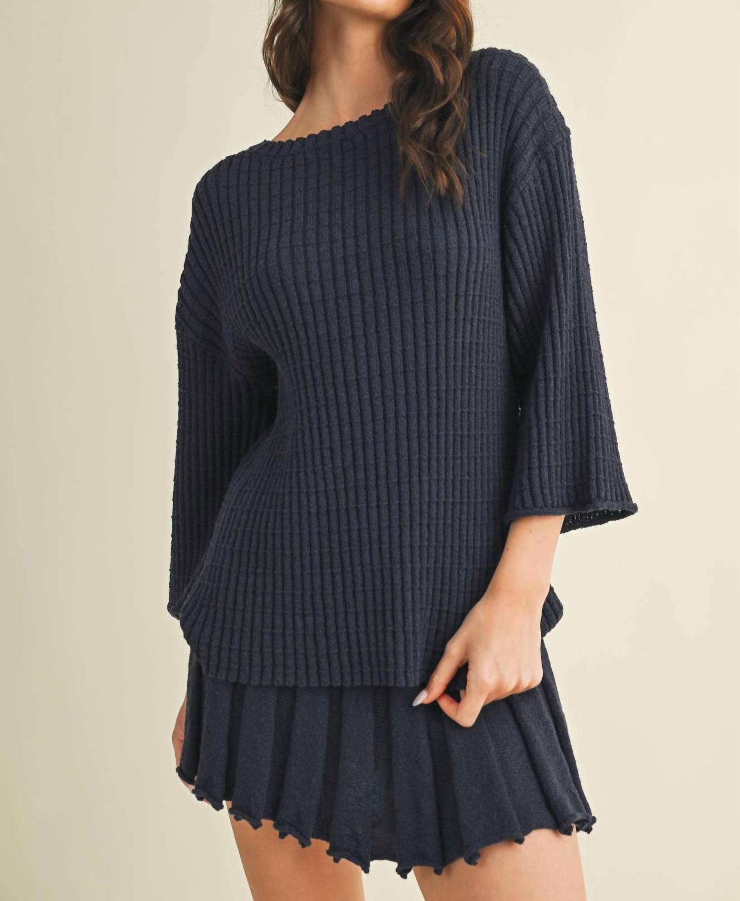 The ultimate go-to sweater, expertly crafted to provide the perfect combination of warmth and style. Its classic design and soft fabric make it a must-have addition to your wardrobe. Introducing the Sabrina Sweater Top by Mustard Seed, crafted in a timeless midnight hue with a vintage-inspired textured knit pattern. This piece features elegant three-quarter sleeves and a classic crewneck, offering a sophisticated look that's perfect for a holiday party. Designed with a convenient pull-on closure for ease of wear. A versatile addition to your fall wardrobe, elevating any ensemble with its refined touch.