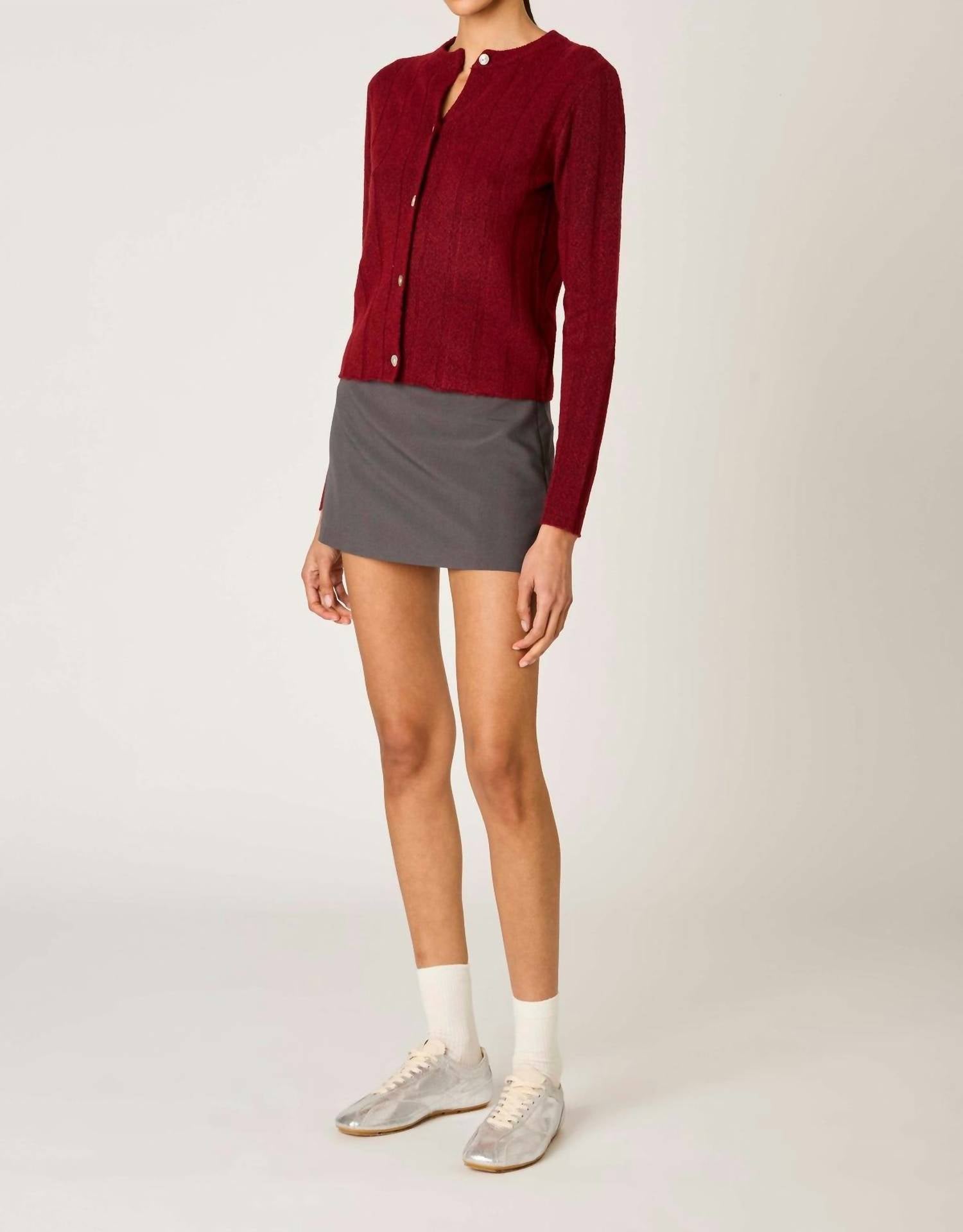 Throw this adorable cardigan over any cami or tank top. Elevate your wardrobe with the Manzanita Knit Cardigan by NIA, a chic layering option in a rich Pinot hue. This cardigan features long sleeves and a textured rib knit for added style, crafted from 22% Acrylic, 74% Polyester, and 4% Spandex. The button closure front offers practicality while maintaining elegance, and it's perfect for a dinner party or fall outings. Care is simple with machine wash instructions, ensuring this piece remains a staple in your preppy collection.