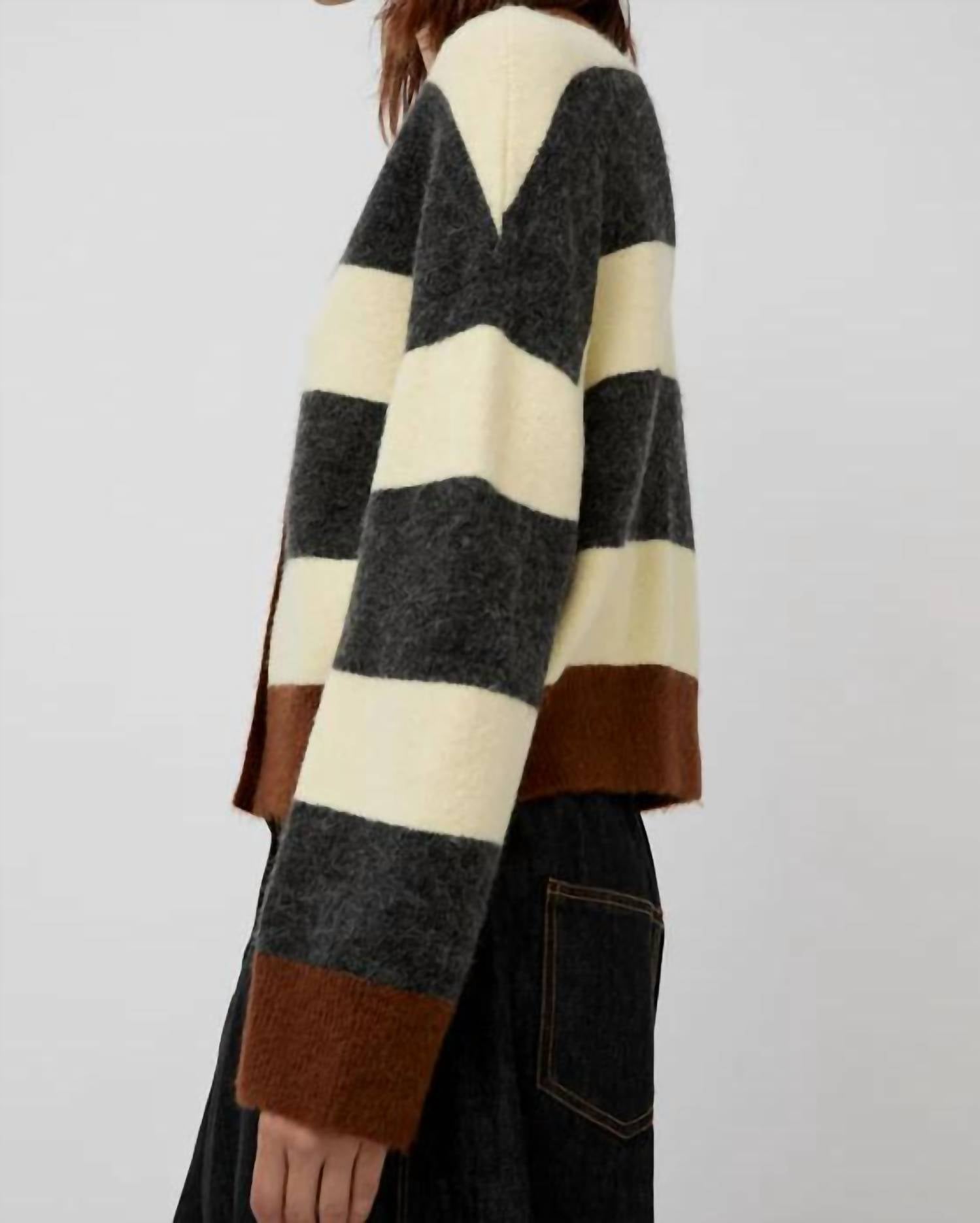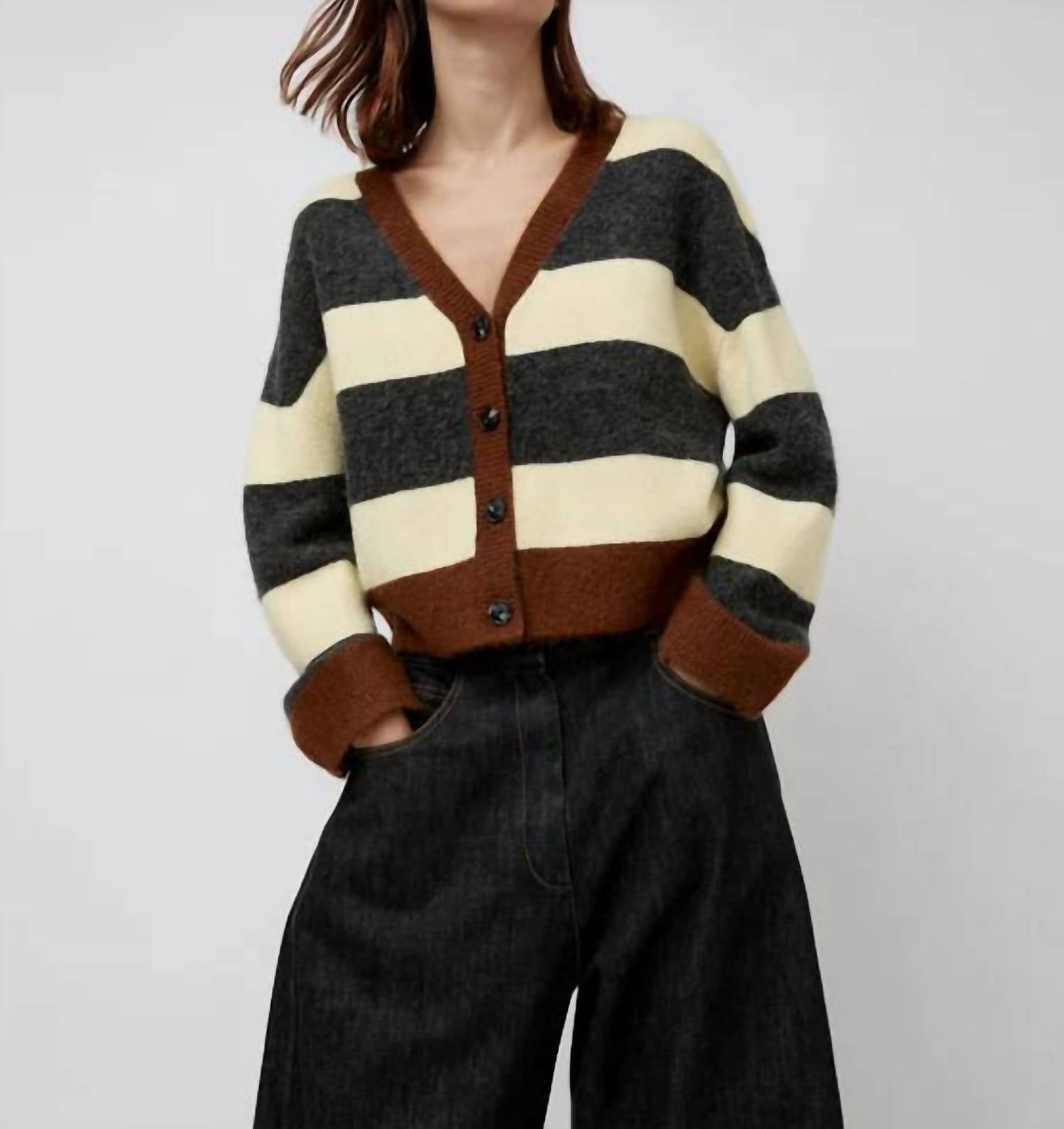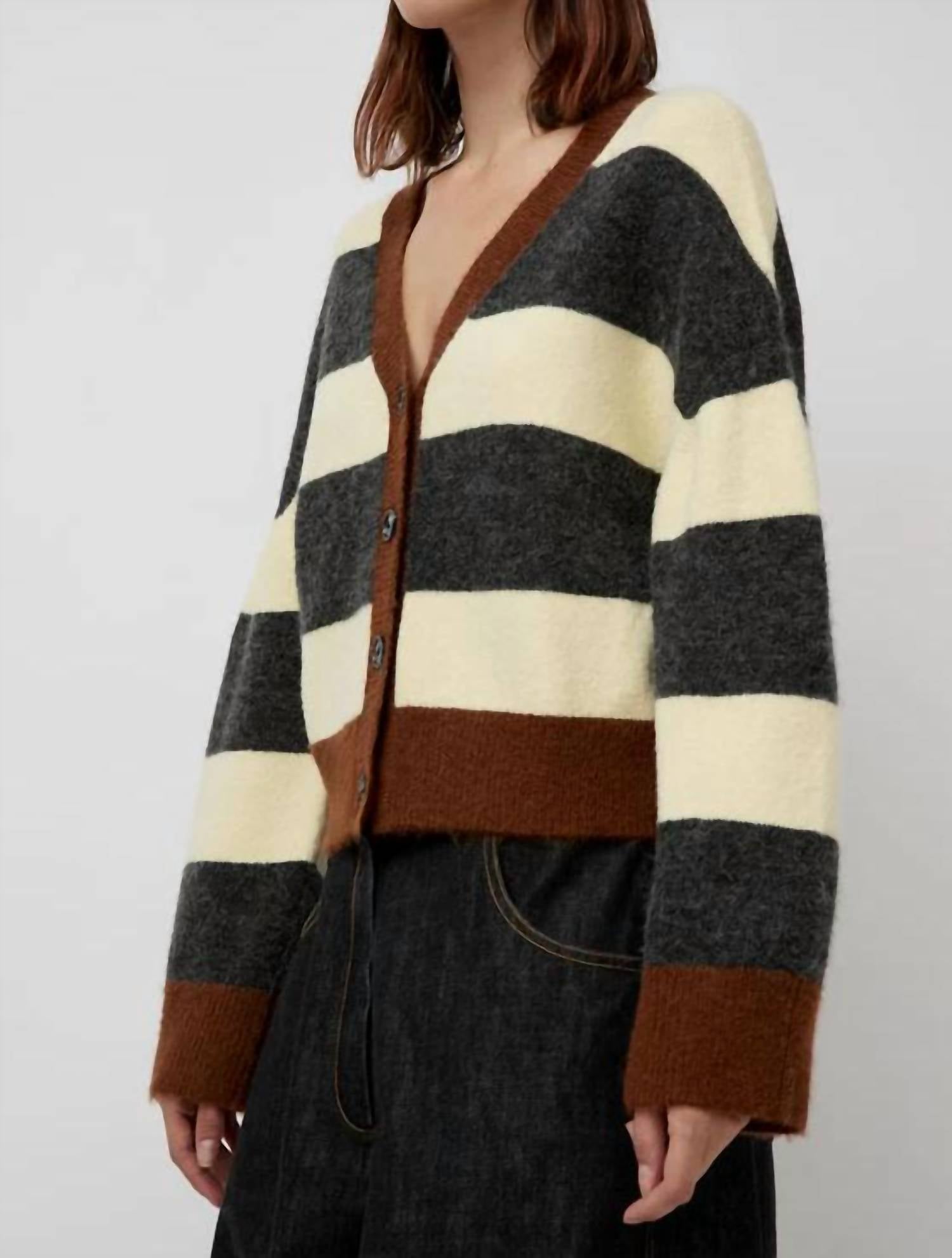A classic fit that works just as good buttoned as it does left open. Introducing the Gabriel Oversized Cardigan by No. 6, a stylish blend of modern and preppy knitwear in a Stripe Combo design. This cardigan features long sleeves and is crafted from a luxurious blend: 48% PC, 26% Nylon, 15% Wool, 8% Alpaca, and 3% Spandex for ultimate comfort. Made in China, it offers a button closure and a v-neckline, perfect for the fall season. For care, it is conveniently machine washable.
