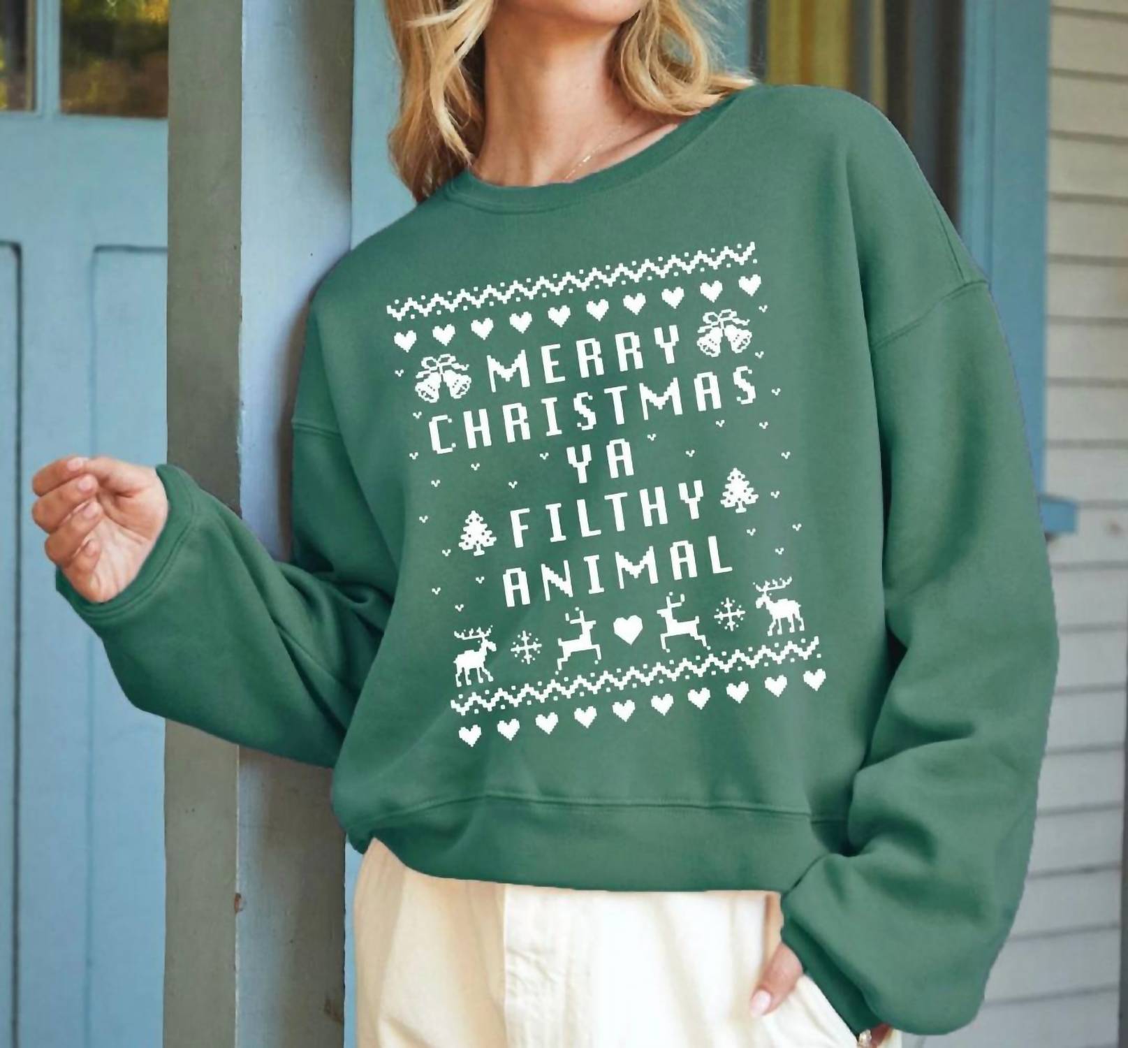 The ultimate go-to sweater, expertly crafted to provide the perfect combination of warmth and style. Its classic design and soft fabric make it a must-have addition to your wardrobe. Celebrate the festive season with the Merry Christmas Ya Filthy Animal Sweatshirt by Oat Collective. This Heather Forest sweatshirt features a playful graphic design on cozy, 100% cotton material. Perfect for winter holiday gatherings, this long-sleeve, crewneck piece offers a pull-on closure for easy wear. Care for your sweatshirt by machine washing it cold inside out and laying it flat to dry, ensuring it remains a laughter-inducing favorite for years to come.