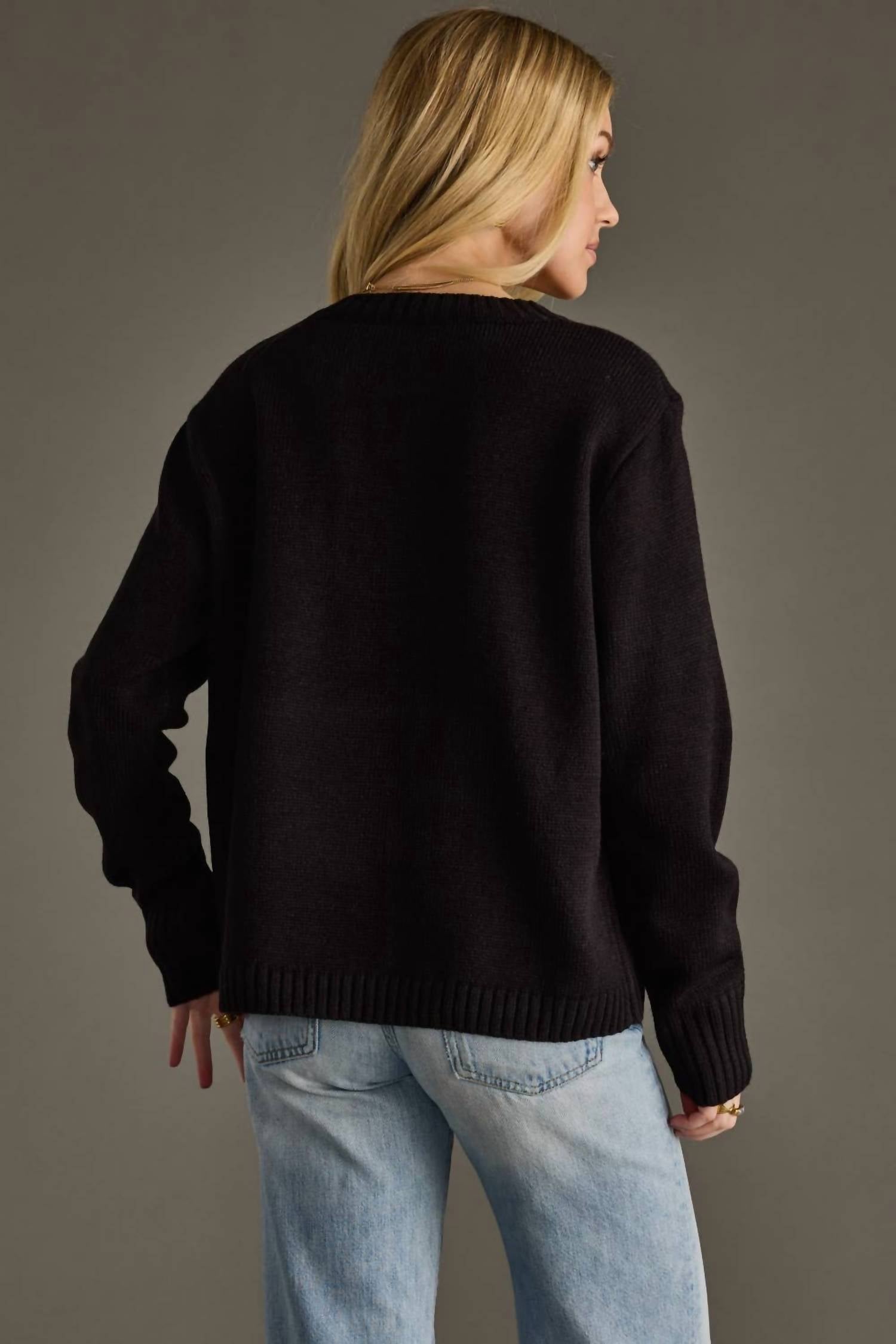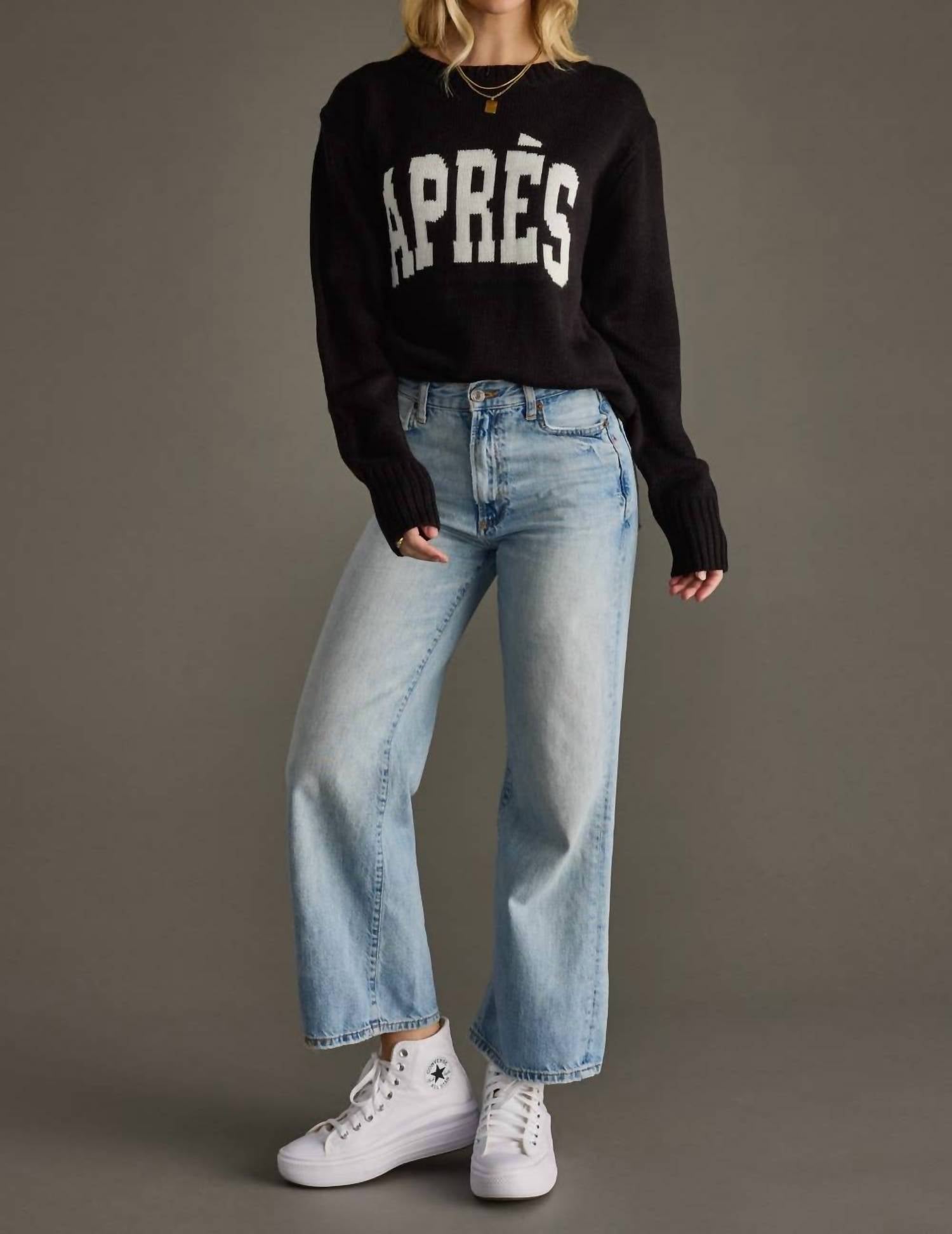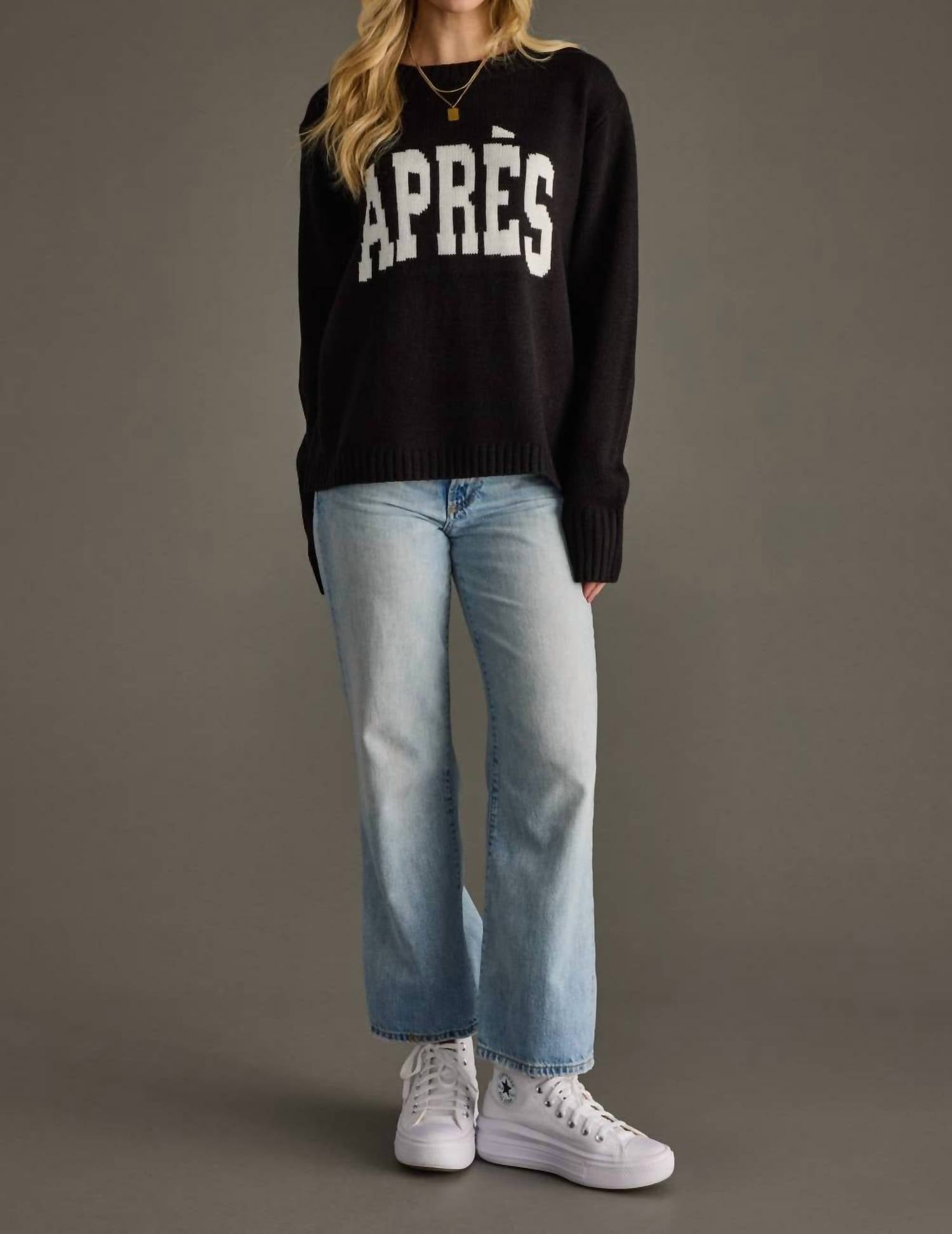 The ultimate go-to sweater, expertly crafted to provide the perfect combination of warmth and style. Its classic design and soft fabric make it a must-have addition to your wardrobe. Elevate your travel wardrobe with the Panache Apres Sweater Top, a chic preppy staple. This black knit sweater features bold white "APRES" text on the front, perfect for a graphic style statement. Crafted from 100% acrylic for comfort and warmth, it is designed with long sleeves and a classic crewneck. Made for easy care, simply machine wash and tumble dry this pull-on sweater.