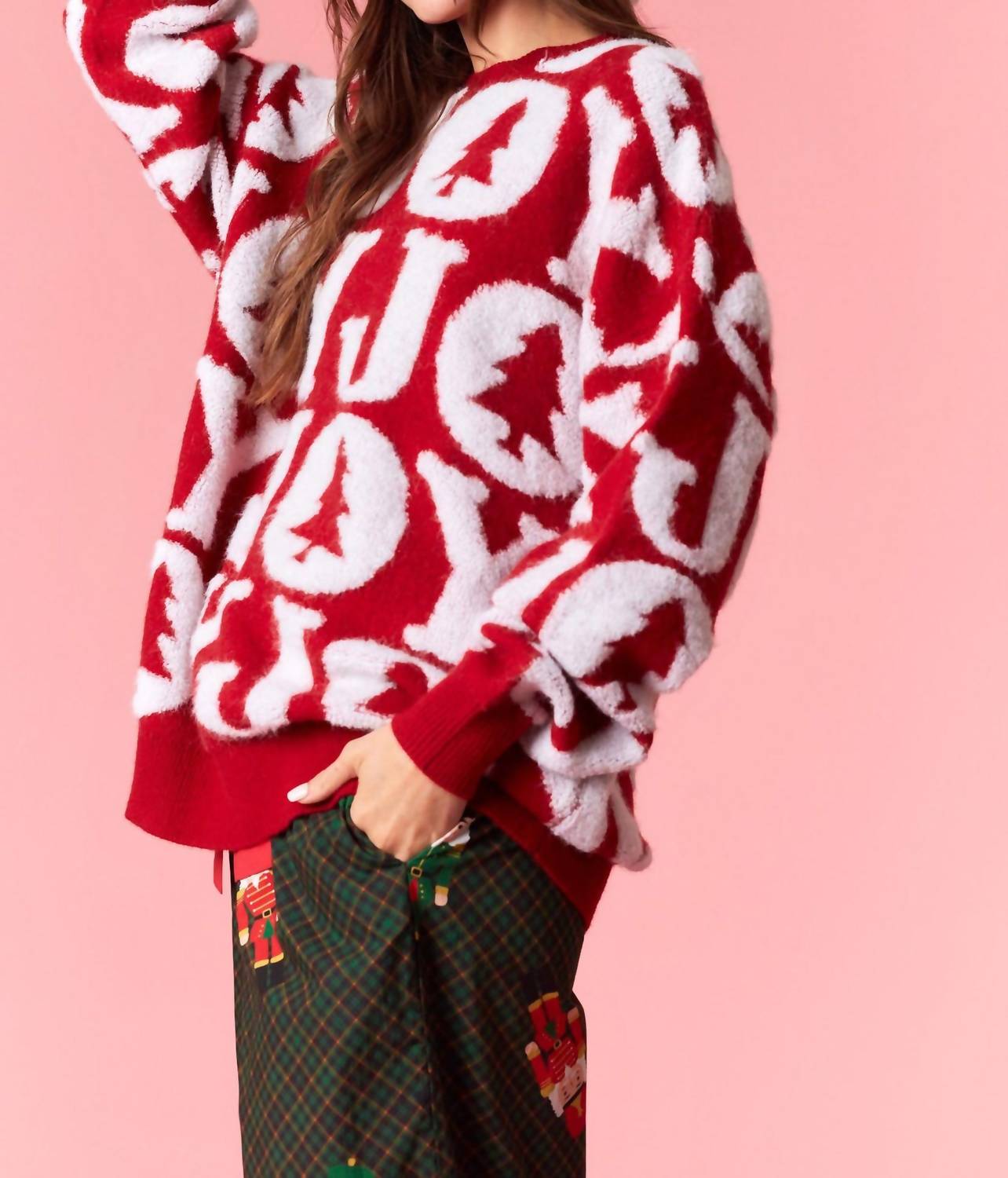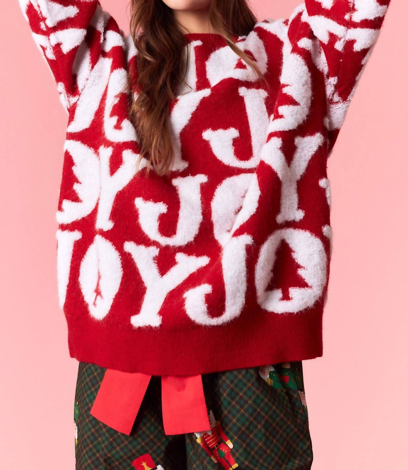 Stay warm and stylish in this versatile and effortlessly cool knitwear staple. Wear it alone or layered, it's the perfect sweater for the season and you'll wish you had it in every color. Introducing the Holiday Joy Sweater by Peach Love, a festive layering piece in vibrant red designed to celebrate the season. This women’s crewneck sweater features playful 3D yarn details that adorn the long sleeves, offering both warmth and charm. Made from a nylon blend composed of 46% Acrylic, 28% Nylon, and 26% Polyester, this pullover is perfect for holiday parties. Designed with a pull-on closure, it is machine washable for easy care.