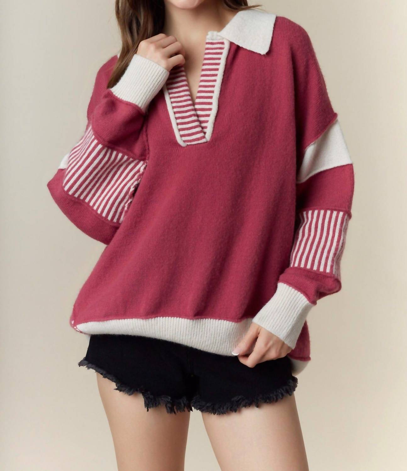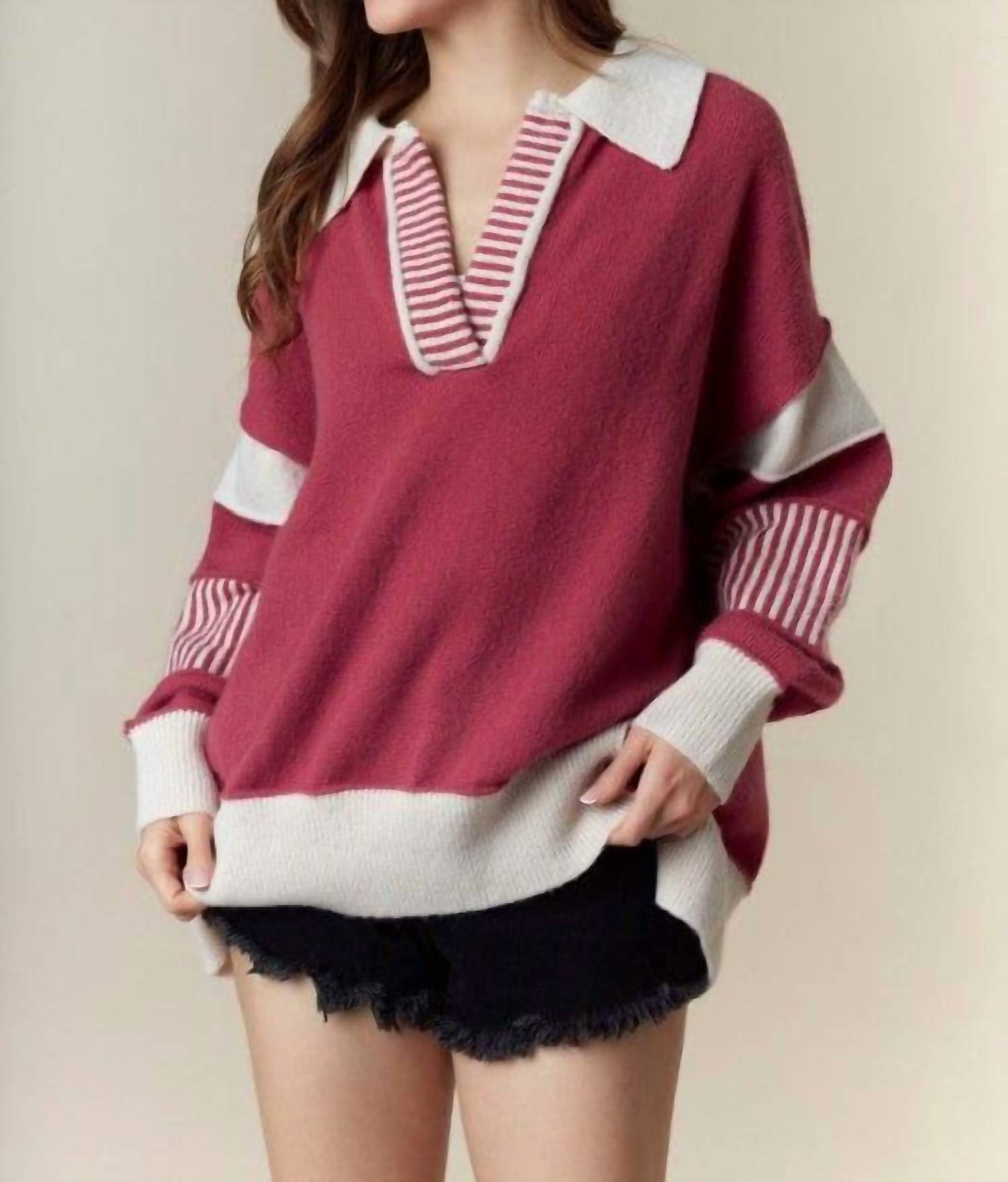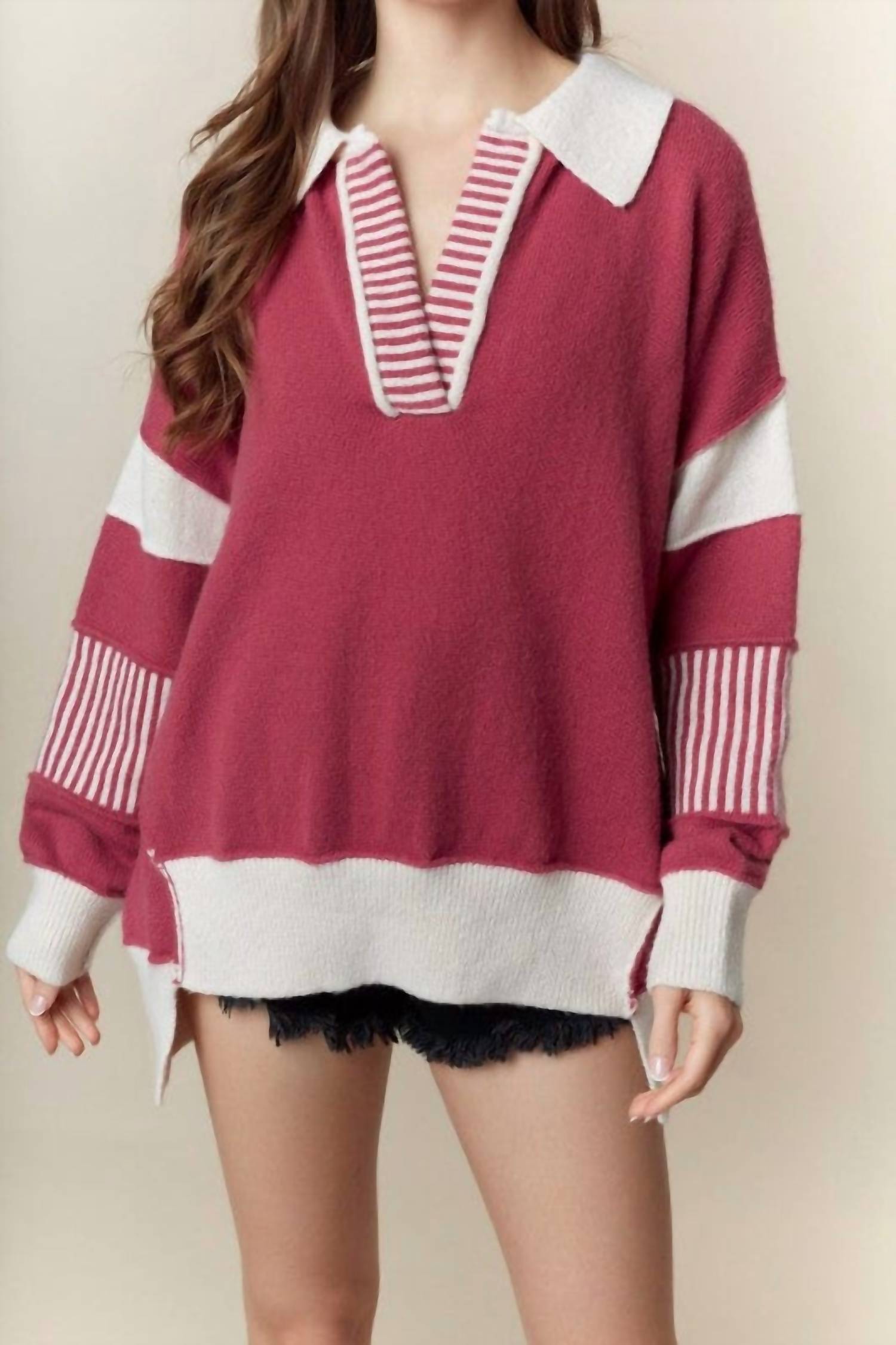 A timeless v-neck sweater that works season after season. Elevate your style with Peach Love's Stevie Oversized Collared Sweater in a vibrant Berry hue. This women's sweater features long sleeves with a distinctive oversized Johnny collar and a trendy textured pattern. Crafted entirely from 100% Polyester, it offers a plush knit feel with an asymmetric high-low cut for a unique silhouette. Made to be both cozy and stylish, it combines a pull-on closure and hand wash instructions, complete with a lay flat to dry method, making it perfect for vacation wear or minimalist summer trends.