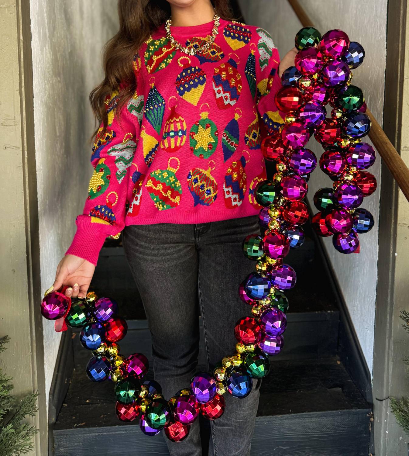 Stay warm and stylish in this versatile and effortlessly cool knitwear staple. Wear it alone or layered, it's the perfect sweater for the season and you'll wish you had it in every color. Introducing the Jeweled Ornament Sweater by Queen of Sparkles, the epitome of festive fun. This Pink Multi sweater boasts long sleeves and a graphic pattern bursting with sequins and colorful jeweled ornaments. Made for women, it is designed with a cozy crewneck and a convenient pull-on closure, perfect for Christmas and holiday parties. Care for it effortlessly with machine wash instructions, ensuring this playful piece remains a winter favorite.