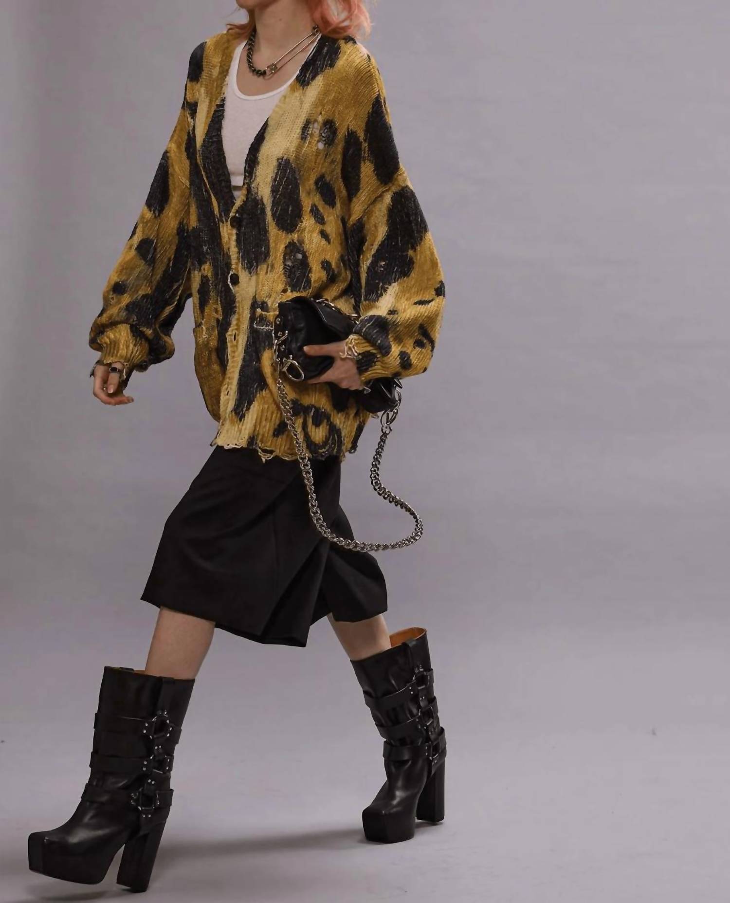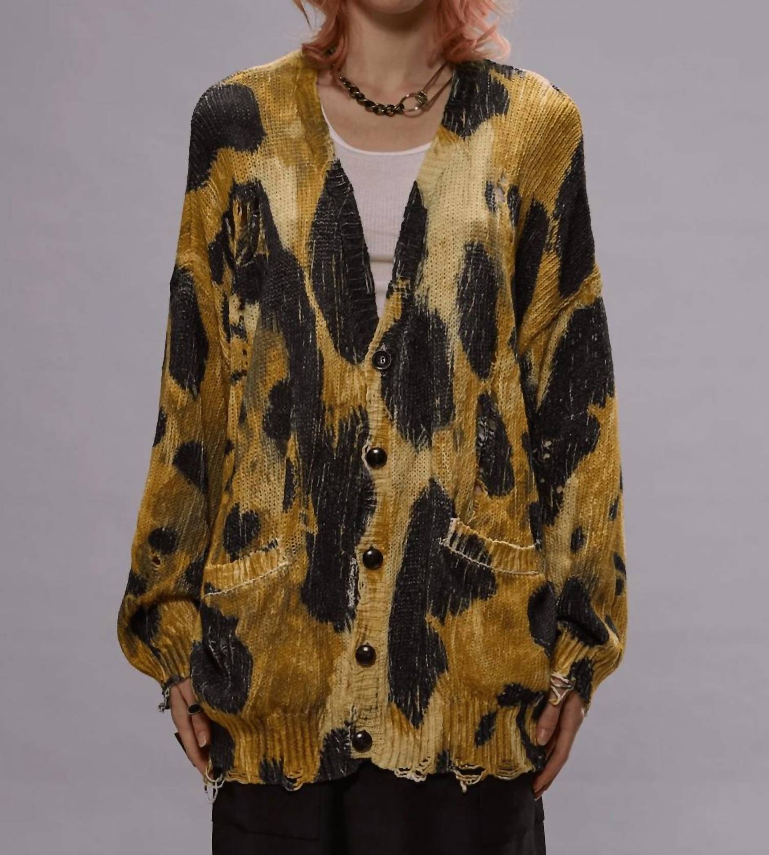 Embrace bold style with the R13 Printed Oversized Sweater Cardigan, a statement piece in a striking leopard design. This women's cardigan features long sleeves and a comfortable V-neckline, crafted entirely from 100% cotton for softness and breathability. Designed with a button closure and convenient pockets, it offers functionality alongside fashion. Perfect for layering, this leopard print cardigan is a stylish choice for various occasions.