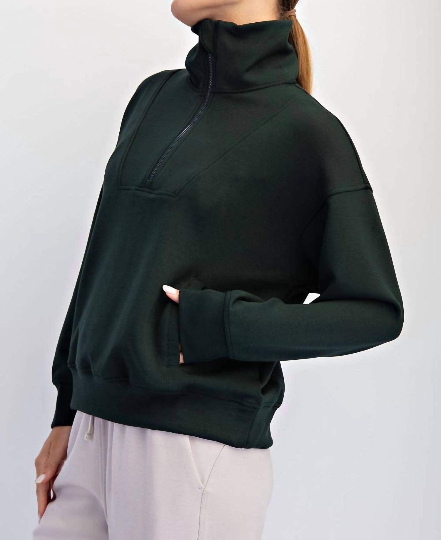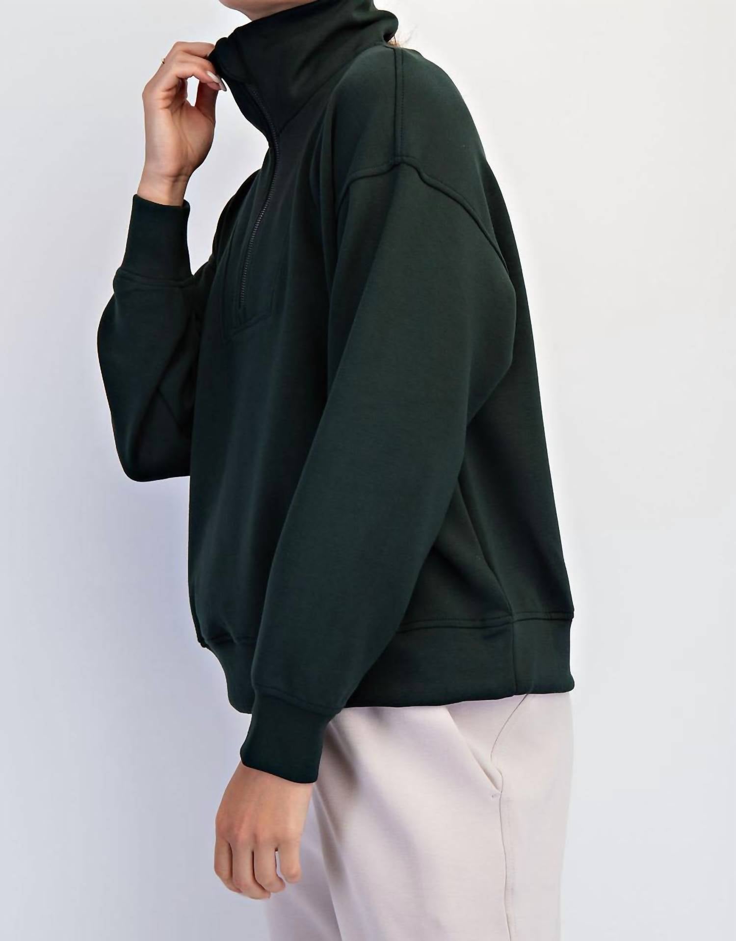 A classic staple that every closet needs. Elevate your style this fall with the RAE MODE Modal Scuba Ribbed Mock Neck Pullover in a striking green hue. Designed for women, this minimalist pullover features a mock neck and long sleeves, perfectly balancing comfort with contemporary style. Made from modal, it includes a zip closure and convenient pockets, ideal for travel and holiday outings. Care instructions: hand wash and lay flat to dry.