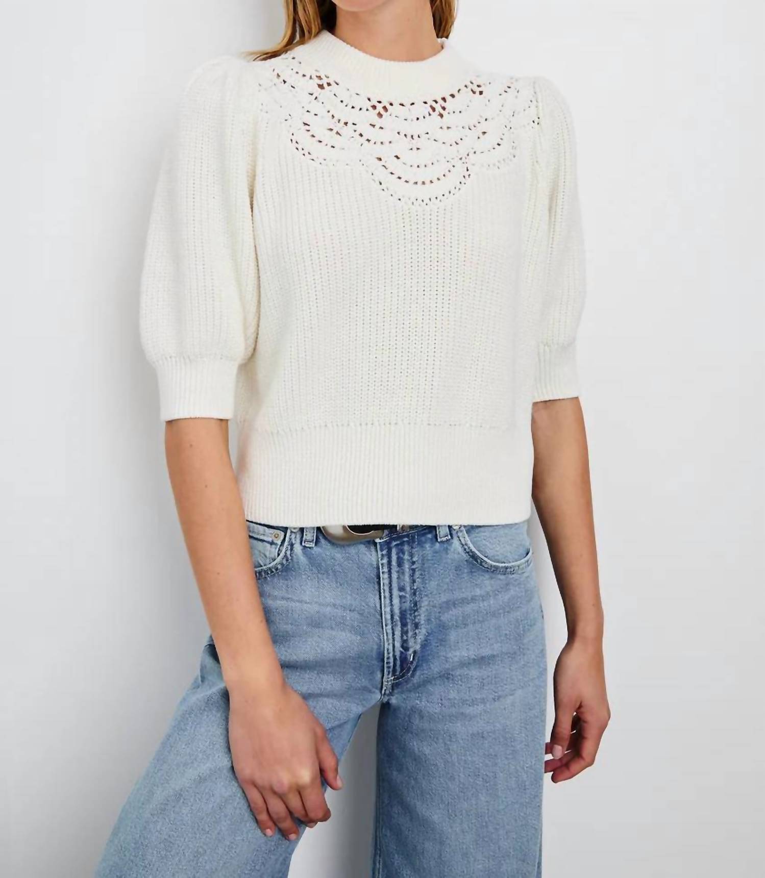 The ultimate go-to sweater, expertly crafted to provide the perfect combination of warmth and style. Its classic design and soft fabric make it a must-have addition to your wardrobe. Introducing the Steph Sweater by Rails, the perfect fusion of blouse, sweater, and tee in a cotton knit design. This white staple boasts a crew neck with crochet detailing, adding a textured touch to its minimalist style. Crafted in a short sleeve, 20-inch length, it offers a pull-on closure for effortless wearing. Ideal for a holiday party, this mid-weight piece requires hand washing and should be laid flat to dry. 100% Cotton.