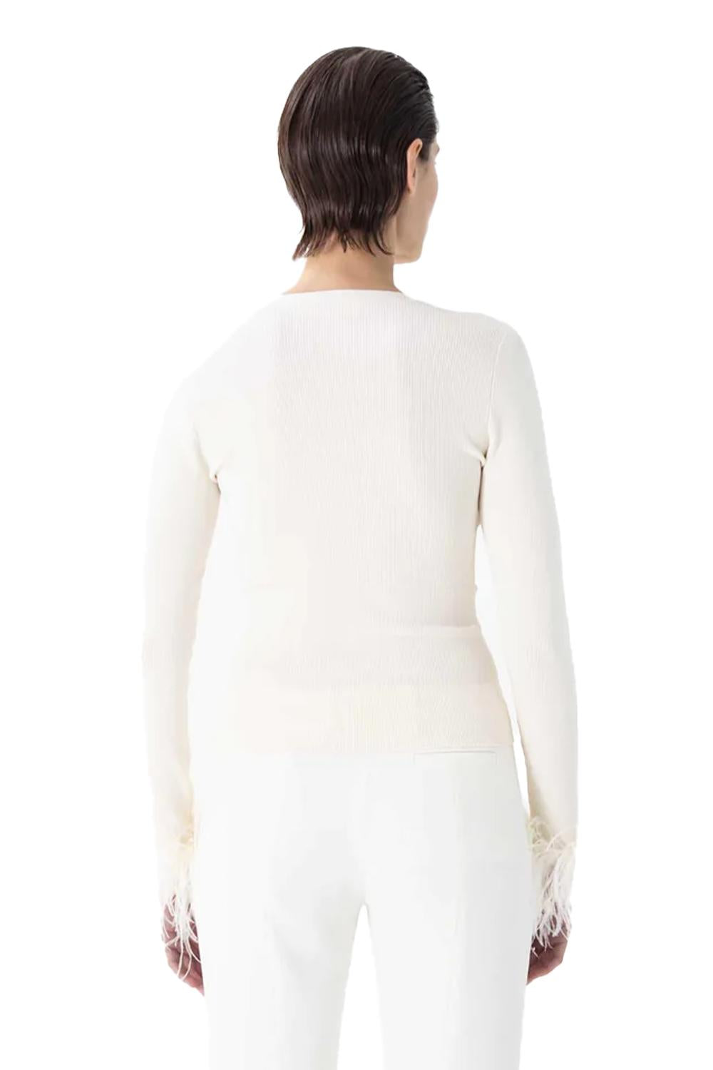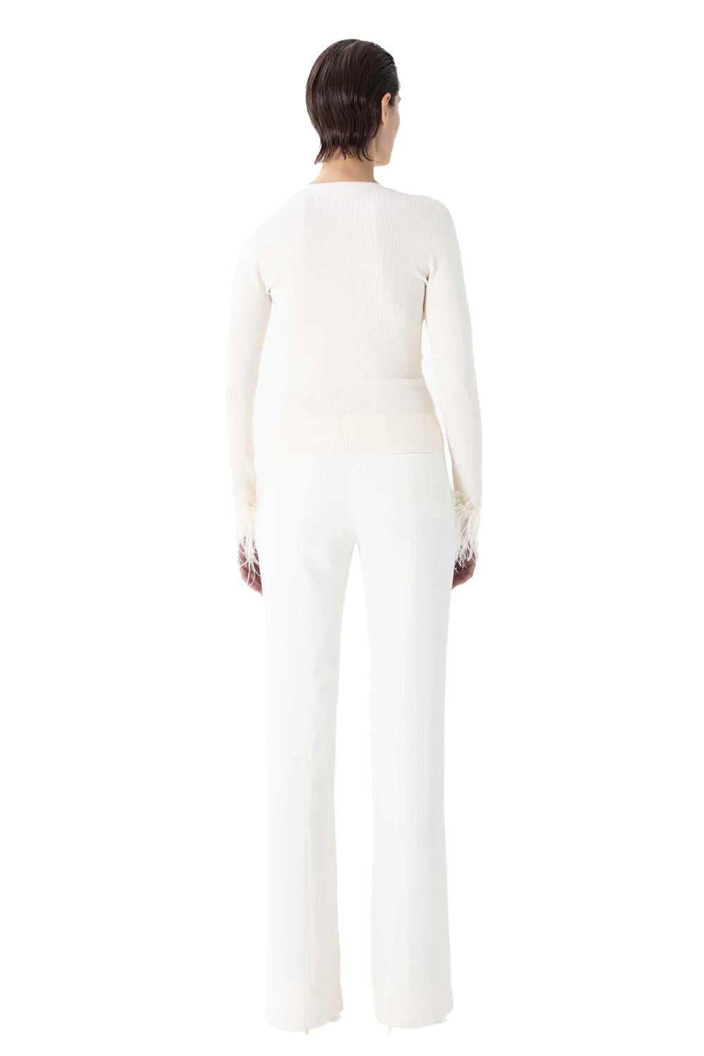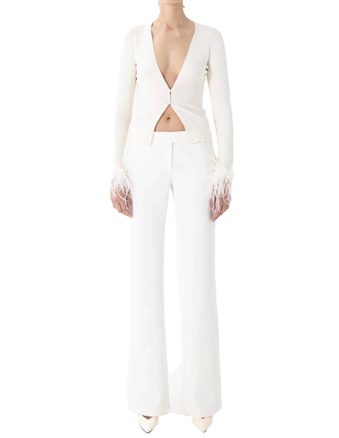 A classic fit that works just as good buttoned as it does left open. Introducing the Aiden Knit Cardigan by Ronny Kobo, an exquisite addition to your wardrobe with long sleeves and featuring a beautiful pearl color. Crafted from viscose, this knit cardigan provides a luxurious and cozy feel adorned with feather trim on the sleeves. It boasts a classic V-neck design and a convenient front button closure, allowing for versatile styling.