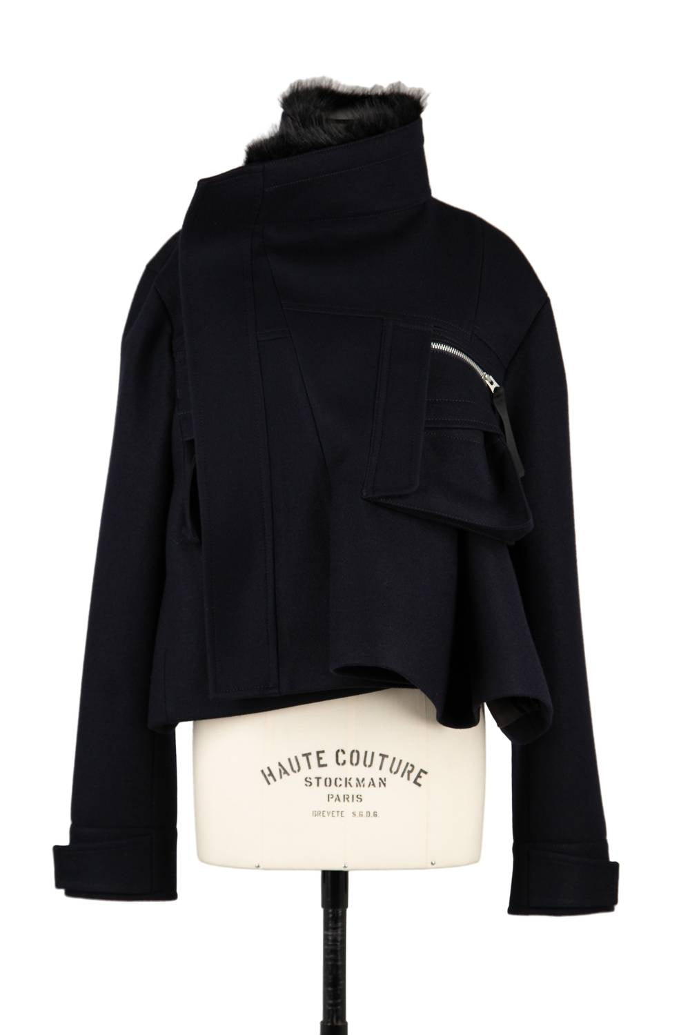 Layer under your favorite sweater or wear tucked into jeans for a perfectly polished winter look. Introducing the Wool Melton Blouson by Sacai, a sophisticated piece for the modern woman in a chic navy hue. This blouson features long sleeves with snap button cuffs and a turtleneck trimmed with faux fur for added elegance. Crafted from 100% wool with a lining of 100% polyester, it includes a chest zip pocket and a concealed front closure. Designed for easy care, this item requires dry cleaning to maintain its pristine look.