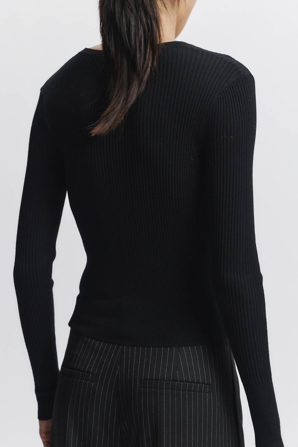 You'll be reaching for this comfy and classic v-neck sweater all season long. Embrace timeless elegance with the Braylon Rib Cardigan Sweater by Saint Art, crafted in luxurious 100% Fine Gauge Merino Wool. This black, long sleeve cardigan features a stylish V-neck and textured ribbed merino fabrication for a minimalist appeal. It offers a classic button closure and fits true to size, making it perfect for your fall wardrobe. For care, hand wash or opt for a dry clean to maintain its quality and softness.