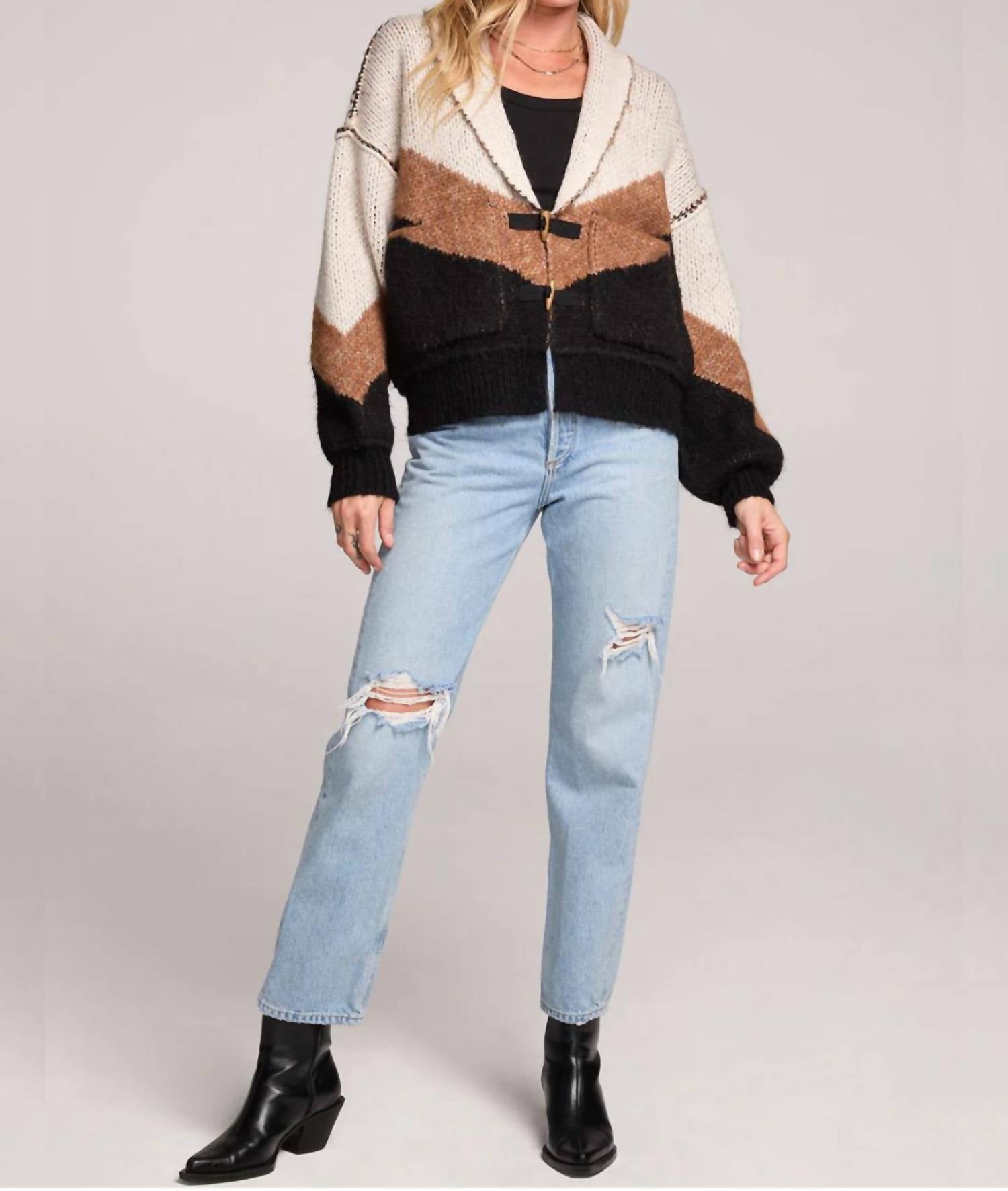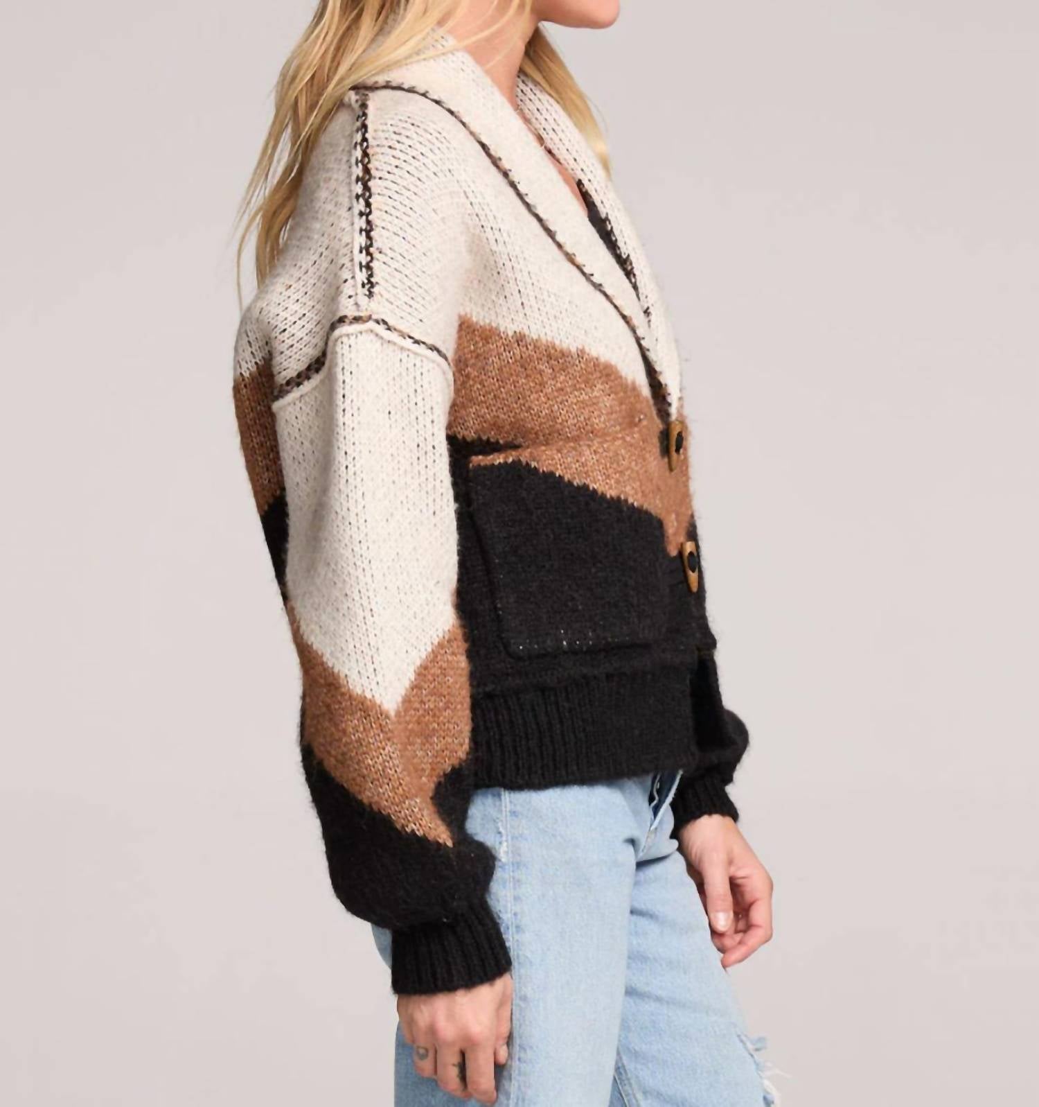 You'll be reaching for this comfy and classic v-neck sweater all season long. Introducing the Saltwater Luxe Cain Color Block Sweater, a chic V-neck cardigan perfect for New Year's Eve outings and beyond. Featuring long sleeves and crafted from a luxurious blend of 73% Polyester, 10% Acrylic, 10% Nylon, and 7% Wool, this midweight knit offers cozy comfort with a trendy boho flair. The stylish toggle closure and patch pockets enhance its wearable design, while the bold patterned collar keeps you fashion-forward for fall travel. Care for this elegant piece is simple: hand wash cold and lay flat to dry, maintaining its beautiful, relaxed silhouette for everyday elegance.