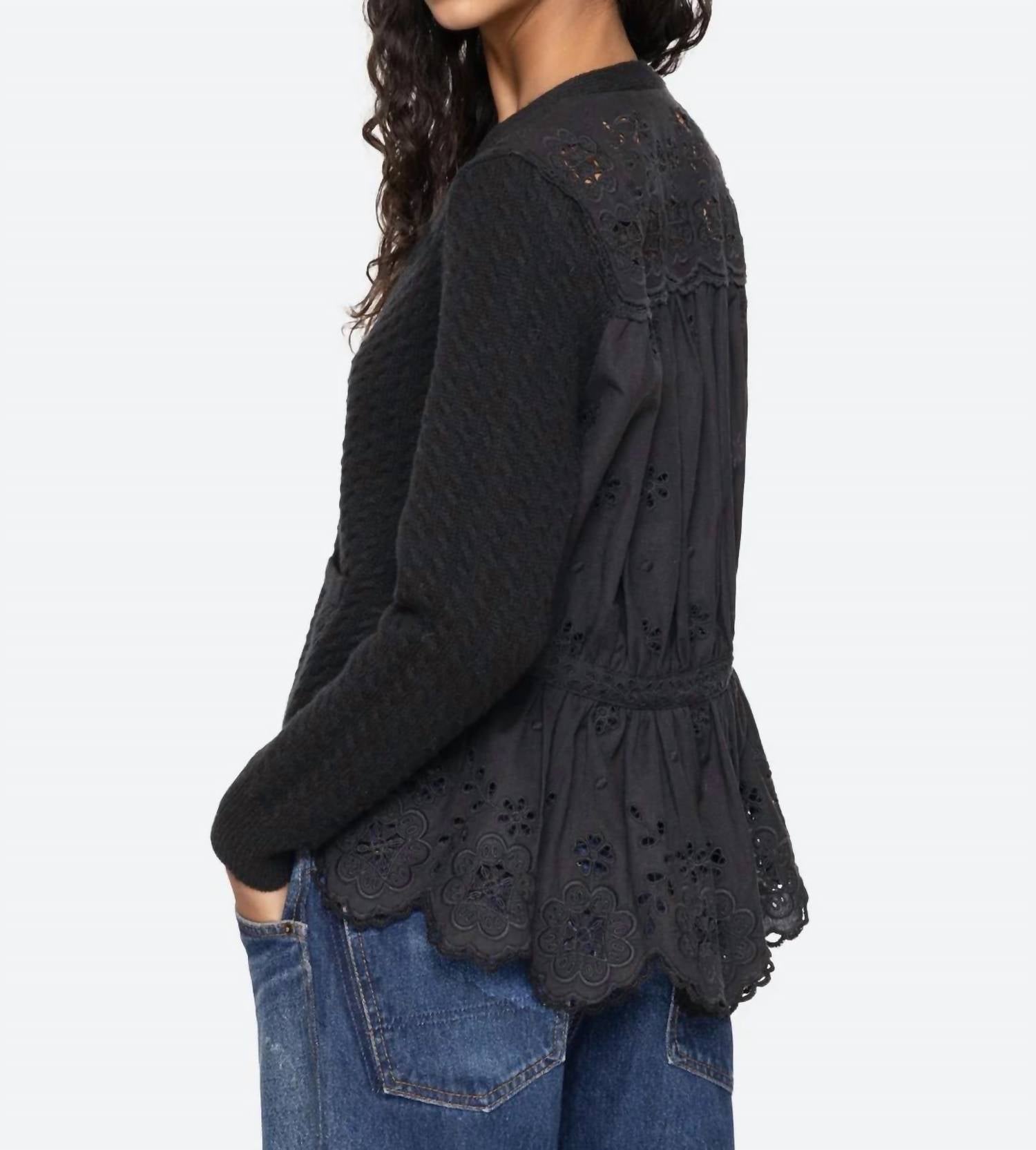 A classic fit that works just as good buttoned as it does left open. Introducing the Shanna Cardigan by SEA, a chic addition to your fall wardrobe ideal for dinner parties. This cardigan, crafted from a merino blend, features long sleeves and a sophisticated V-neck design in timeless black. Its lace back composition includes 30% linen and 70% cotton, with a button closure for an elegant finish. Care instructions specify dry clean only to maintain its fine quality.