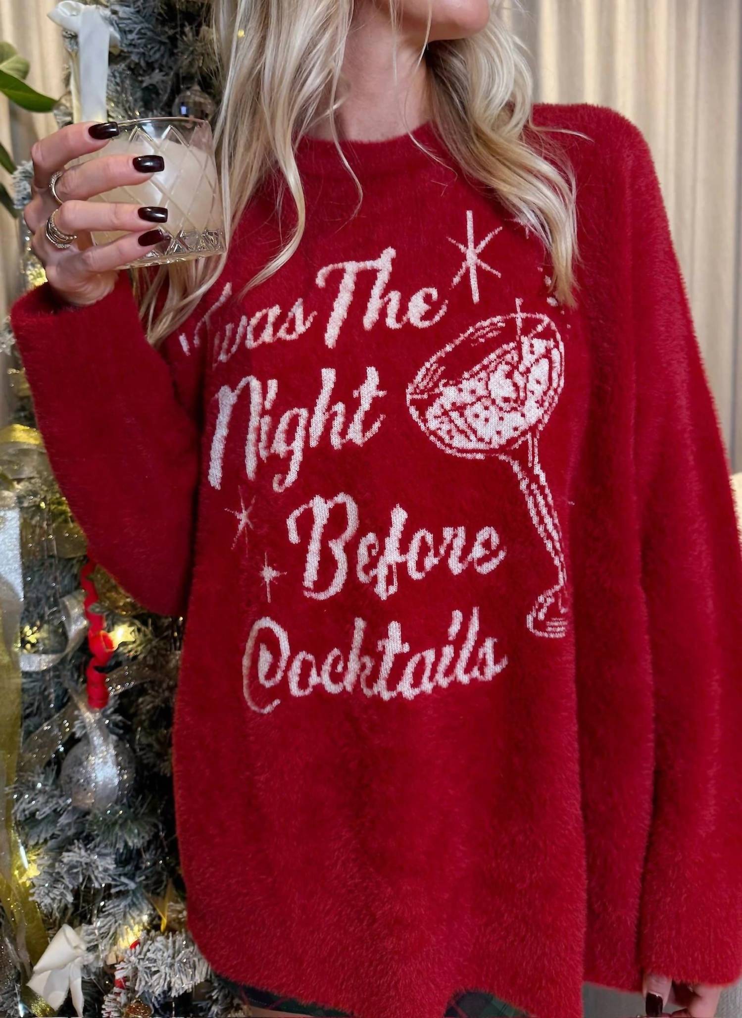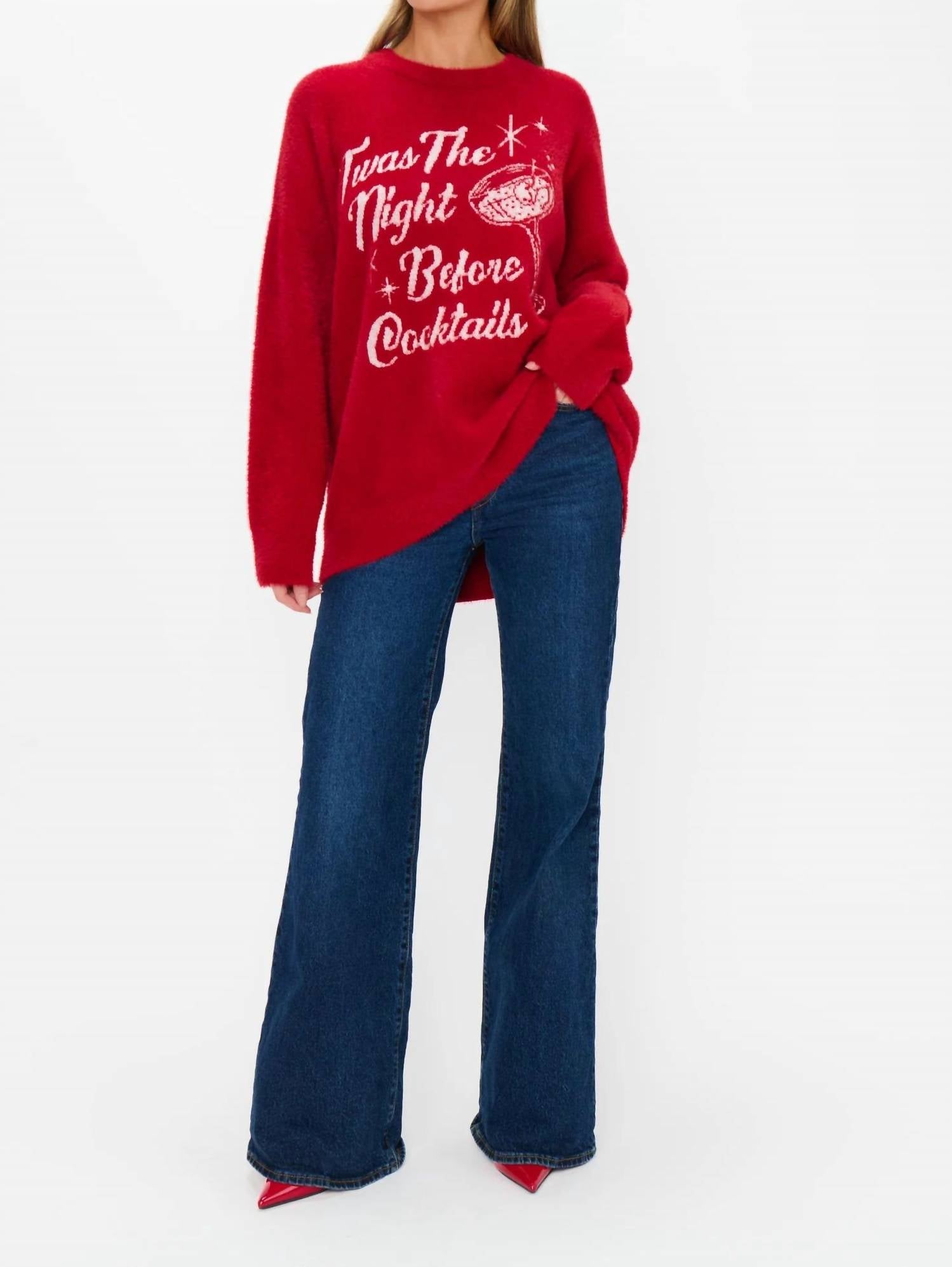 Stay warm and stylish in this versatile and effortlessly cool knitwear staple. Wear it alone or layered, it's the perfect sweater for the season and you'll wish you had it in every color. Get into the festive spirit with the "Twas The Night Knit Classic Crewneck Sweater" by Show Me Your Mumu, perfect for holiday gatherings. This sweater, in cheerful red and crafted from a blend of 65% Nylon and 35% Acrylic, features a cheeky holiday graphic that brings a mix of festive fun to your wardrobe. With long sleeves and an easy pull-on closure, it's designed for both comfort and style, pairing effortlessly with anything from denim to a cute mini skirt. Care for this cozy piece by simple machine washing, making it a holiday favorite for seasons to come.