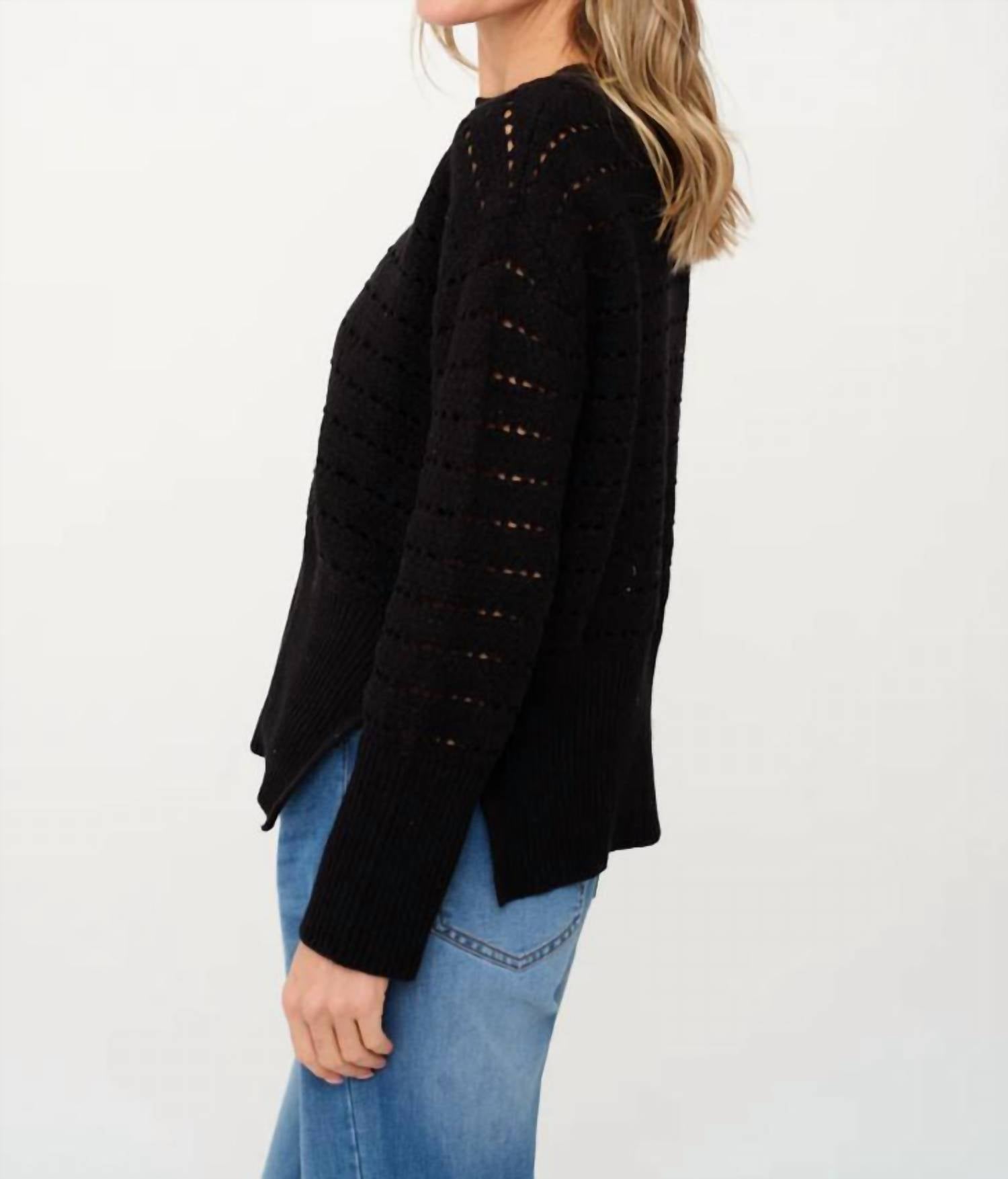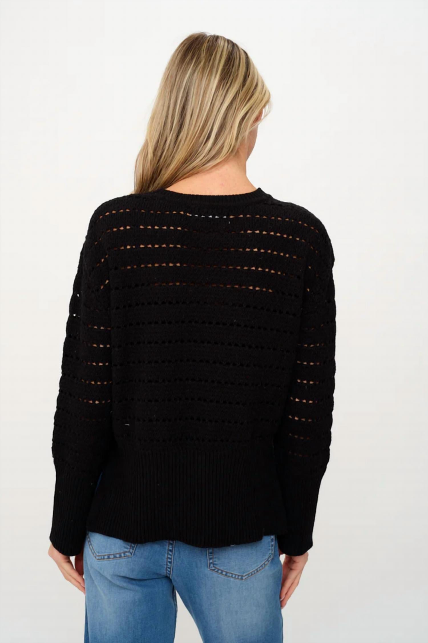 Experience the perfect blend of comfort and style with this trendy crew neck sweater, designed to effortlessly elevate your wardrobe. Pair it with your favorite denim and loafers for the perfect look. Introducing the Jaden Crochet Sweater by SIX/FIFTY, a perfect blend of style and comfort in classic black. This women's sweater features long sleeves and a textured crochet design with a crewneck for a timeless look. Made from 100% soft cotton with a convenient pull-on closure. Care: Hand wash and line dry to maintain its shape and texture.