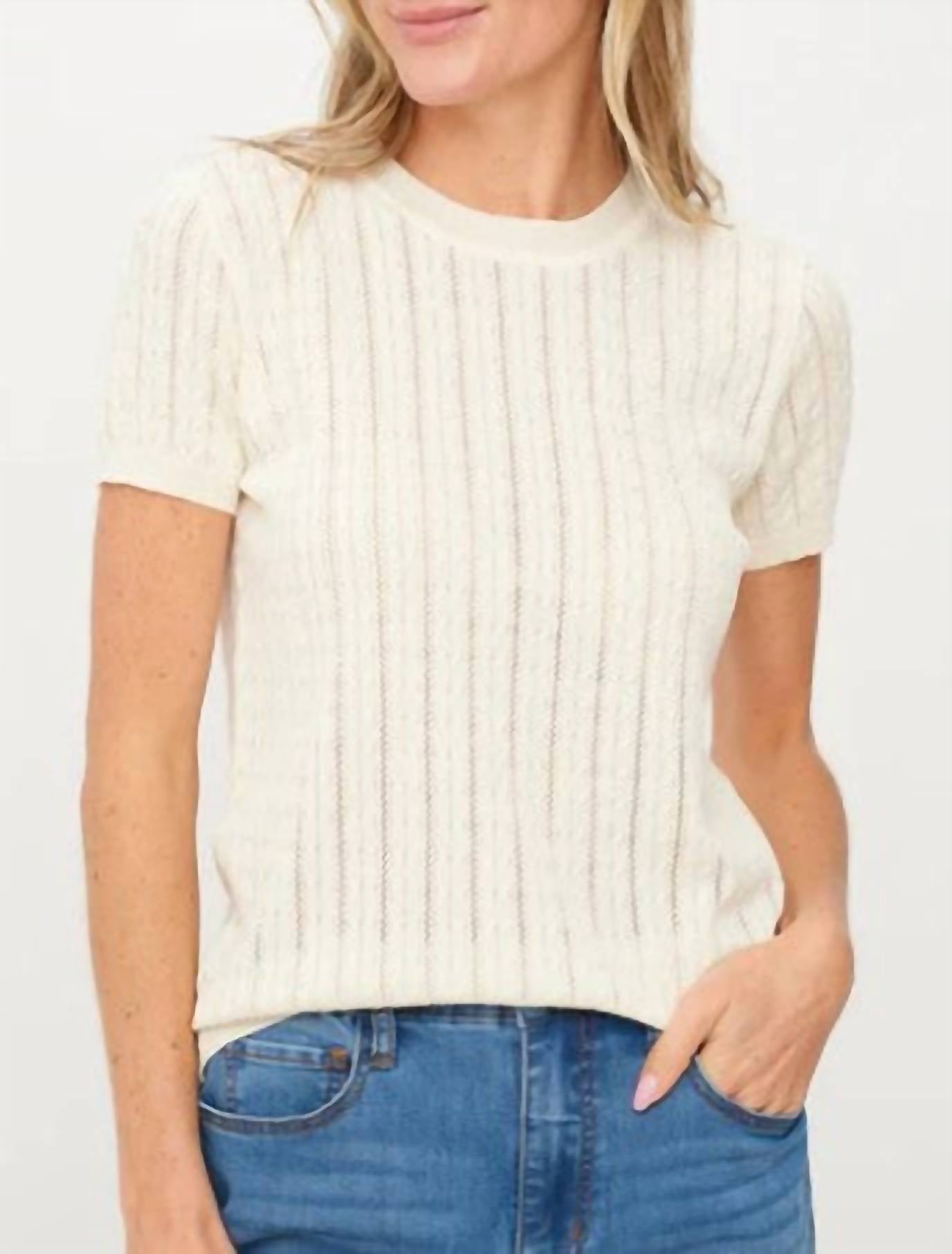 The ultimate go-to sweater, expertly crafted to provide the perfect combination of warmth and style. Its classic design and soft fabric make it a must-have addition to your wardrobe. Introducing the Six Fifty Ivory Natasha Cable Lightweight Sweater, perfect for adding a touch of style to your fall wardrobe. This women's sweater features a classic crewneck design and short sleeves for a comfortable fit. Crafted from 100% viscose, its textured pattern offers a chic look ideal for workwear or travel during the Thanksgiving season. With a pull-on closure, this sweater is effortless to wear and maintain with machine wash and tumble dry instructions.