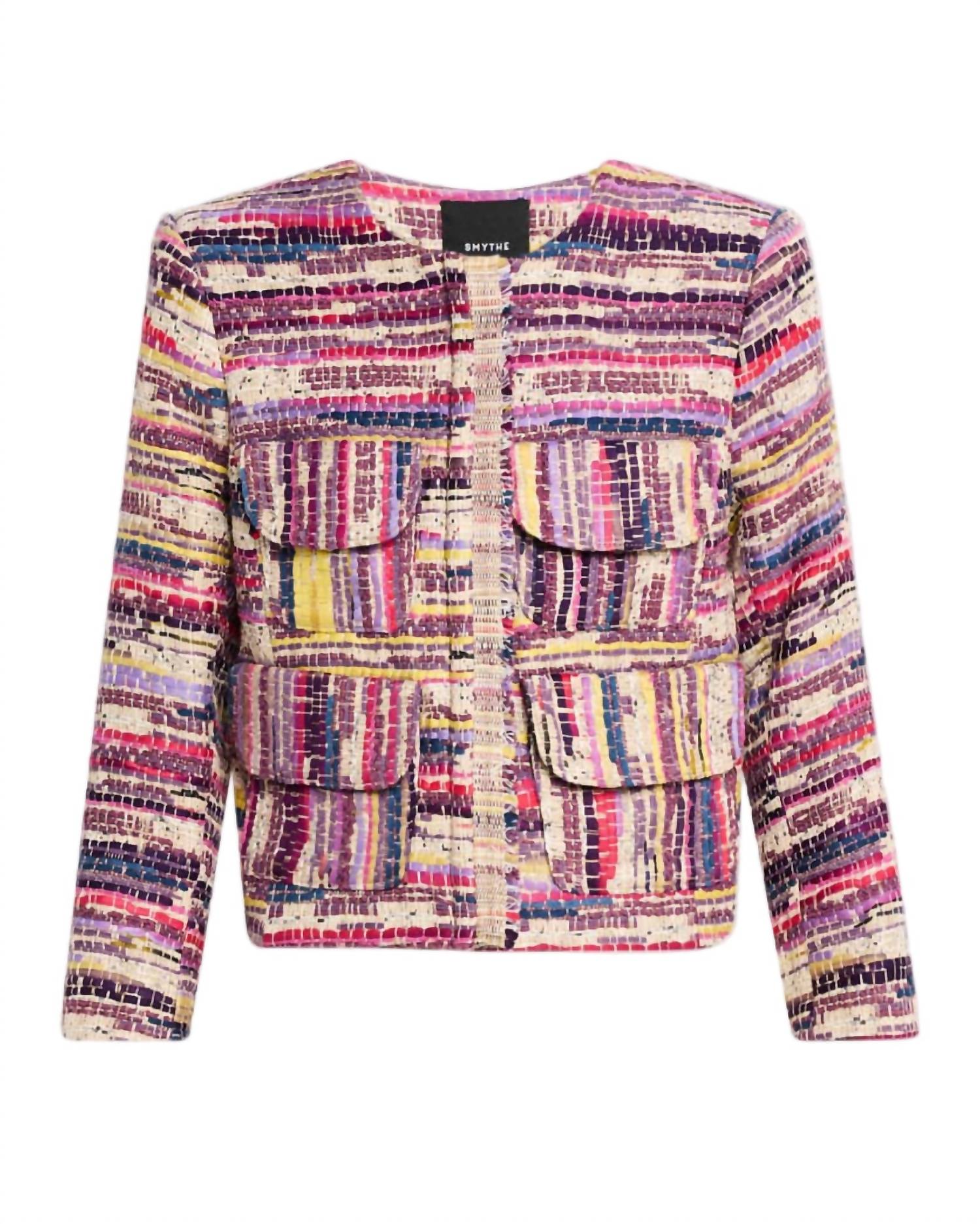 Wear this v-neck sweater with your favorite denim for the perfect fall look. Discover the stylish Zip Cardigan Jacket by Smythe, an essential addition to your spring wardrobe. This versatile piece features long sleeves, four patch pockets, and a chic tweed crew neck framed by a cropped design. Crafted from a cotton blend with 54% Acrylic, 41% Cotton, and 5% Nylon, this jacket embodies boho chic with a multi-patterned style. Closure: Hidden placket front zipper. Care: Machine wash and lay flat to dry.