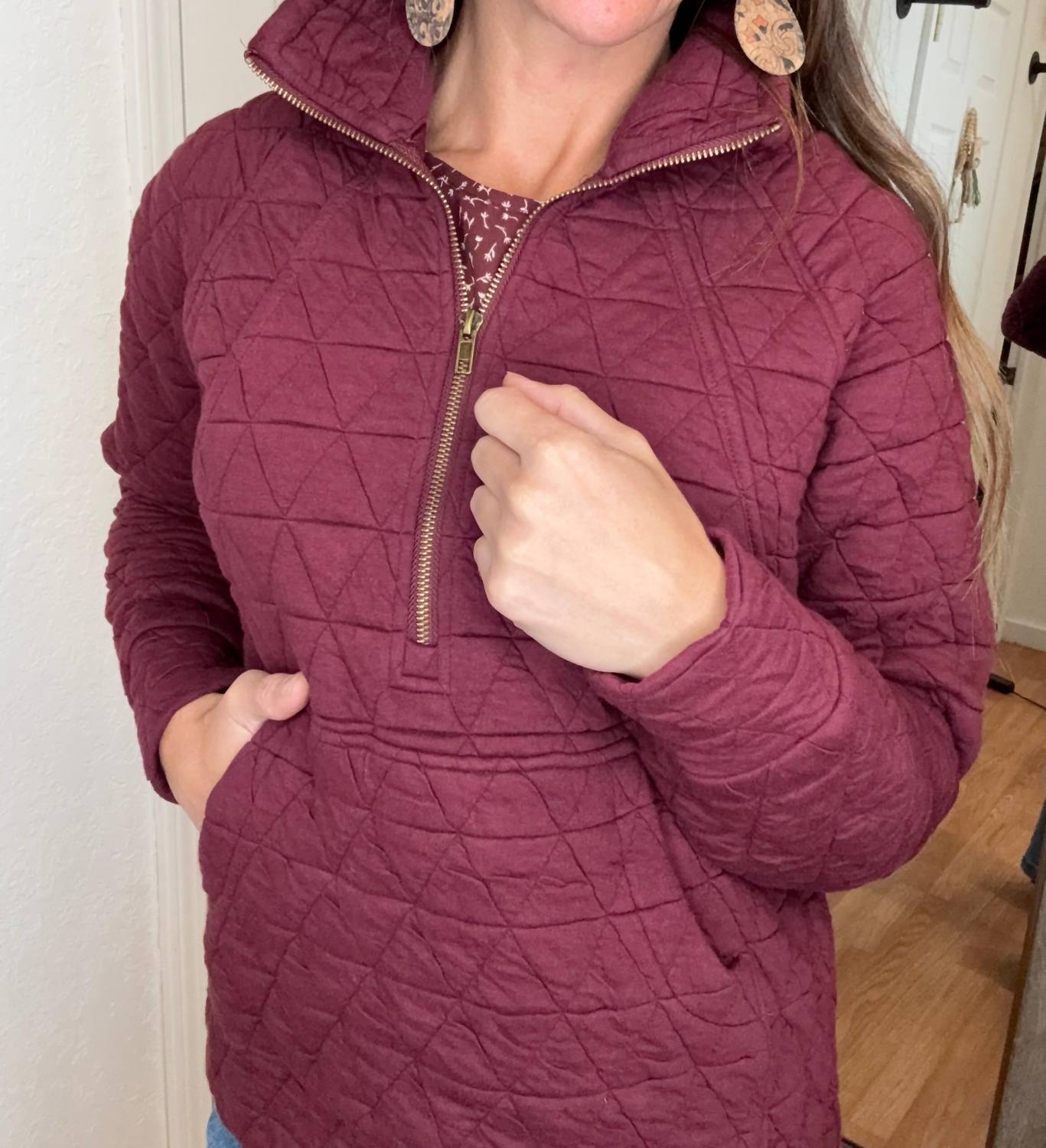 Wear this v-neck sweater with your favorite denim for the perfect fall look. Enhance your winter wardrobe with the Barb Quilted Half Zip Pullover by STACCATO in a rich burgundy hue. This long-sleeve piece combines 100% cotton with a polyester lining for comfort and warmth, perfect for casual elegance. Highlights include a zip closure, quilted design, collared neckline, and a practical kangaroo pocket. Designed for a tailored fit, this pullover offers moderate stretch and is suited for various occasions from travel to streetwear.