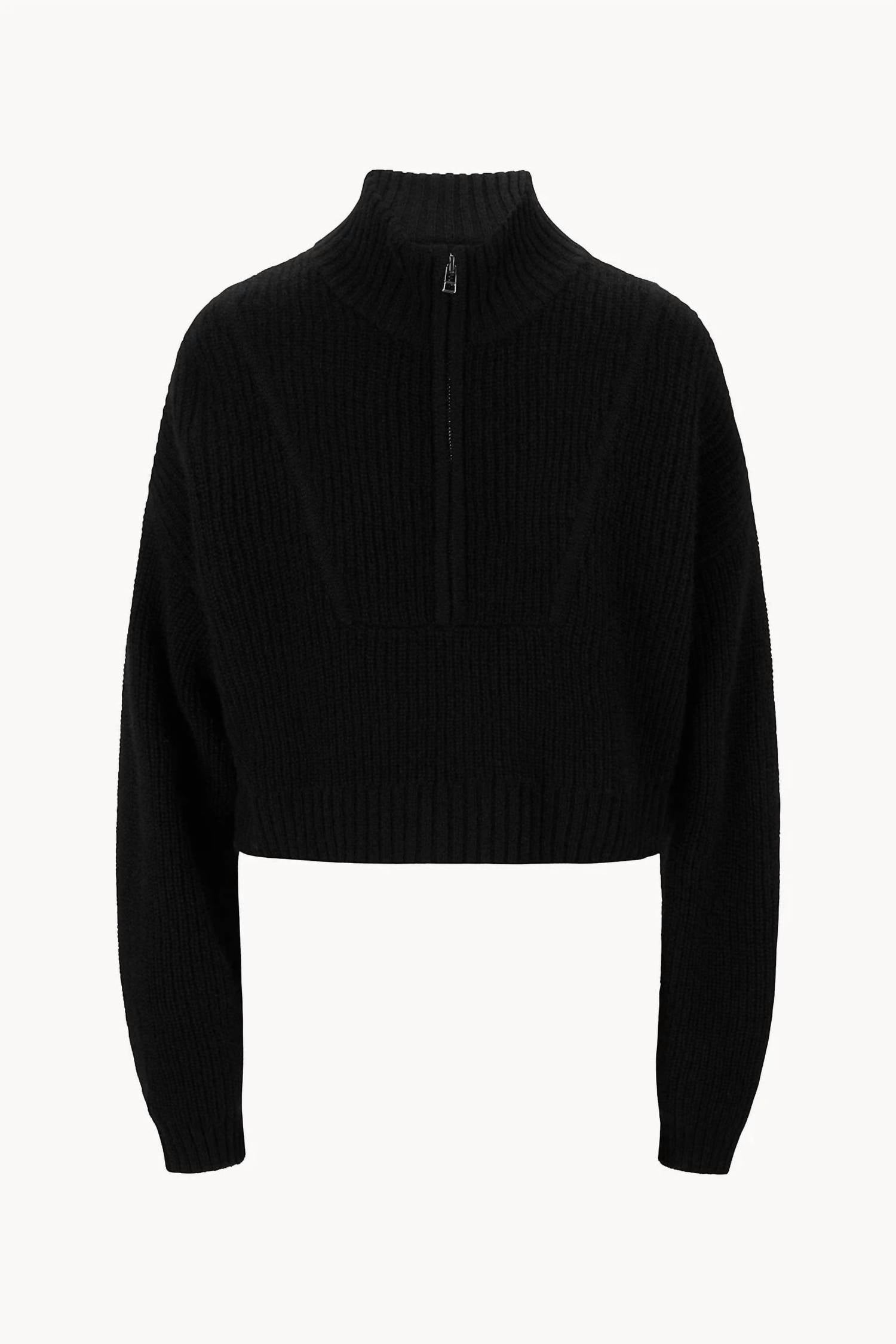 You'll be reaching for this comfy and classic v-neck sweater all season long. Elevate your fall wardrobe with the Cropped Hampton Sweater by STAUD, a best-selling piece now available in a chunky cashmere knit. This black long-sleeve sweater, made from 100% luxurious cashmere, boasts a textured pattern and a stylish collar neckline. Designed with a convenient zip closure, it's both minimalist and perfect for vacation wear. Care: Dry clean only. Model is 5'10" and wearing a size S.