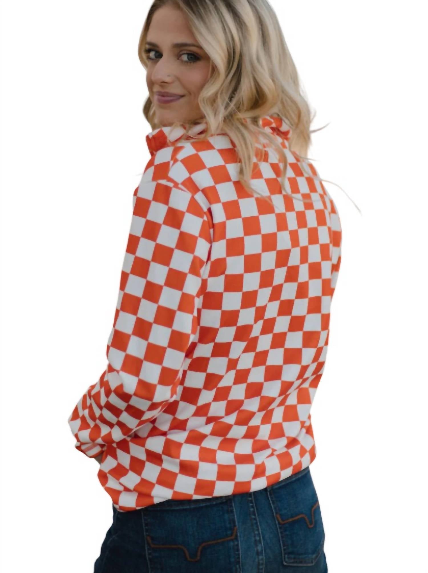 The ultimate go-to sweater, expertly crafted to provide the perfect combination of warmth and style. Its classic design and soft fabric make it a must-have addition to your wardrobe. Introducing the Pep Rally Pullover by Sterling Kreek, a vibrant orange essential for game day fun. Featuring a long sleeve design with a playful checkered pattern, this piece is crafted from a cotton blend composed of 32% cotton, 56% rayon, and 12% spandex. The pullover includes a convenient zip closure and a classic collar neckline. Care instructions recommend machine washing and tumble drying to maintain its vibrant appeal.
