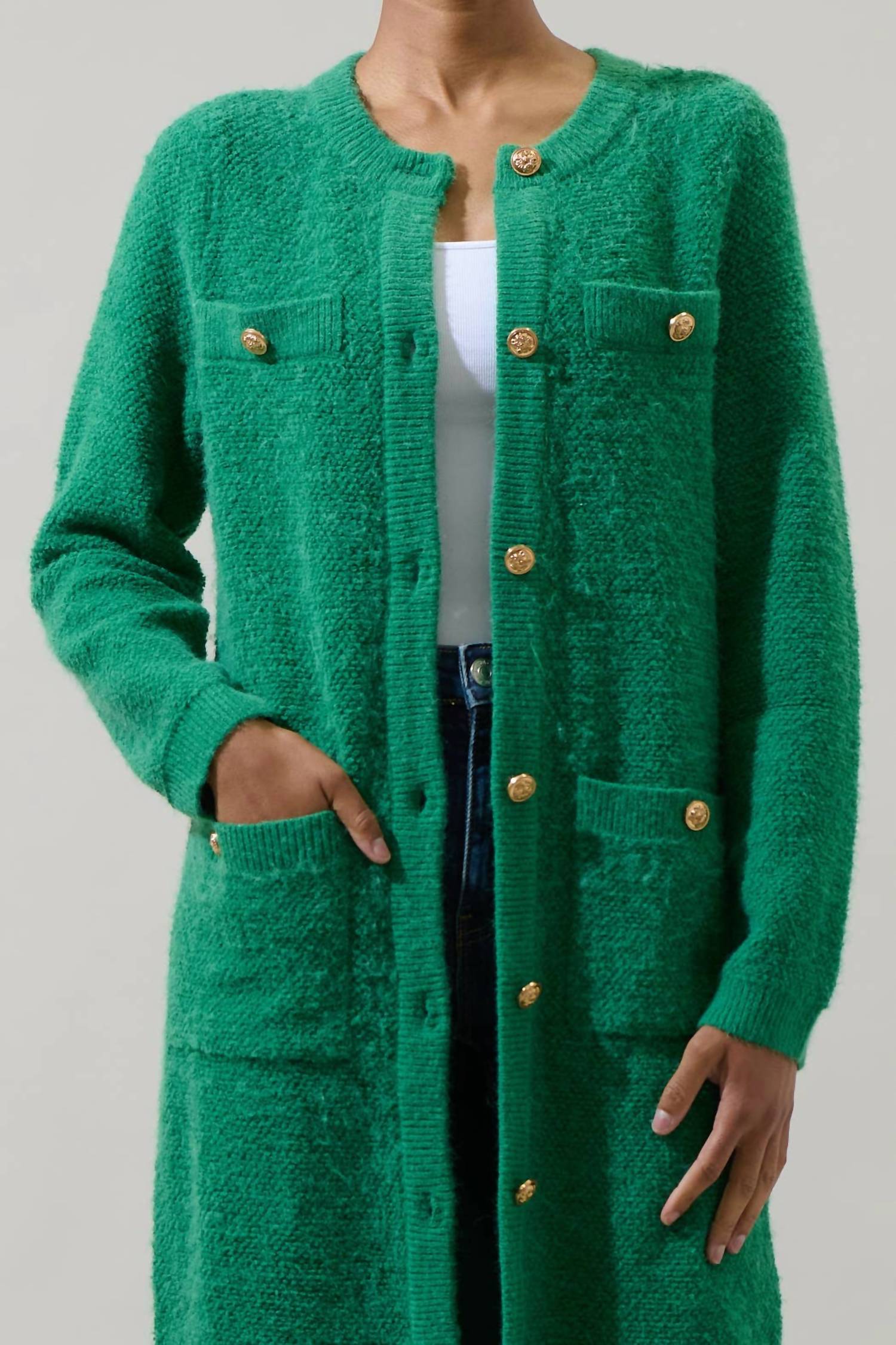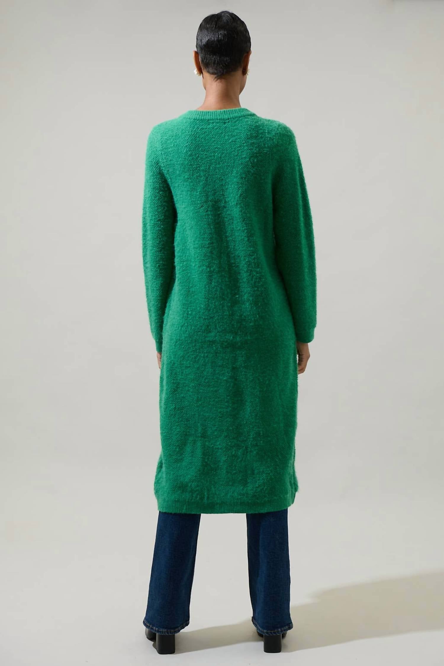 This cardigan will be a sweater-rotation favorite. Elevate your winter wardrobe with the Sanford Button Down Midi Cardigan by SUGARLIPS, available in a striking Kelly Green. This cardigan features long sleeves and practical pockets, enhancing its functional appeal. Crafted from a blend of 42% Acrylic, 28% Nylon, and 30% Polyester, it offers a textured fabric feel. The button closure adds a chic detail to its mid-length silhouette. Perfect for holiday parties or casual outings, this versatile piece is a must-have this season. Model is 5'10" and wearing size XS, with a chest measurement of 19.25" and a length of 44.5".