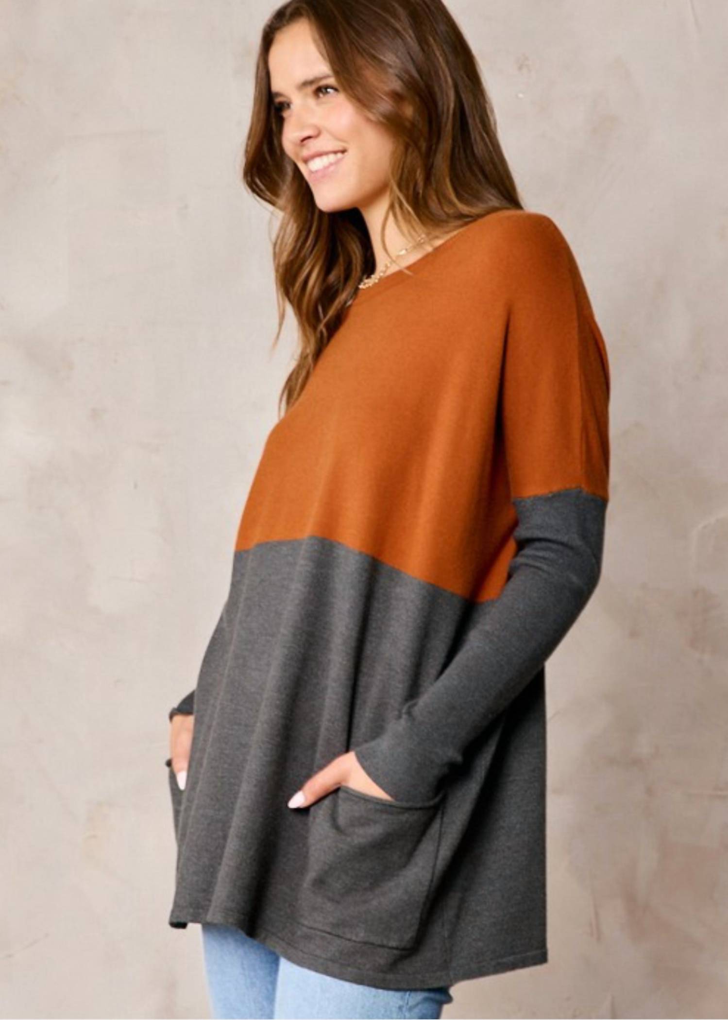 Stay warm and stylish in this versatile and effortlessly cool knitwear staple. Wear it alone or layered, it's the perfect sweater for the season and you'll wish you had it in every color. Elevate your travel wardrobe with the Long Sleeve Bat Wing Color Block Sweater by Tea N Rose, tailored for spring style aficionados. This piece boasts a chic bat wing silhouette, complemented by a classic scoop neckline and long sleeves for added warmth. Crafted with a striking Amber and Black Caviar color block design, it is a pull-on sweater offering both comfort and flair. It's a solid, versatile piece that effortlessly aligns with the 90s fashion trend.