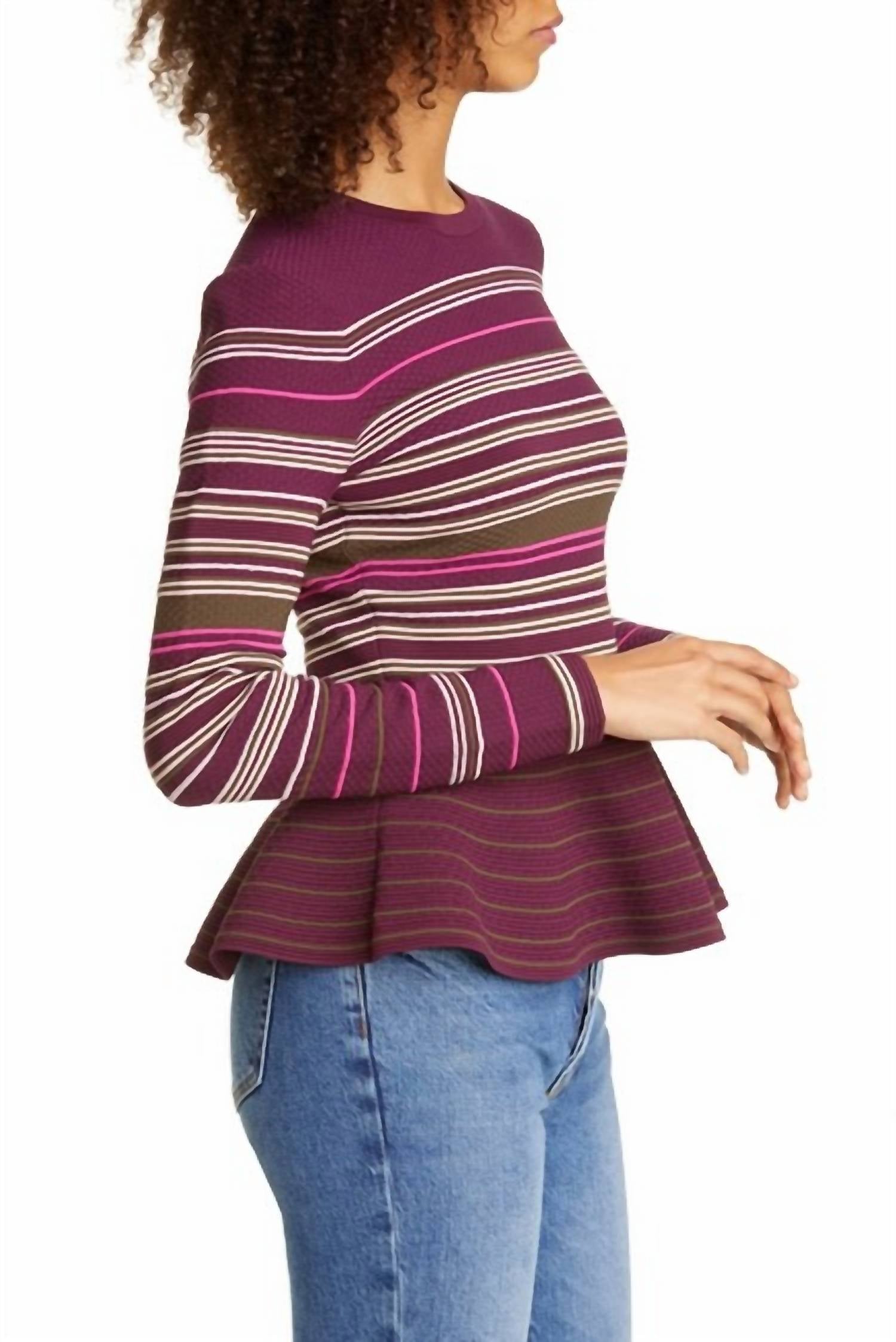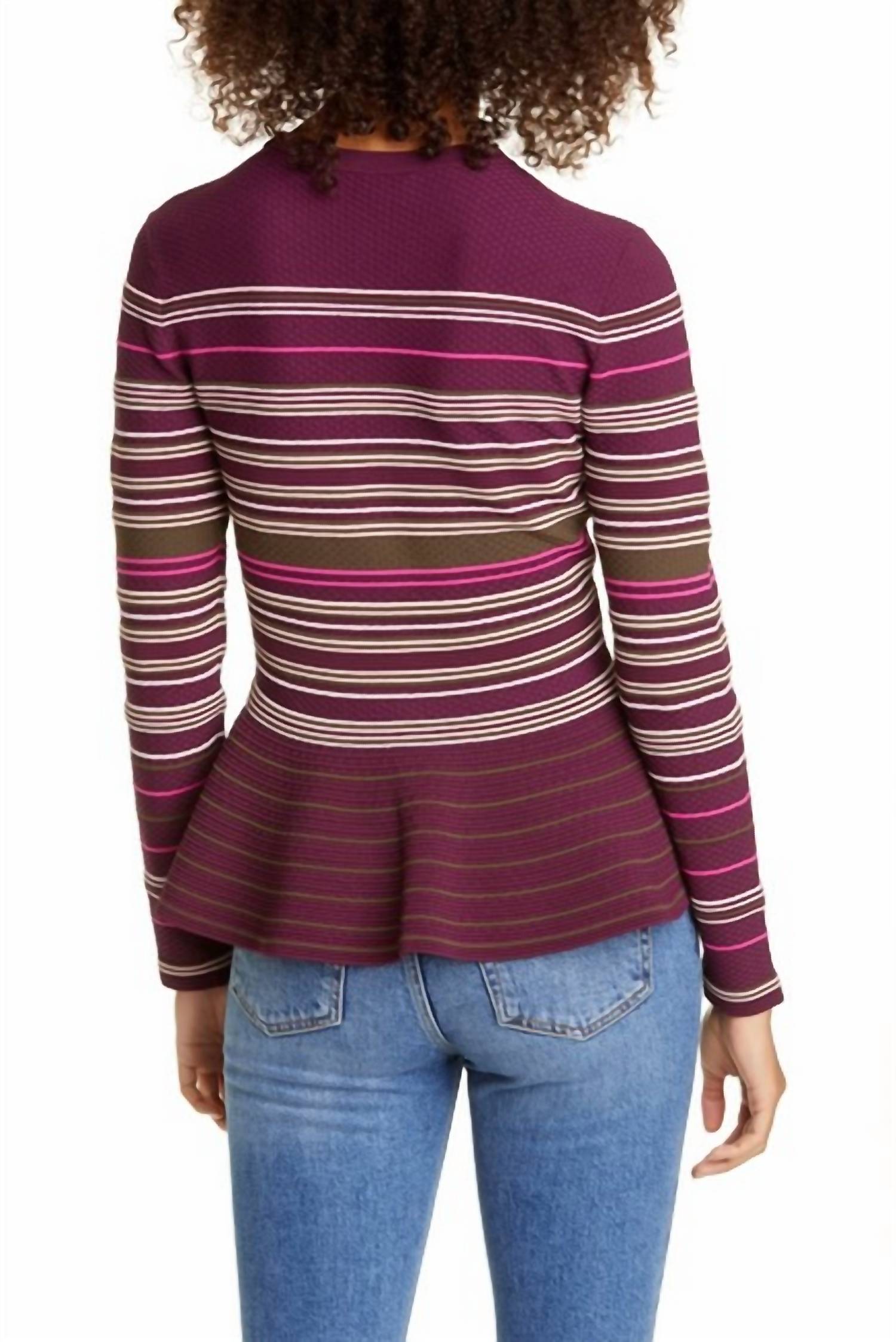 The ultimate go-to sweater, expertly crafted to provide the perfect combination of warmth and style. Its classic design and soft fabric make it a must-have addition to your wardrobe. Introducing the Leytina Striped Peplum Sweater by TED BAKER, a perfect blend of style and femininity. With long sleeves and a chic crewneck, it's meticulously crafted from 50% viscose, 45% nylon, 2% polyester, 2% elastane, and 1% metallic fibers. This burgundy sweater features a stripe pattern and peplum design, measuring 24 inches in length for a flattering fit. For care, simply hand wash and dry flat, ensuring it remains a staple in your wardrobe. Size 4 TED / 10 US
