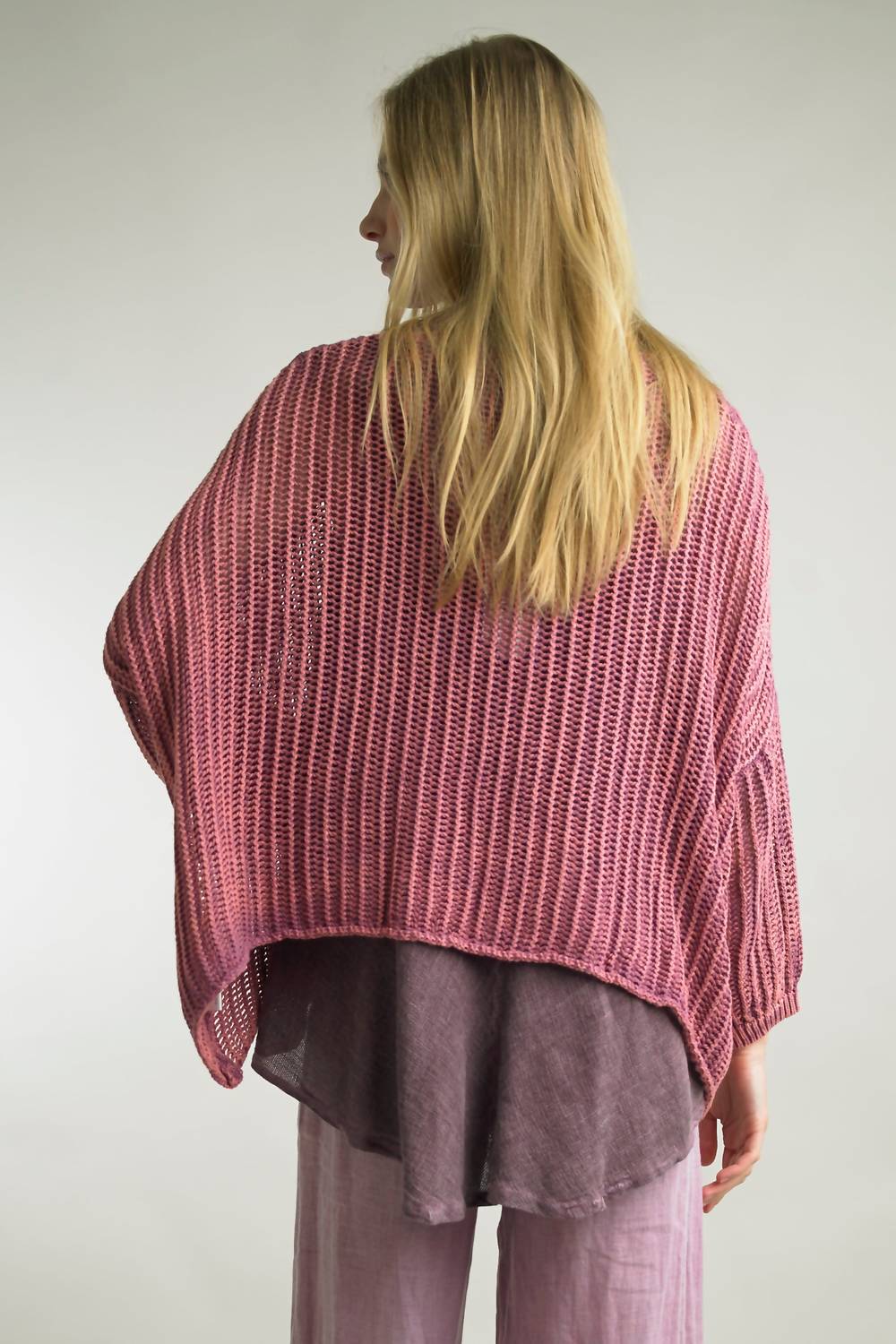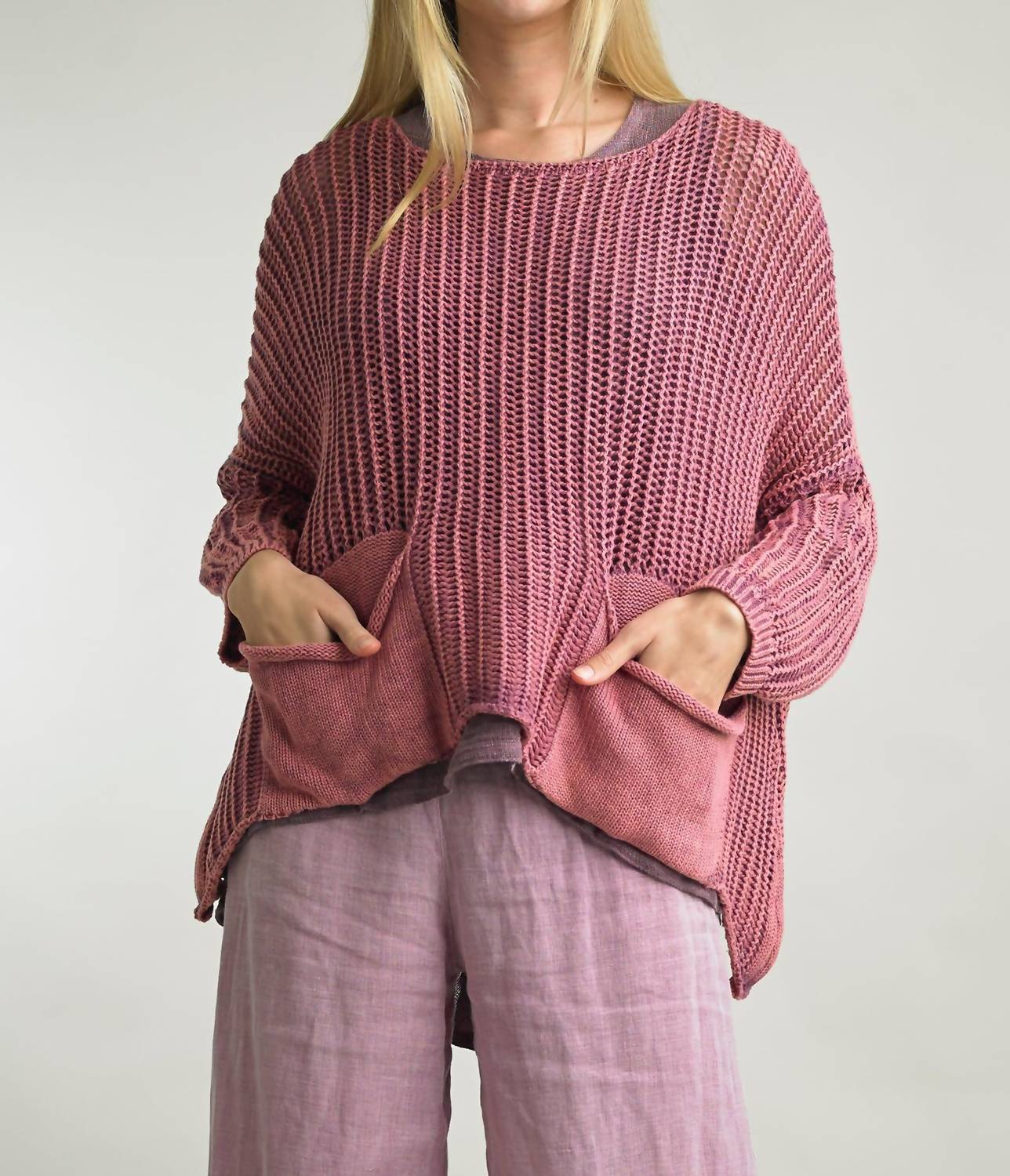 The ultimate go-to sweater, expertly crafted to provide the perfect combination of warmth and style. Its classic design and soft fabric make it a must-have addition to your wardrobe. Introducing the Tempo Paris Washed Linen Pocket Sweater, a wardrobe staple in vibrant raspberry perfect for layering across seasons. This long sleeve, relaxed-fit sweater is made from 100% washed linen featuring a breathable open knit texture and front pockets for added convenience. The high-low hem and scoop neckline enhance its boho chic vibe, making it ideal for travel or any casual occasion. Crafted in Italy, it offers a luxurious feel with its pull-on closure for effortless style. Care for it easily with machine wash instructions and lay flat to dry for lasting quality. With a one size fits most fit, it comfortably measures 62" at the bust and 21-26" in length.