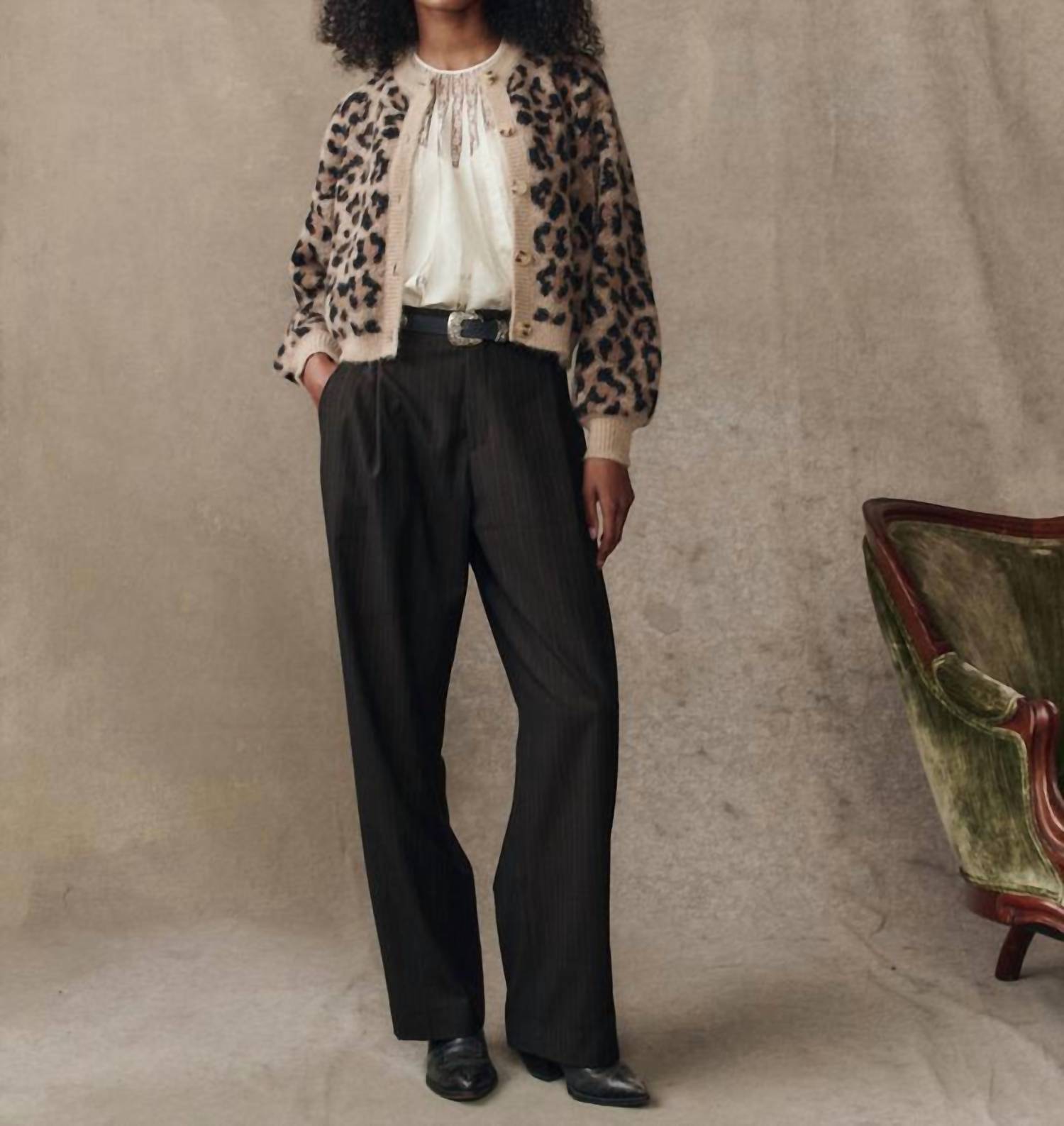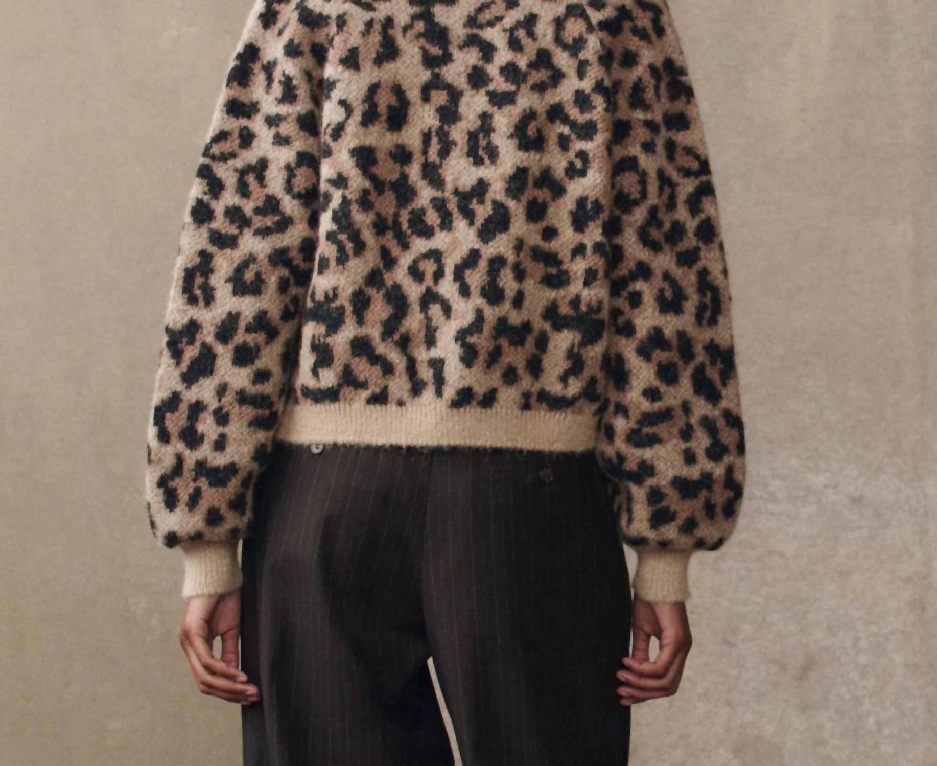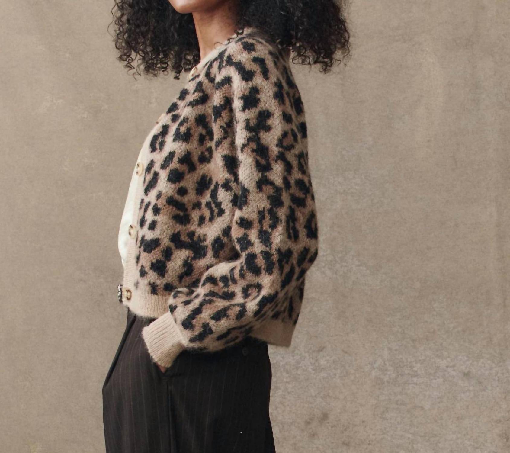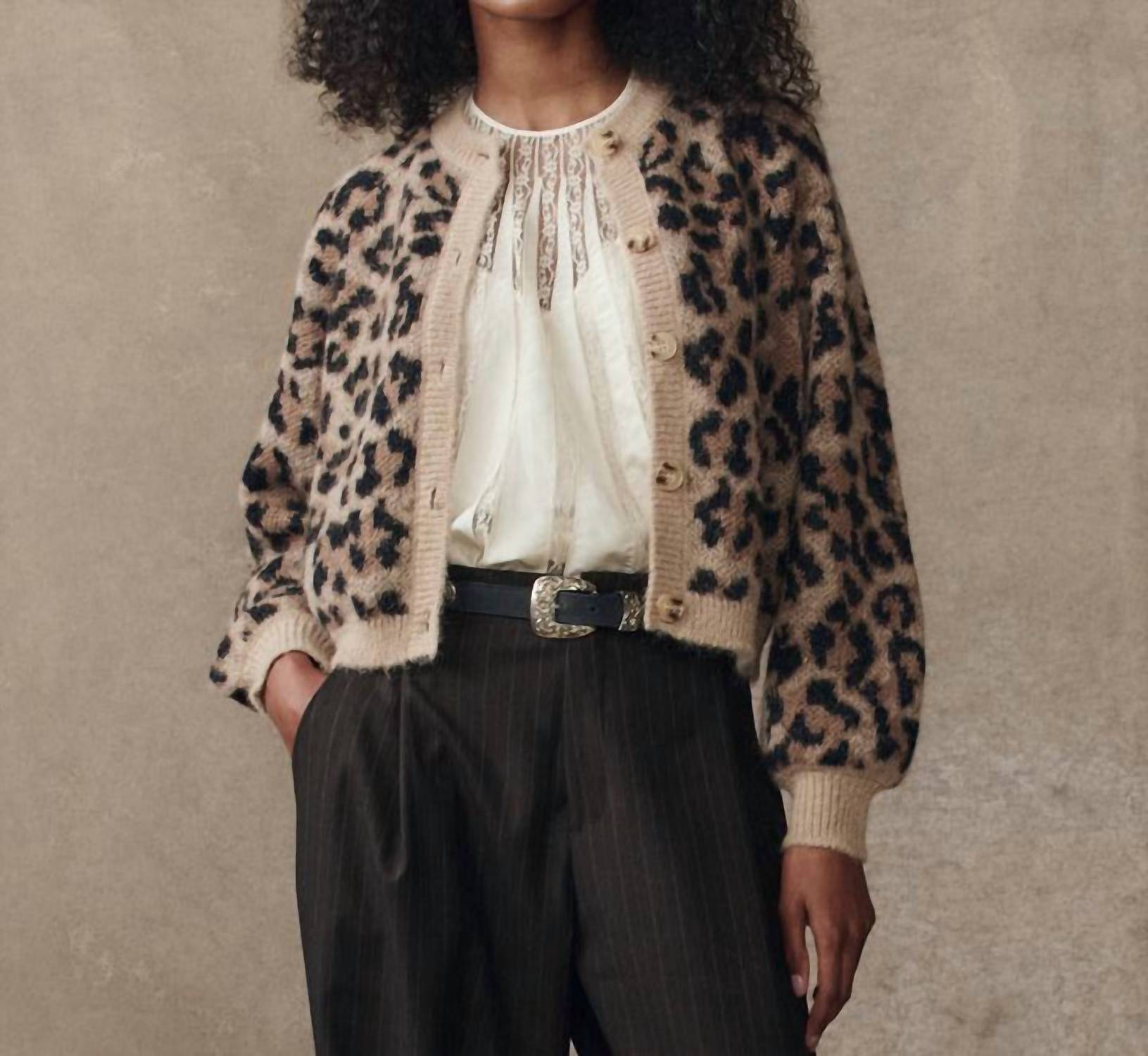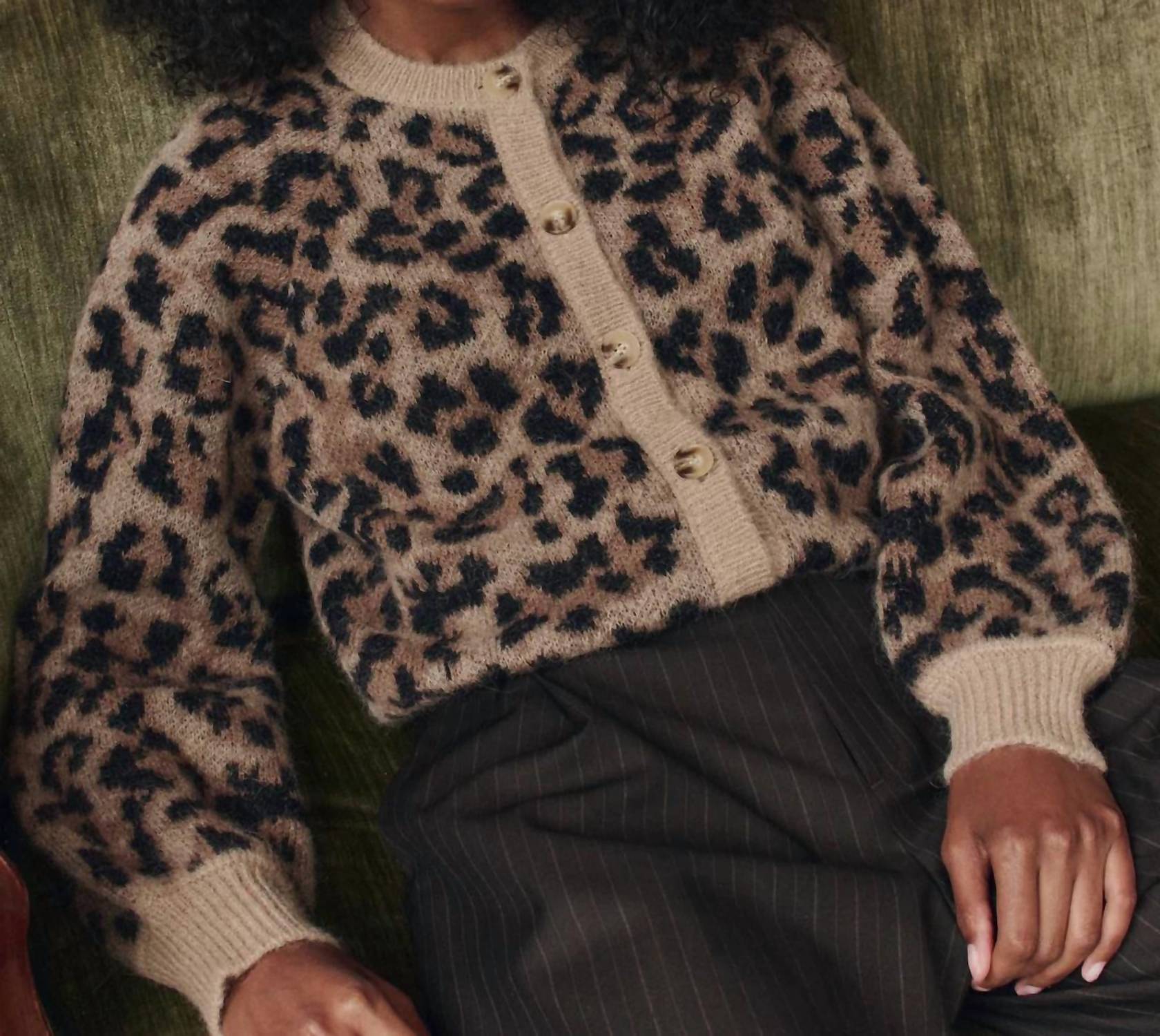 A classic fit that works just as good buttoned as it does left open. Elevate your knitwear collection with the Windsor Cardigan by THE GREAT., showcasing a bold leopard jacquard pattern for a playful twist on a classic style. This women's cardigan features long blouson sleeves and is spun from a luxurious blend of 55% Superfine Alpaca, 22% Recycled Polyamide, 15% Wool, and 8% Polyester, ensuring warmth and softness. Crafted with a crewneck and finished with light horn button closures, its cropped length adds a chic touch to any ensemble. Easy to care for, simply machine wash and tumble dry for effortless maintenance.