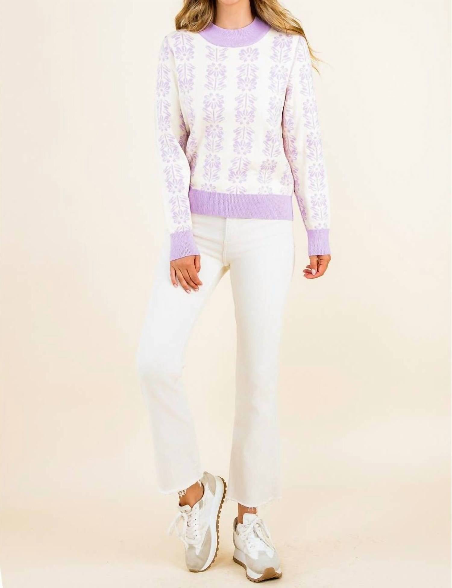 Experience the perfect blend of comfort and style with this trendy crew neck sweater, designed to effortlessly elevate your wardrobe. Pair it with your favorite denim and loafers for the perfect look. Introducing the Cassidy Floral Sweater by THML, a charming lilac jacquard-patterned piece that embodies a fresh, feminine vibe. Designed with elbow sleeves and a cozy cream knit, this sweater is perfect for adding a touch of elegance to your wardrobe with its delicate lavender floral motif. Closure: Pull on. Care: Hand wash and lay flat to dry. Ideal for travel or layering in the spring season, it's a versatile piece that pairs beautifully with denim or tailored trousers.