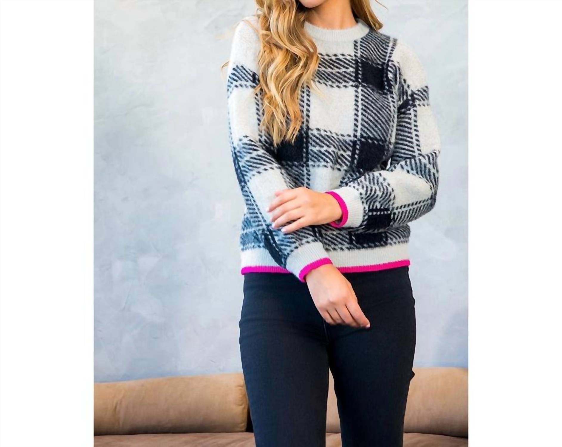 The ultimate go-to sweater, expertly crafted to provide the perfect combination of warmth and style. Its classic design and soft fabric make it a must-have addition to your wardrobe. Embrace warmth and style with the THML Mohair Plaid Sweater, a standout piece in gray. Featuring long sleeves and a luxurious mohair 100% nylon composition, this plaid design is perfect for layering throughout the fall season. The vibrant hot pink trim at the cuffs and hem adds a playful contrast, making this sweater a wardrobe essential. Designed with a classic crewneck and a pull-on closure, it combines comfort and timeless fashion effortlessly. Care for this piece with machine wash instructions.