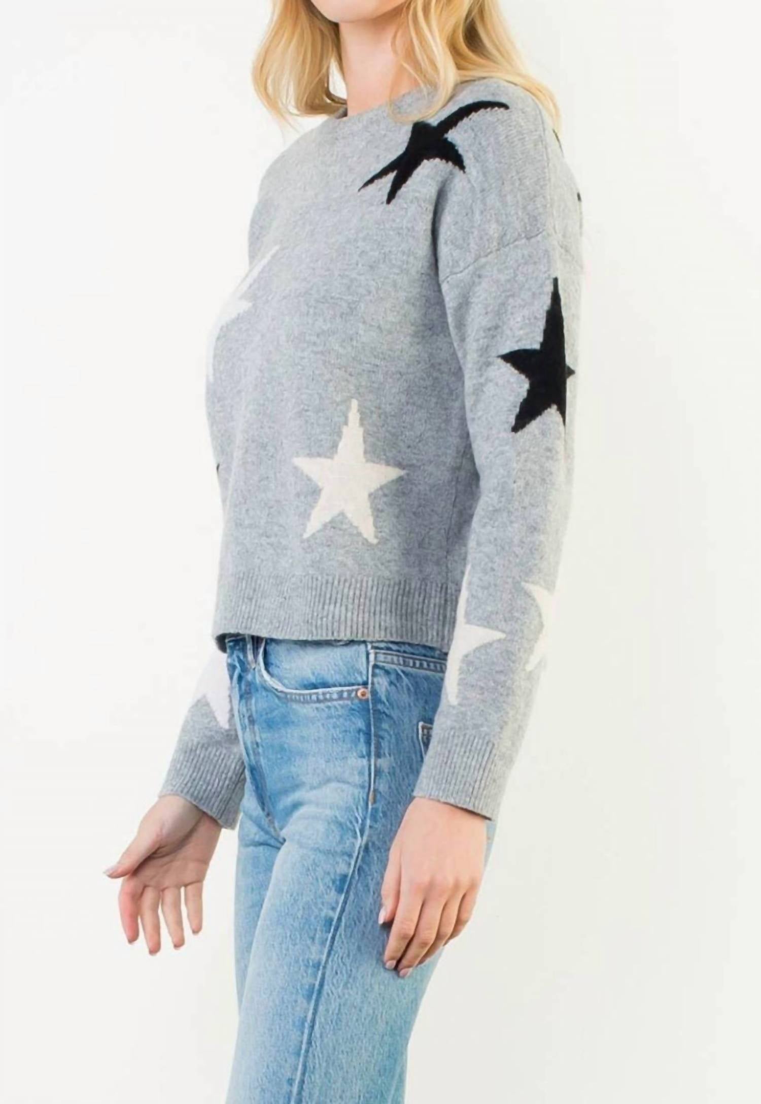 Experience the perfect blend of comfort and style with this trendy crew neck sweater, designed to effortlessly elevate your wardrobe. Pair it with your favorite denim and loafers for the perfect look. Introducing the Star Pattern Knit Sweater by THML, a chic choice for the holiday season with its preppy design in versatile grey. This women's crewneck sweater features long sleeves and a graphic star pattern. Crafted from a blend of 45% polyester, 45% acrylic, 7% wool, and 3% spandex, it offers both warmth and stretch. With a pull-on closure, this stylish piece is perfect for any holiday party.