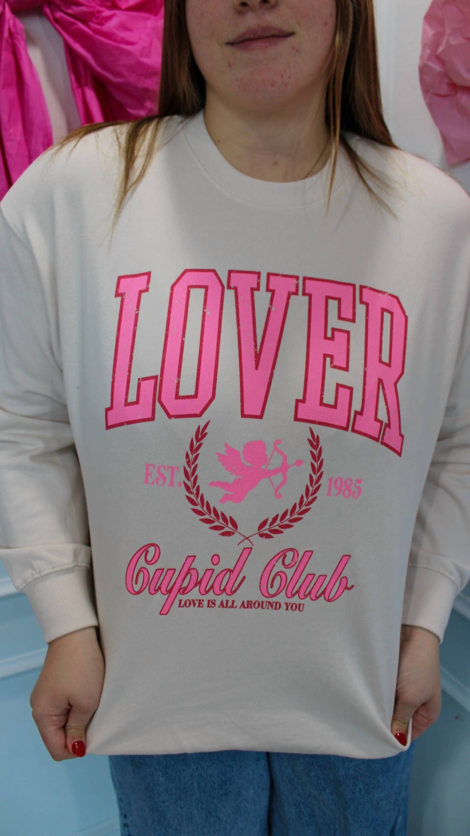 Experience the perfect blend of comfort and style with this trendy crew neck sweater, designed to effortlessly elevate your wardrobe. Pair it with your favorite denim and loafers for the perfect look. Introducing the Love Club Crewneck Sweater by Tres Bien, a cozy addition to your wardrobe in soft beige. Crafted from 100% cotton, this long sleeve sweatshirt features bold pink "LOVER" lettering and Cupid Club details, perfect for a relaxed, everyday look. Designed with a classic crew neckline and a pull-on closure, it provides comfort and ease, whether paired with jeans or leggings. Care: Machine wash and line dry. Model is wearing a size large.