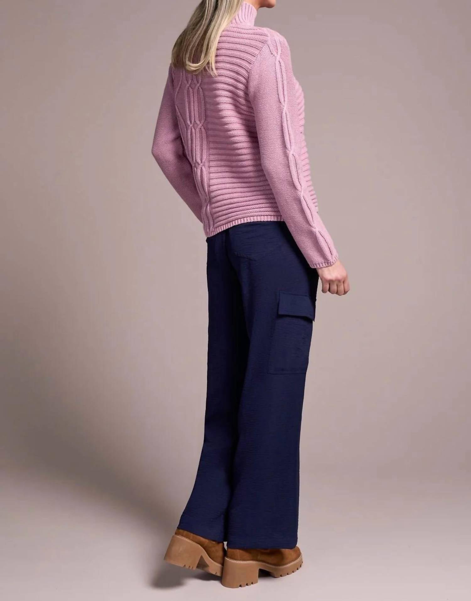 A classic staple that every closet needs. Experience the luxurious warmth of the Vintage Washed Cable Knit Mock Neck Sweater by TRIBAL, a staple for your fall wardrobe. This women's sweater features long sleeves, a mock neckline, and a relaxed drop shoulder design for a laid-back yet stylish look. Made from 100% cotton and adorned with textured multi-stitch yarn patchwork, it offers a cozy yet chic vibe in a charming vintage lilac hue. Care is simple with hand washing and laying flat to dry, making it perfect for those Thanksgiving holiday gatherings and more. Closure: Pull on.