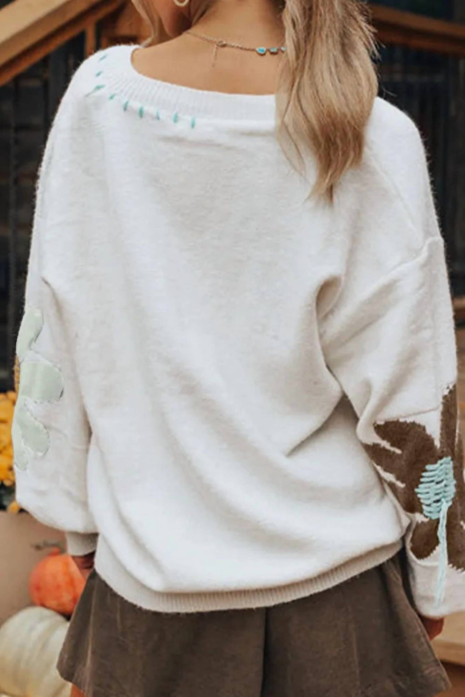 Umorger - Women's Flower V-neck Dropped Shoulder Sweater