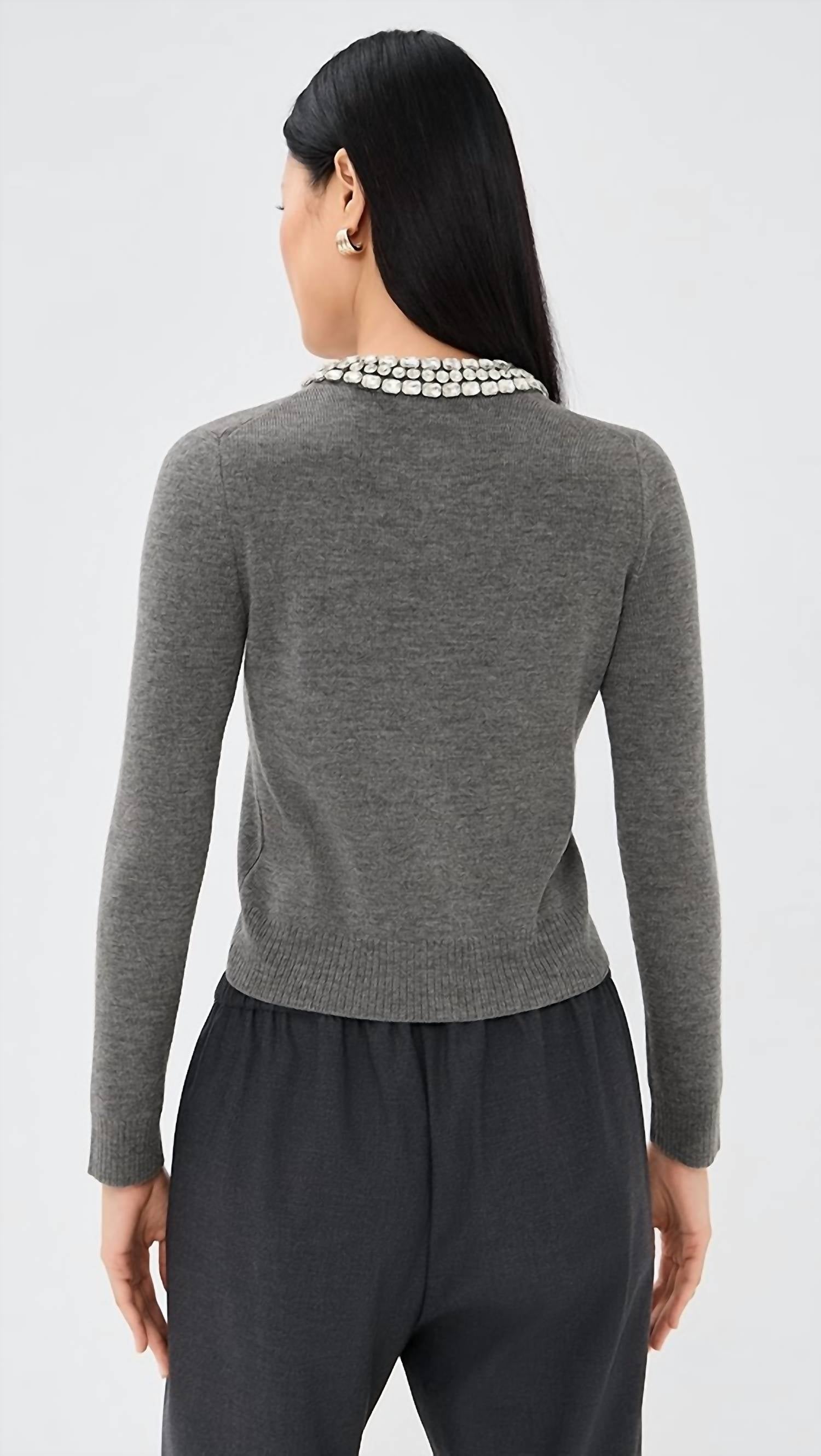 Throw this adorable cardigan over any cami or tank top. Introducing the Daro Embellished Cardigan by Veronica Beard, a statement piece in dark heather grey that adds a touch of elegance to any ensemble. This long-sleeve cardigan is crafted from 100% extra-fine merino wool, offering a textured finish with a crystal-embellished collar for subtle glamour. The garment's slim, shrunken fit is complemented by tonal snap button closure and ribbed trims. Care: Dry clean only. Model is 5'10" and is wearing a size S.