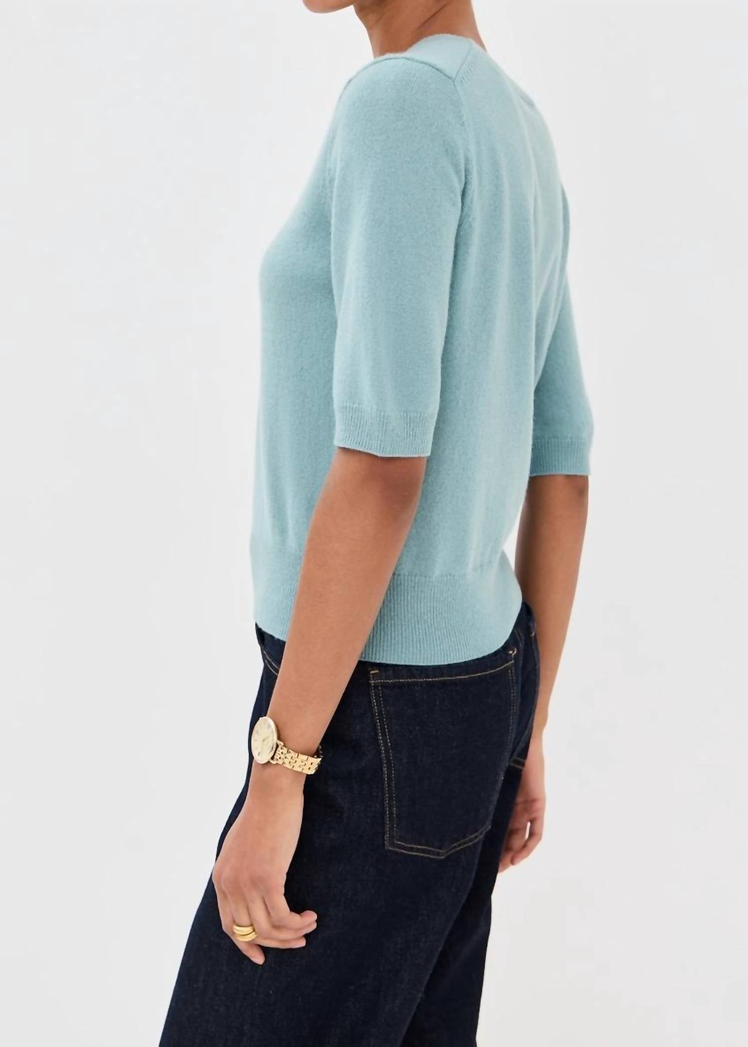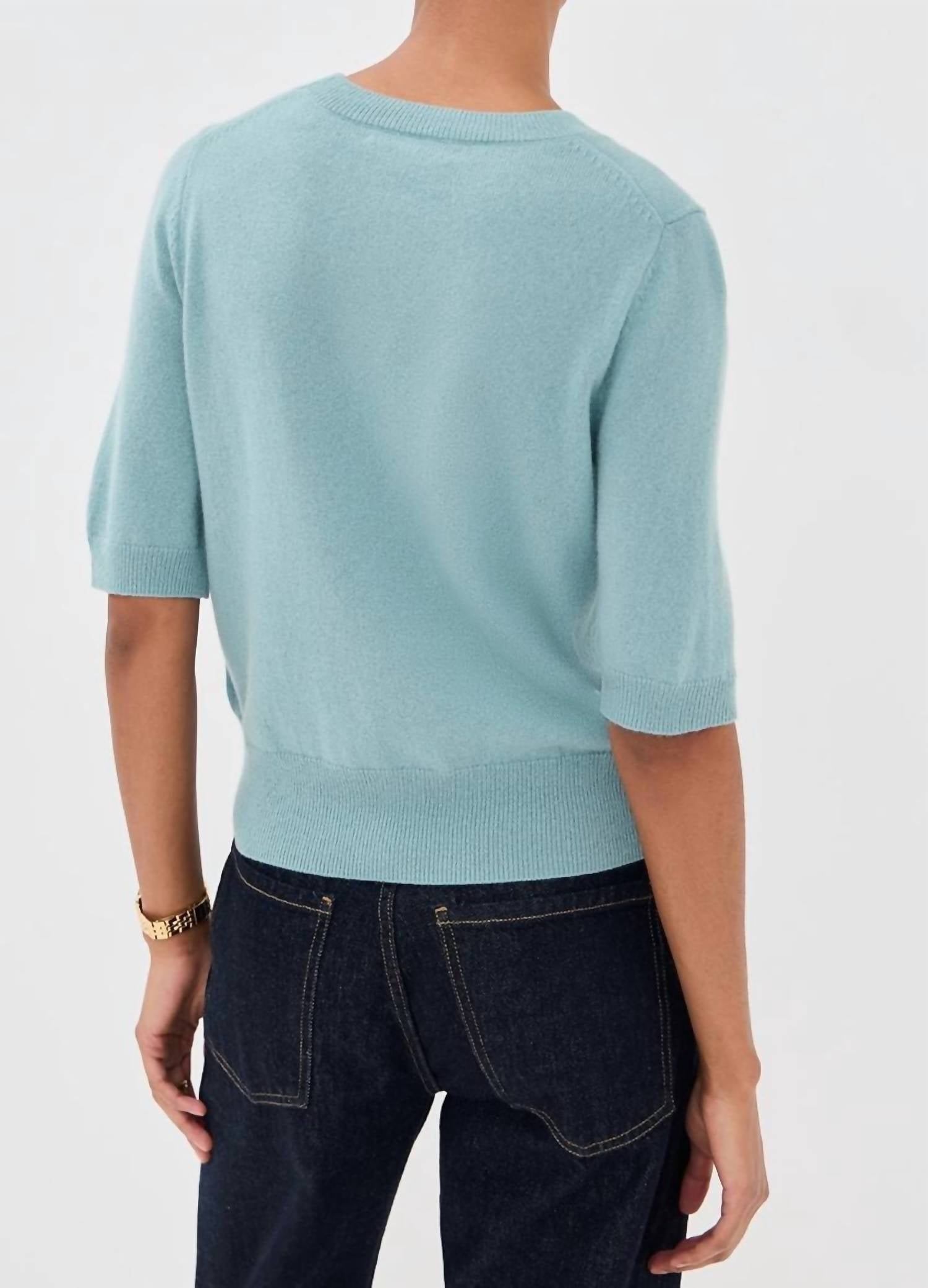 Experience the perfect blend of comfort and style with this trendy crew neck sweater, designed to effortlessly elevate your wardrobe. Pair it with your favorite denim and loafers for the perfect look. Introducing the Shana Cashmere Sweater by Veronica Beard, a luxurious staple in Antique Blue designed for the modern woman. This pullover features a slightly cropped body and short sleeves, complemented by fine ribbing at the collar, cuffs, and hem. Crafted from 100% pure cashmere, it offers an ultra-soft, textured hand-feel. Length: 20.5 inches. Care: Dry clean only.