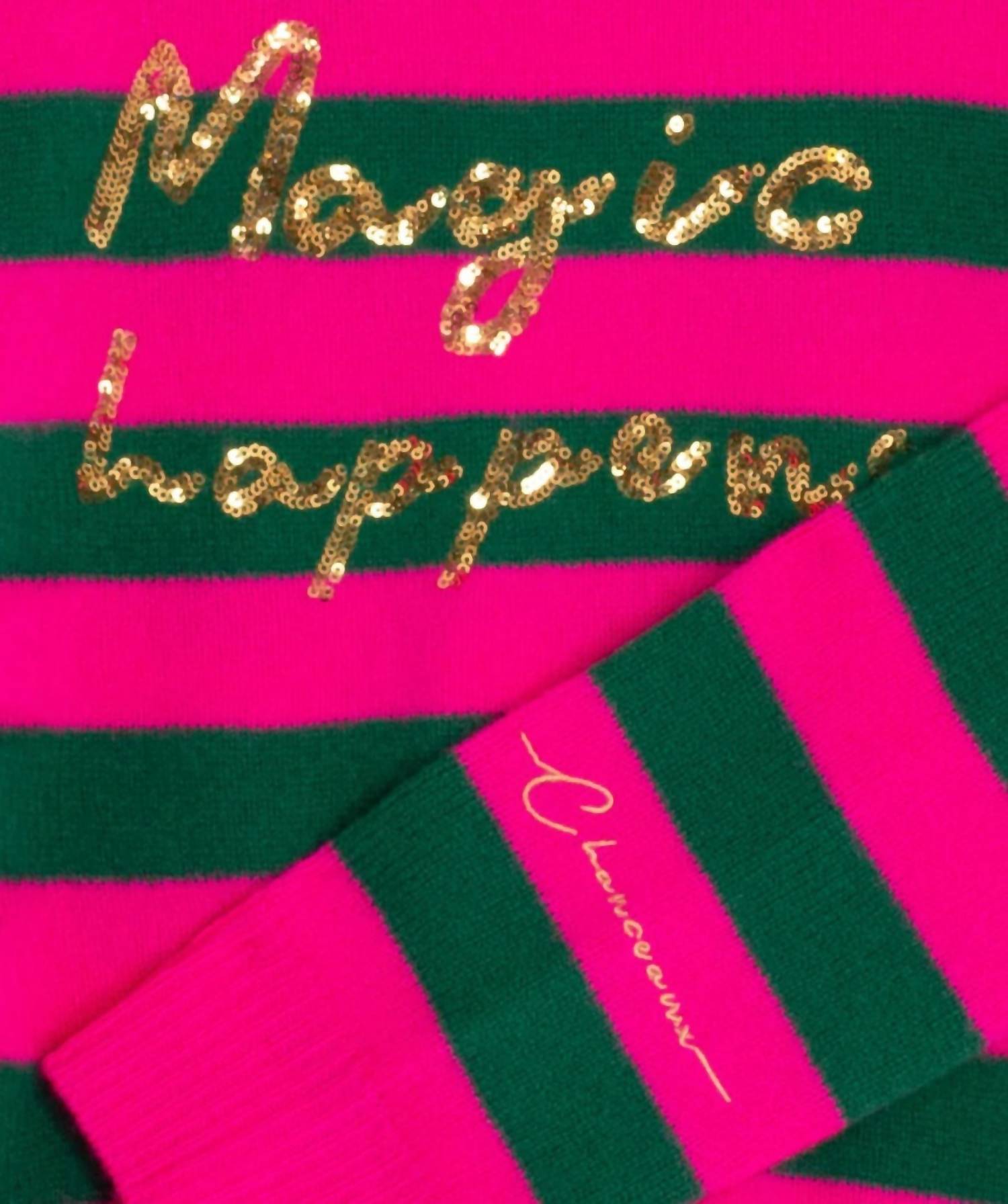 Stay warm and stylish in this versatile and effortlessly cool knitwear staple. Wear it alone or layered, it's the perfect sweater for the season and you'll wish you had it in every color. Experience the Magic Happens Sweater by Vilagallo, a bold statement piece featuring long sleeves and vibrant fuchsia and green stripes. Crafted from 100% wool, it includes a front sequin embroidery with the phrase "Magic happens" in gold, offering both style and warmth with a natural feel. Designed with ribbed cuffs, hem, and neckline, this sweater boasts a classic crew neck and a regular fit for a comfortable yet fashionable look. Embrace effortless chic with a pull-on closure and maintain its beauty with dry cleaning.