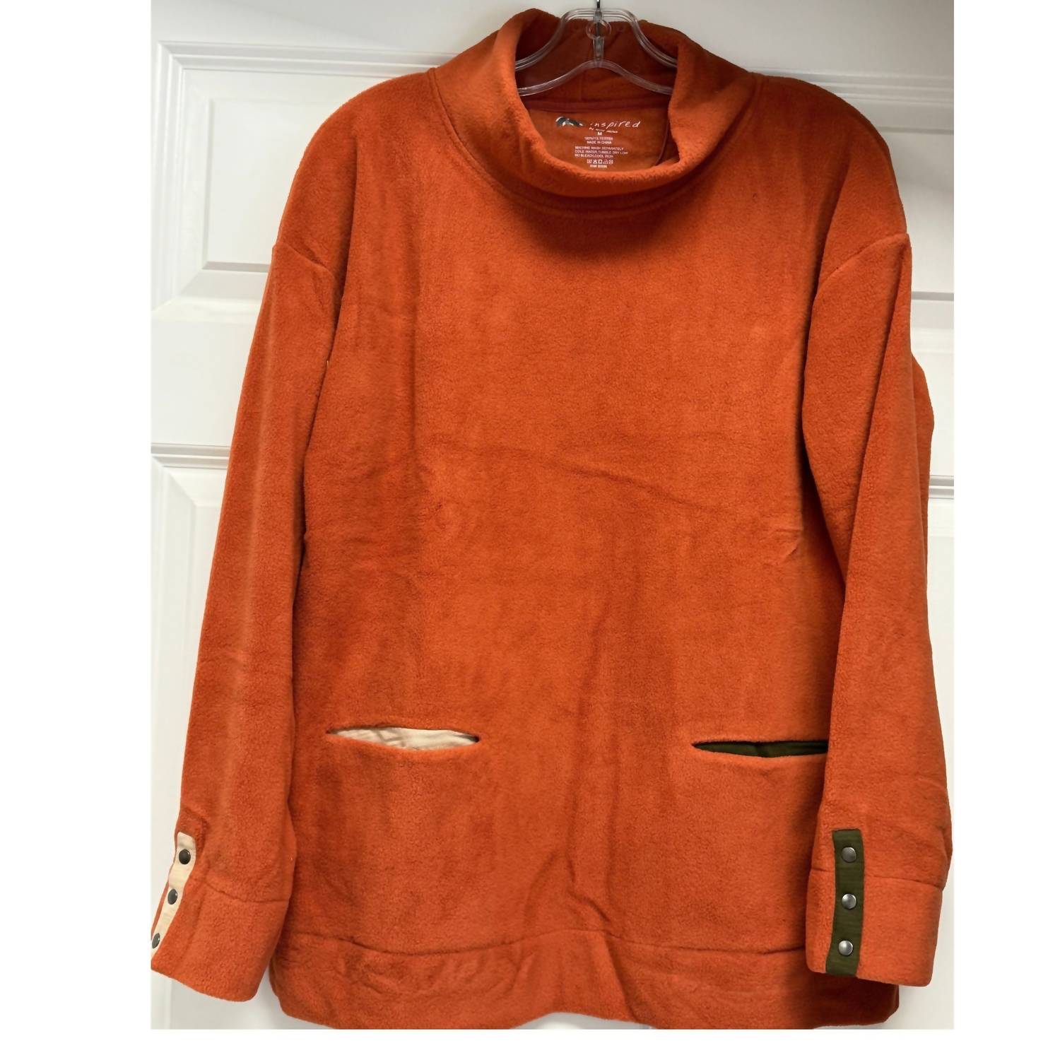 Fit to perfection and effortlessly chic. Crafted by Wild Palm, the Women's Fleece Pullover Tunic is a cozy addition to your fall wardrobe. This tunic features a cowl neck and long sleeves, offering a minimalist style in a solid orange hue. Made from 100% polyester, it includes color front pockets and a pull-on closure for added convenience. Care instructions: machine wash separately in cold water, tumble dry low, avoid bleach, and cool iron if needed.