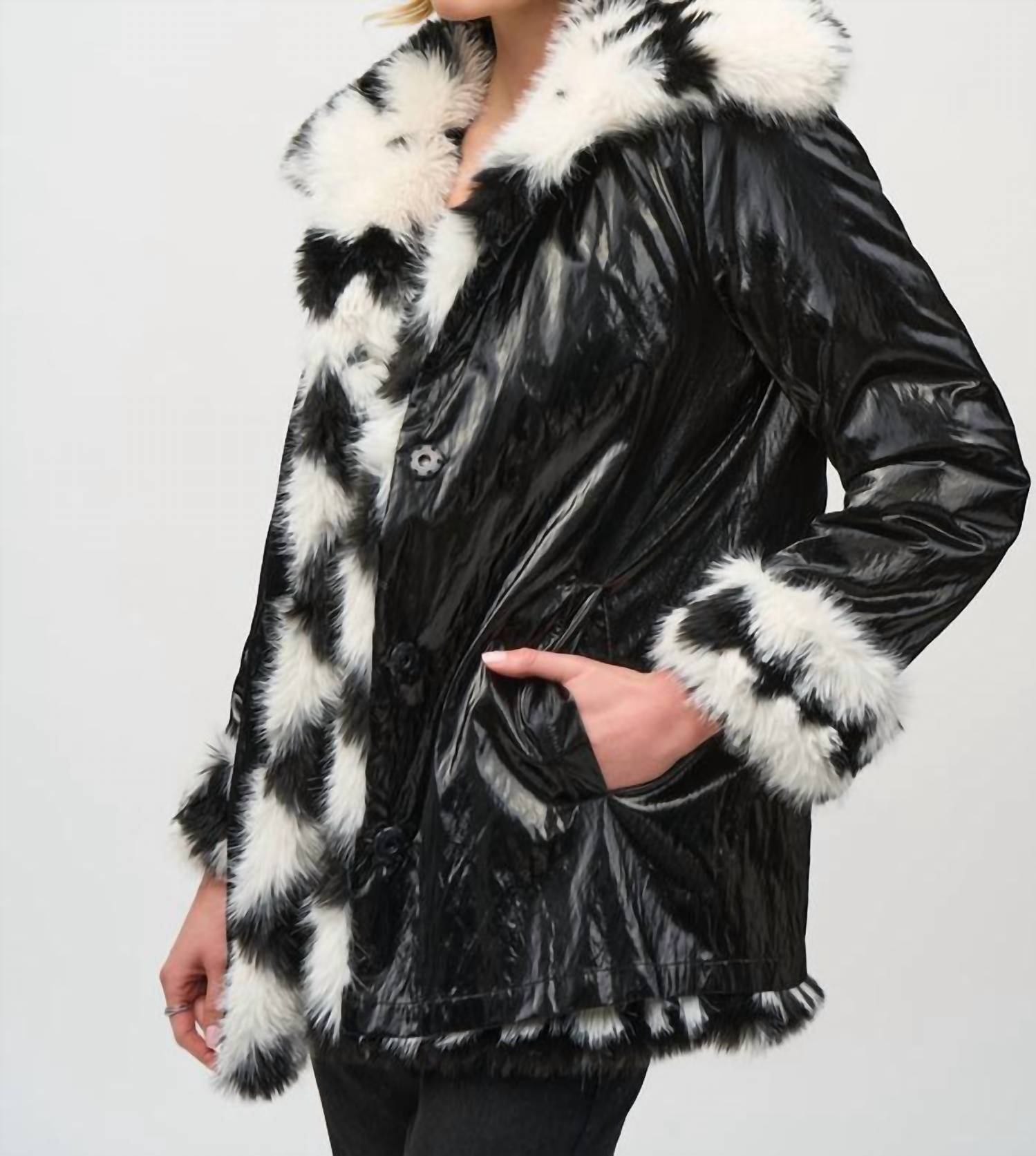 Reversible design for versatile styling. Plush faux fur on one side, black and white geometric print on the other. Functional pockets for practicality. Buttoned closure for a polished look. Compact, sleek design for a modern silhouette. Blends avant-garde style with classic French sophistication.