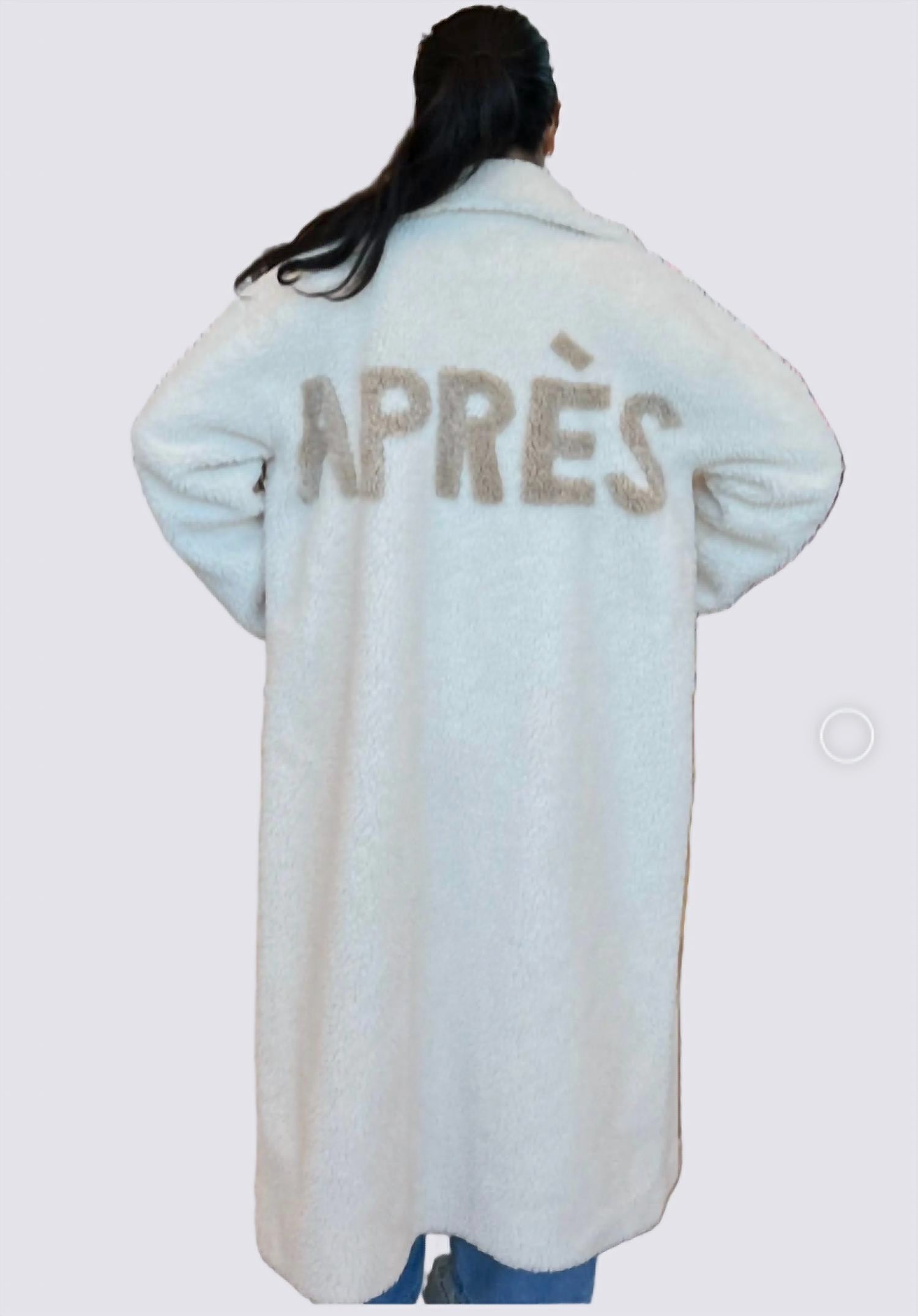 Downright adorable and so comfortable you won't want to take it off. This teddy jacket is a fan favorite. Introducing the Ajax Coat in elegant Vanilla. A must-have for every cool girl. Crafted from luxurious faux shearling with an oversized collar. Features The Après logo on the back that adds a chic and playful touch, while generous cozy pockets make this a practical choice. As seen on the streets of Aspen by influencers and celebrities, this best seller will transport you to the world of global goddesses. Made from 100% Faux Shearling Inside clips for hidden closure Gentle Machine wash True to size.