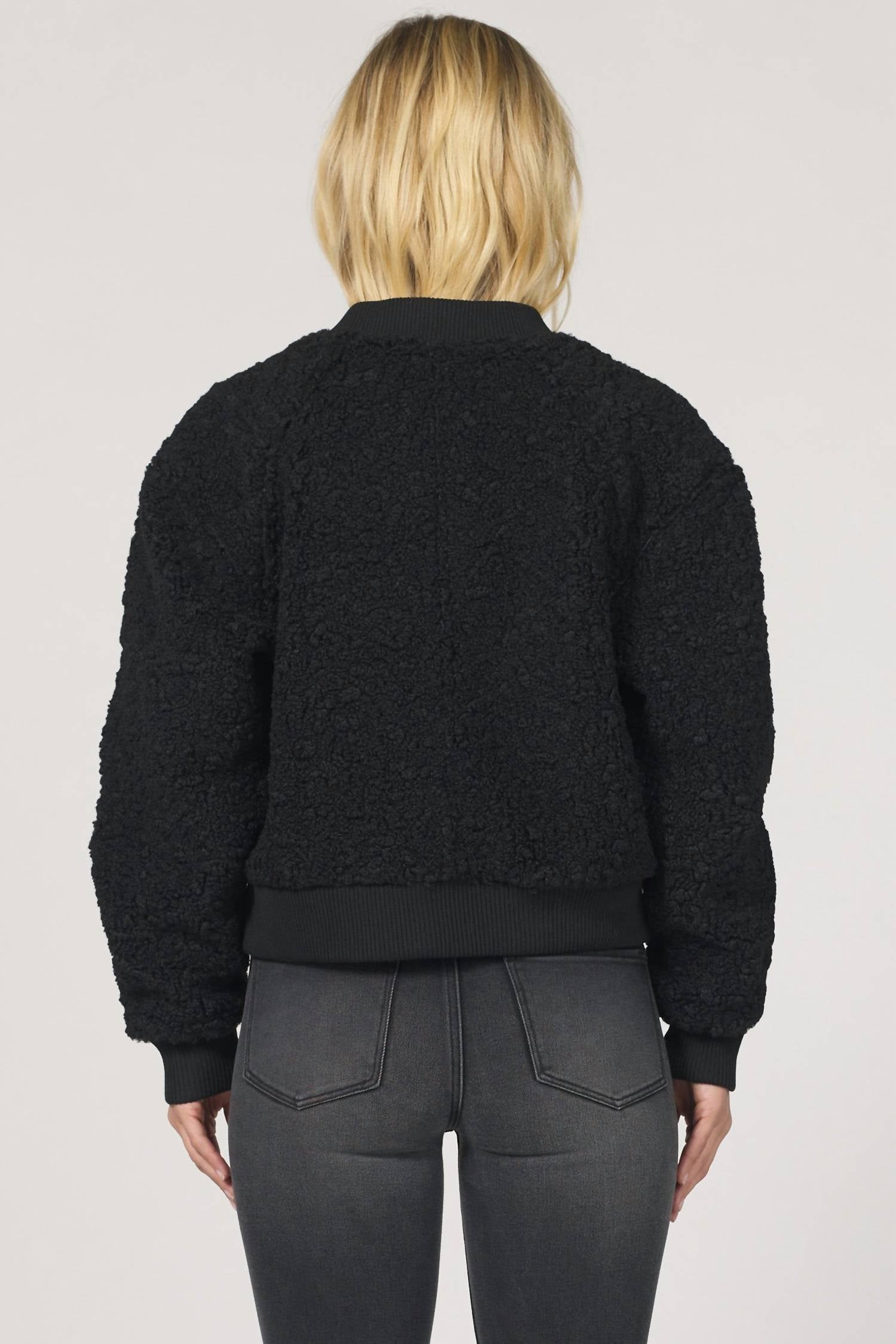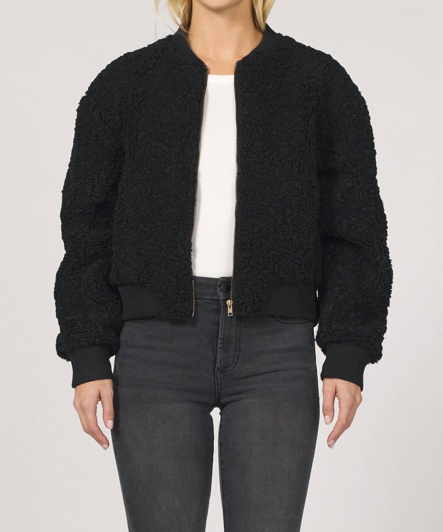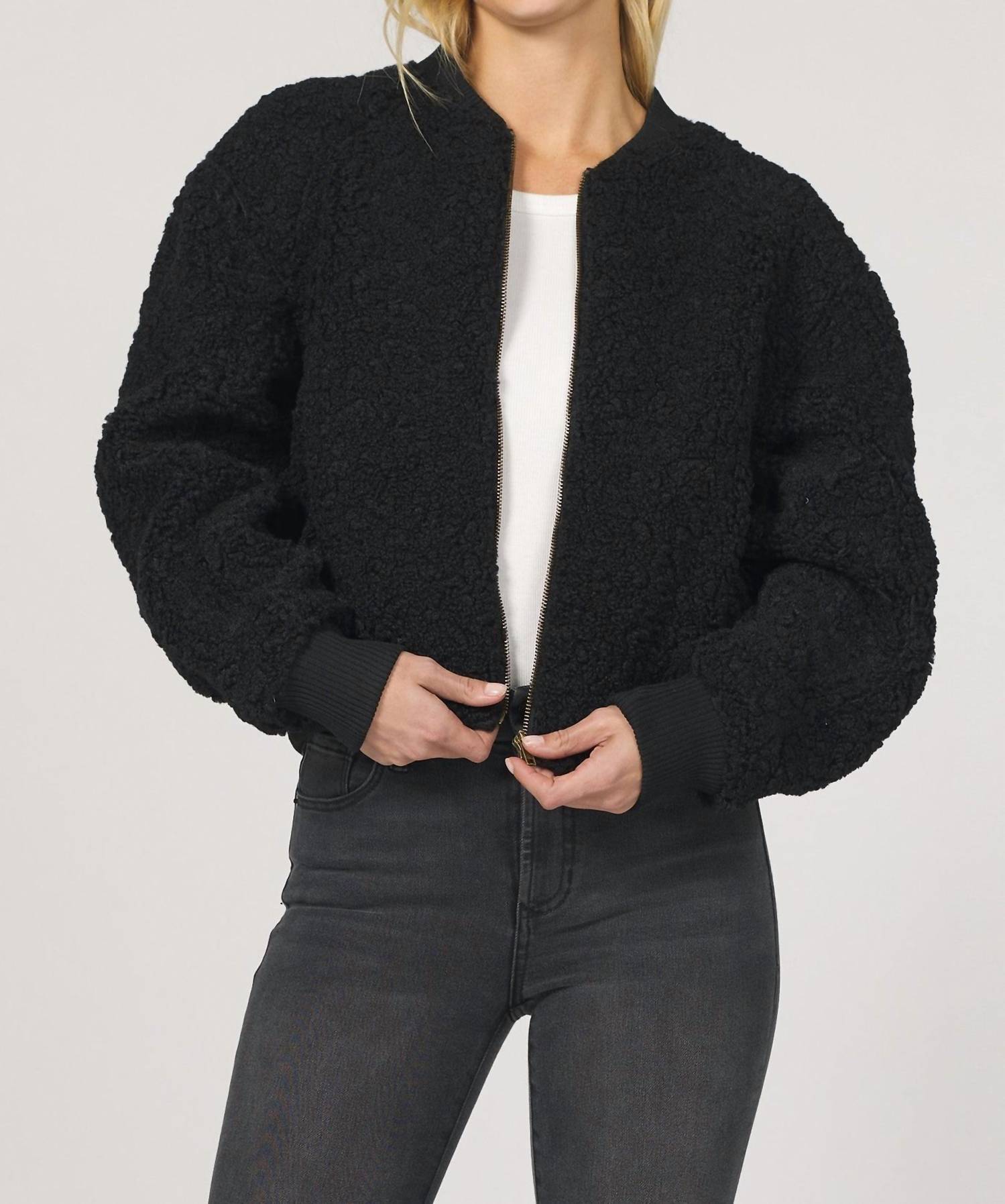 Bundle up in this adorable teddy jacket that'll have you wishing for colder temps. Embrace cozy elegance with the "How Deep" Jacket by DEAR JOHN DENIM, crafted for the winter season with long sleeves and a crewneck design. This stylish women's black jacket, made from 95% Polyester and 5% Spandex, features a textured fuzzy material for warmth and comfort. It is designed with a front zip closure and front pockets, with an elastic wrist and hip area for a snug fit. Care: Machine wash cold, gentle cycle with like colors; hang dry to avoid shrinkage, warm iron if needed, do not bleach or dry clean. Model is wearing a size small with a true-to-size fit.