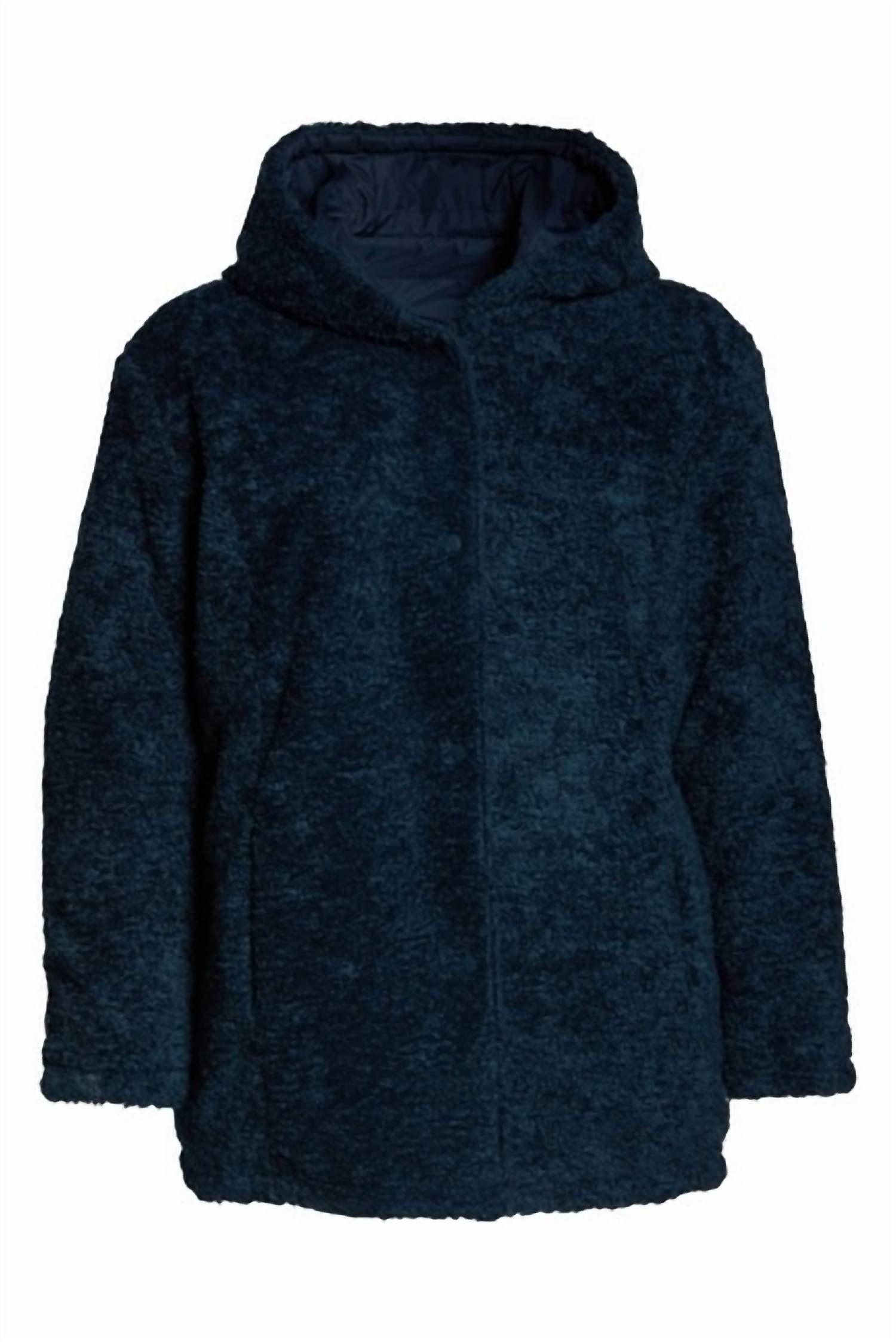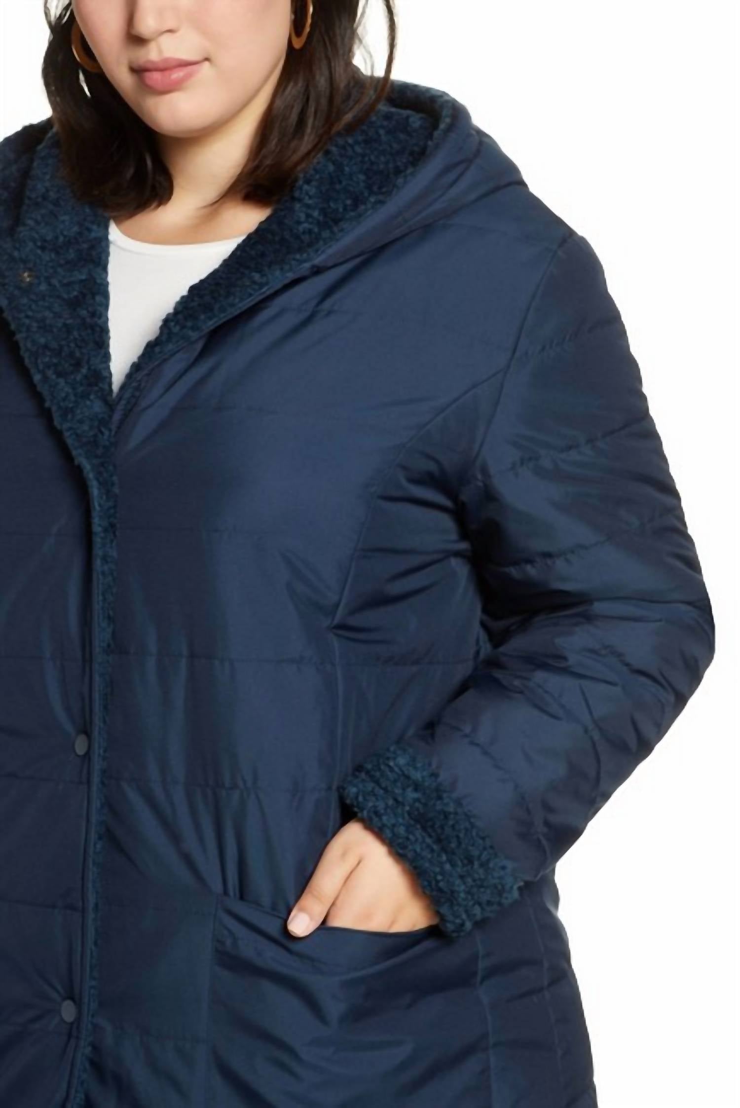 Colder weather means jacket season and we are loving everything about this timeless teddy jacket. HALOGEN Reversible Faux Fur Navy Blue Plus Size Coat Change up your chilly-weather look in this hooded coat featuring sleek channel quilting on one side and chic faux fur on the other. Front snap closure Attached hood Front patch pockets 100% polyester with 81% acrylic, 19% polyester faux-fur reverse Dry clean Length 33"
