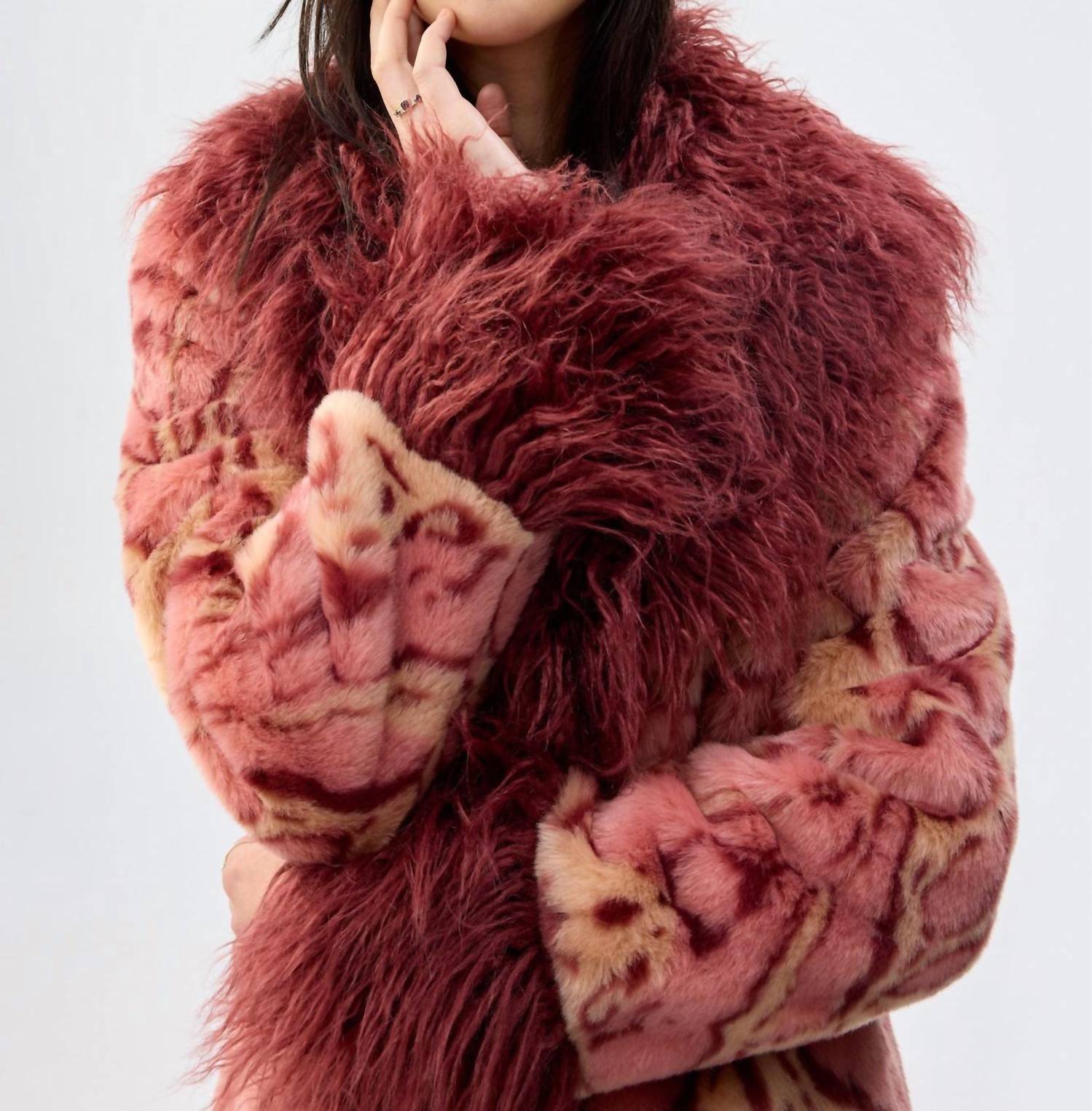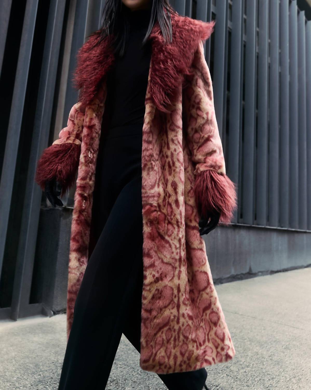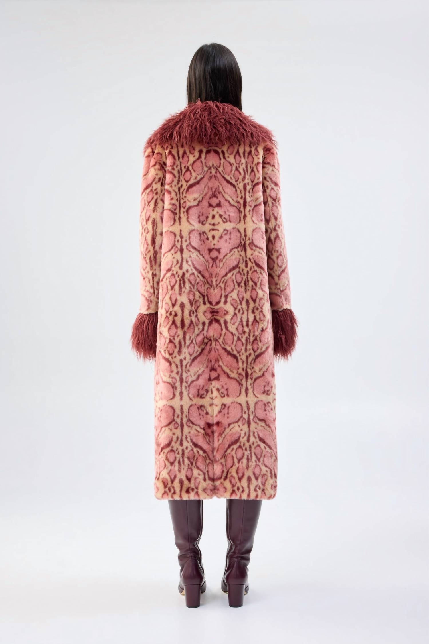 Bundle up in this adorable teddy jacket that'll have you wishing for colder temps. Introducing the Cuvée Rose Coat by Unreal Fur, a statement piece that masterfully blends artistry with utility. This women's coat features long sleeves and is crafted from luxurious jacquard faux fur with striking contrast shearling, perfectly embodying a textured and opulent silhouette. The coat is a pull-on design adorned with custom snake outline artwork, making it an ideal choice for engagement occasions and New Year's Eve festivities. Care instructions recommend professional dry cleaning only; avoid ironing for best maintenance. Model is 177cm tall and wears a size S, ensuring the fit is true to size.