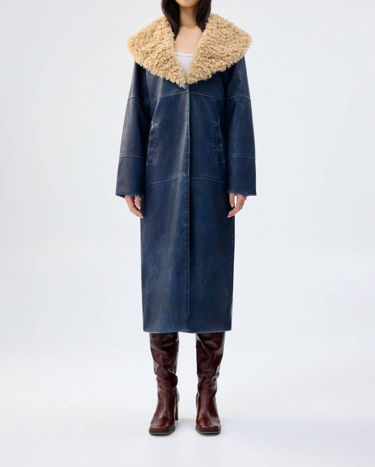 Bundle up in this adorable teddy jacket that'll have you wishing for colder temps. Introducing the Imagination Faux Fur Coat by Unreal Fur, a statement piece ideal for winter soirées. This women's teddy jacket in navy features long sleeves and a striking crewneck design. Its composition blends polyurethane and faux shearling for a textured, maximalist trend. Closure: Button closure. Pockets: Welt pockets. Care: Dry clean only. Perfect for a New Year's Eve dinner party.