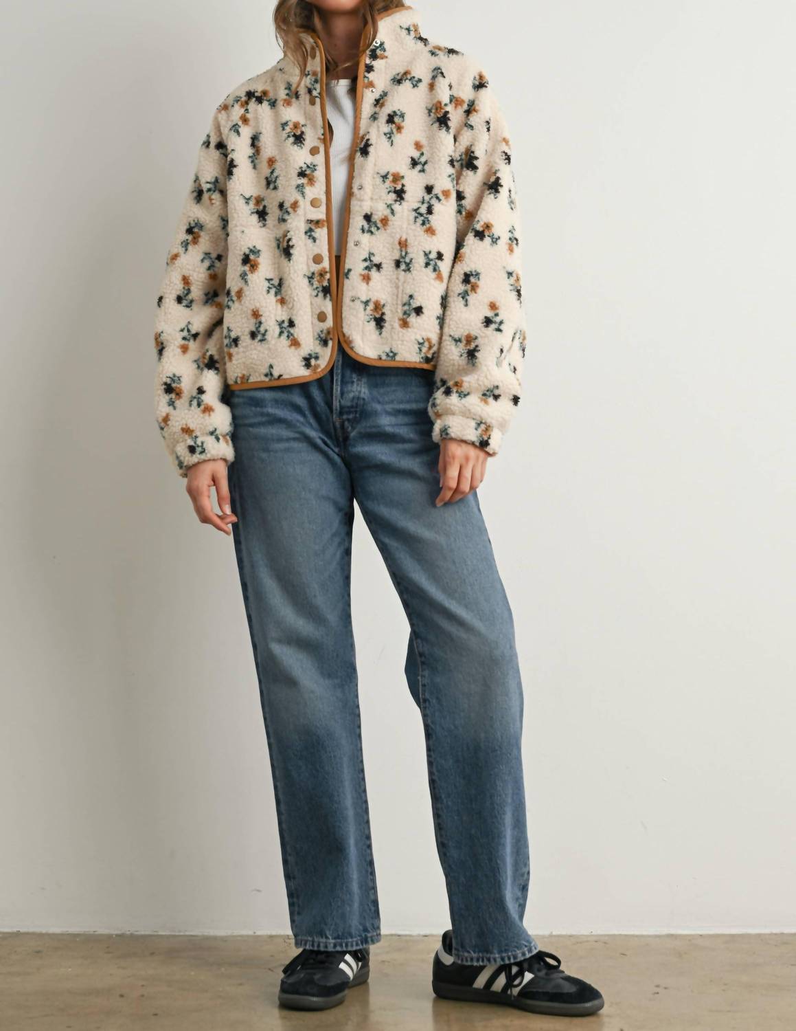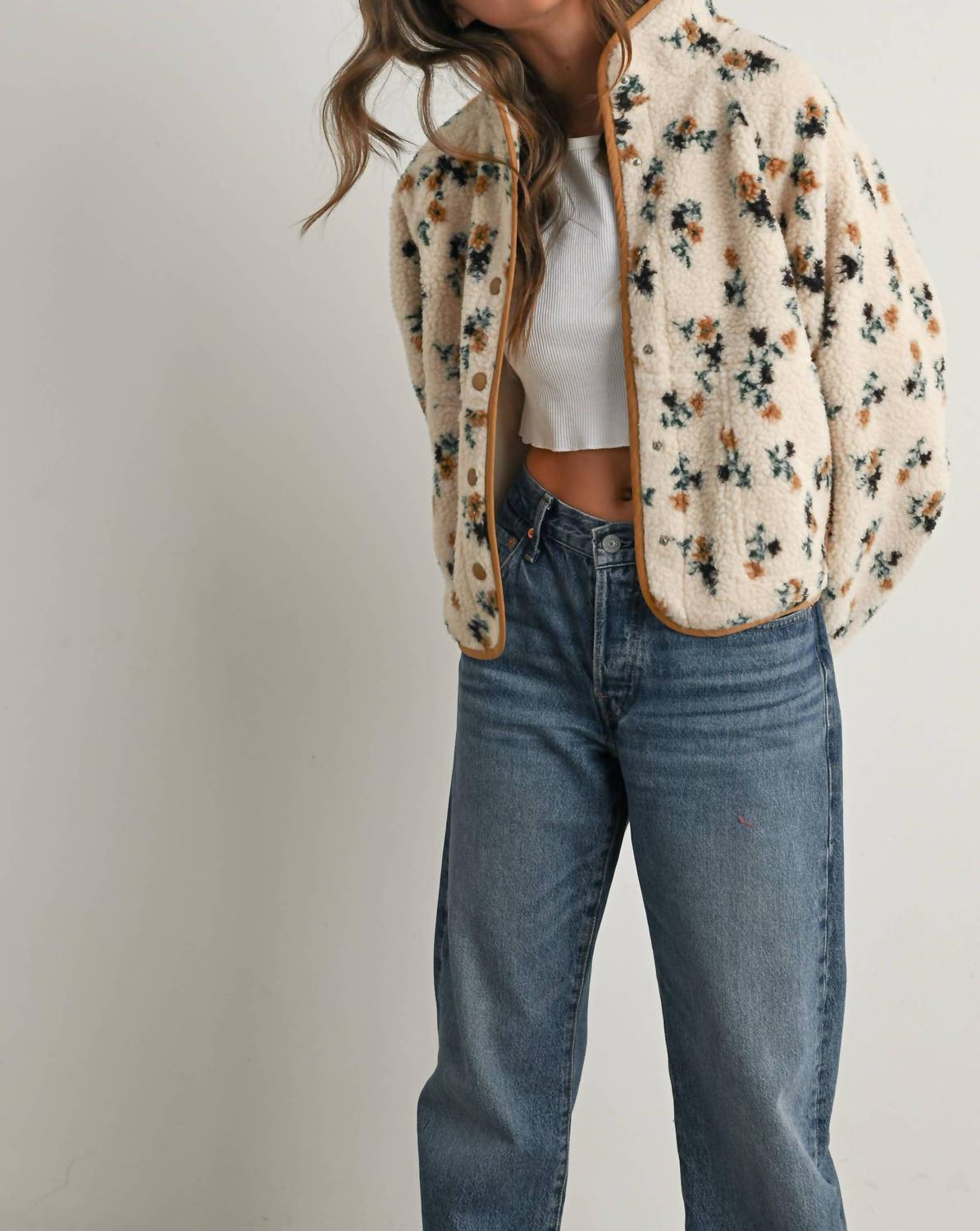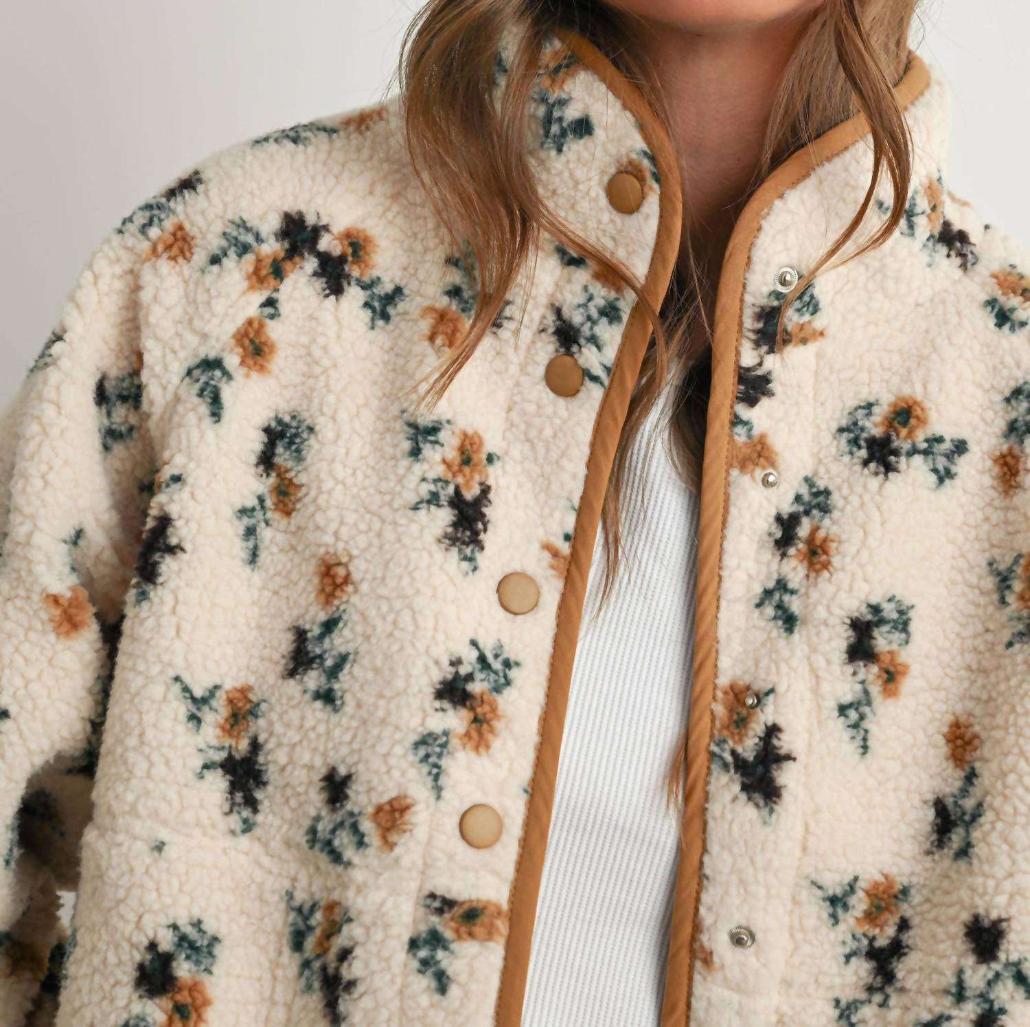 Colder weather means jacket season and we are loving everything about this timeless teddy jacket. Introducing the Floral Print Fluffy Fleece Jacket by Waverly Grey, a delightful addition to your fall wardrobe. This women’s jacket features a long sleeve design with a plush fleece fabric that exudes comfort and warmth. The vibrant floral pattern in cream and khaki is perfect for adding a boho chic touch to any casual or travel outfit. Closure: Pull on. Care: Dry clean only. Ideal for Thanksgiving or any chilly day.