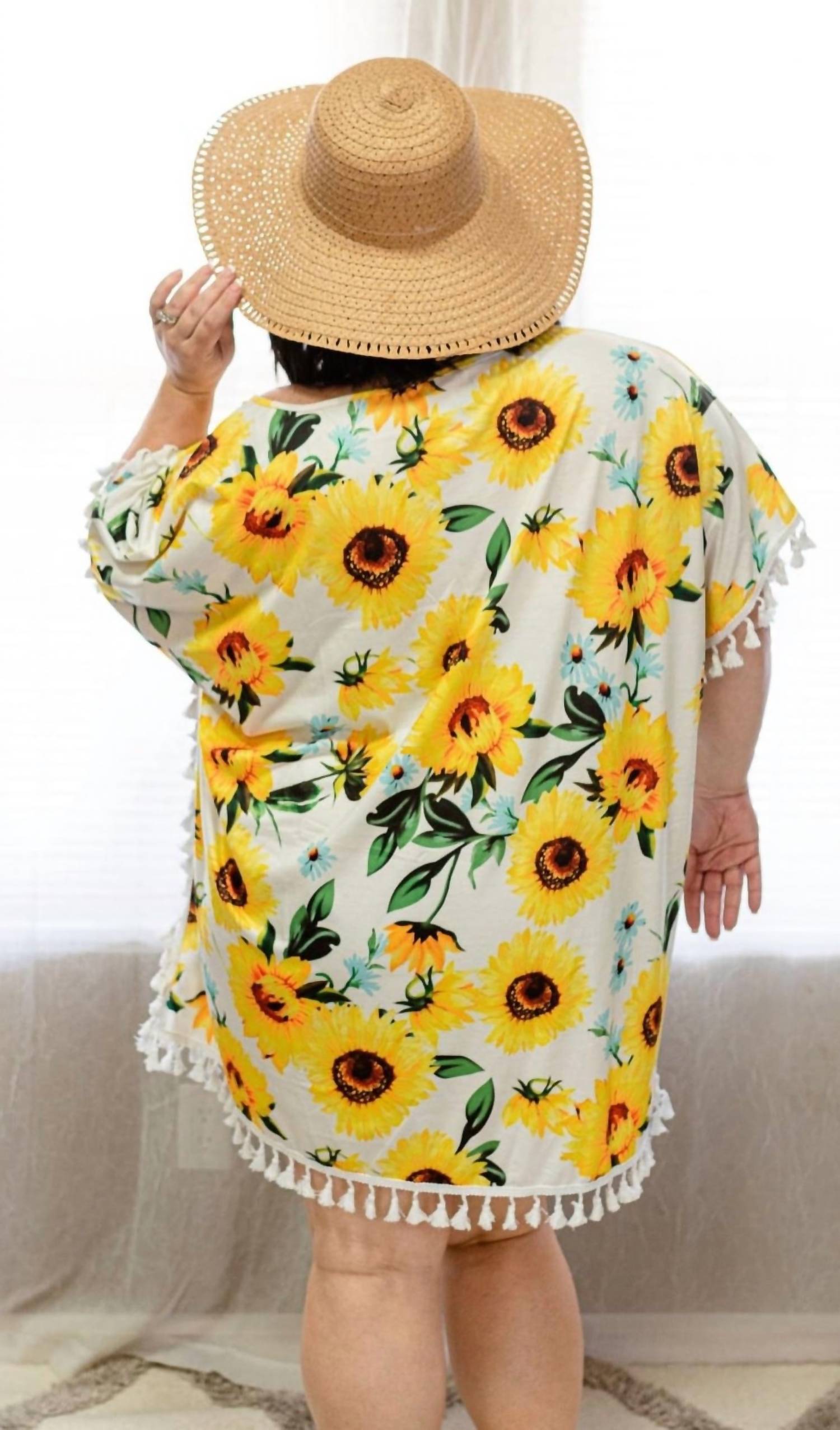 Look no further, you just found your perfect tee! Embrace a touch of Boho Chic in a vibrant yellow with a floral pattern. Crafted from a soft blend of 75% polyester, 20% cotton, and 5% spandex. Creating a soft and stretchy fabric that's both comfortable and stylish. Designed with a fringe detail and an oversized caftan silhouette. Measures 33" in length, ideal for versatile styling as a top or cover-up. With a pull-on closure and a crewneck. Care is simple with options for hand washing or dry cleaning.