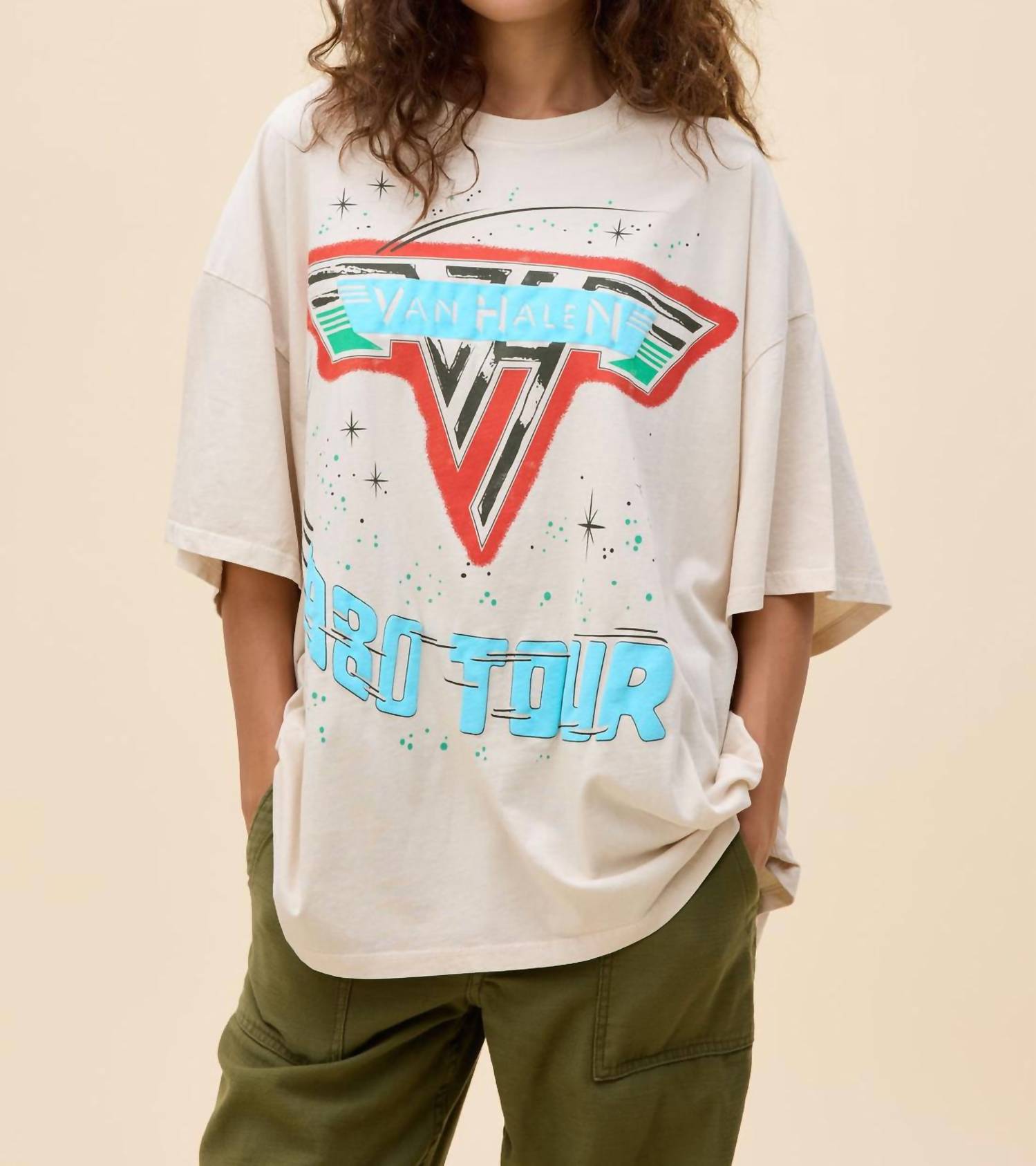 This classic, short sleeve tee will be your go-to staple this season and beyond. Celebrate the legacy of Van Halen with the DAYDREAMER Van Halen 1980 Tour Tee in Dirty White. This women's t-shirt features short sleeves and a graphic design, capturing a vintage feel perfect for music festivals or casual outings. Crafted from 100% cotton, this oversized tee has an open neckline and dropped shoulders, offering a flattering fit for all. Closure: Pull on. Care: Hand wash cold, lay flat to dry.