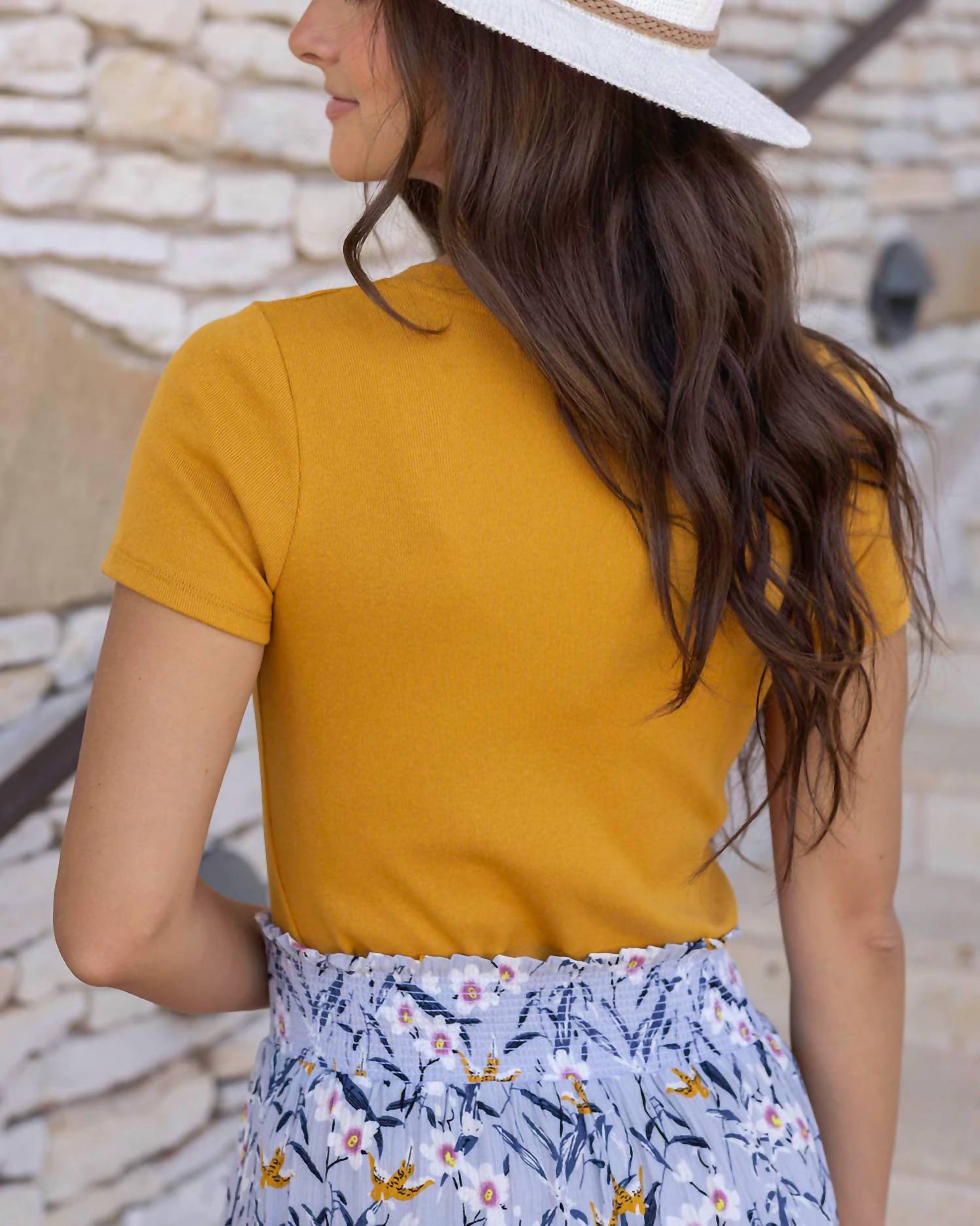 The short sleeve tee you'll want in every color. Introducing the Mustard Cotton Baby Tee by Grace and Lace, a stylish essential for your everyday wardrobe. This short sleeve tee features a flattering crew neckline and a comfortable, fitted design, perfect for versatile layering. Crafted from a soft and stretchy blend of 50% cotton and 50% polyester, it's designed to keep you comfortable throughout the day. Closure: Pull-on style for effortless wear.