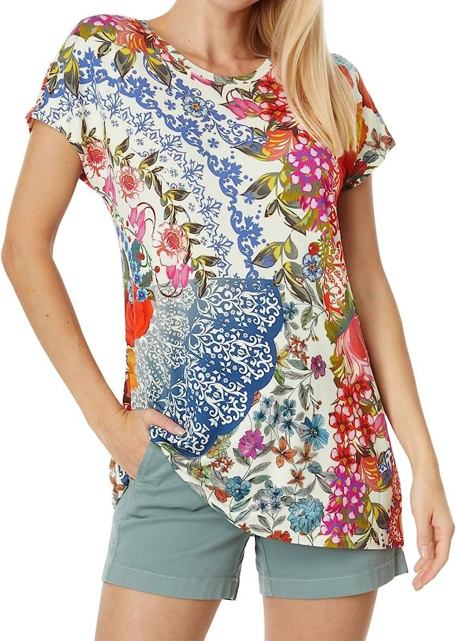 95% Rayon 5% Spandex. Comfortable A-line cut tunic top. Multi-patterned. Short sleeve. Pull on. Measurements for size Medium: Bust - 37 1/2", Length - 30".