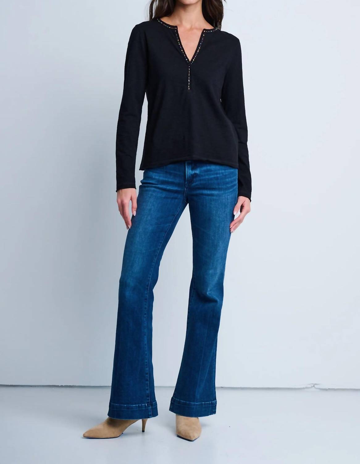Introducing the XO Long Sleeve Tee by LISA TODD, a stylish blend of comfort and playful charm in solid black. This tee features long sleeves and a soft split V-neck, adorned with rainbow embroidery at the neckline and placket. Composed of 100% cotton, it offers a relaxed fit with petite snap closures for added flair. Designed for effortless travel attire, perfect for minimalists celebrating Thanksgiving. Model is 5’9” and is wearing a size small.
